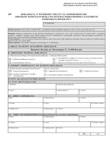 Załącznik Nr 1 do Uchwały Nr XLVII/339/2014 Rady Miejskiej w Brzesku z dnia 26 marca 2014r DŚ DEKLARACJA O WYSOKOŚCI OPŁATY ZA GOSPODAROWANIE ODPADAMI KOMUNALNYMI DLA WŁAŚCICIELI NIERUCHOMOŚCI, NA KTÓRYCH ZAMIESZKUJĄ MIESZKAŃCY 1. Nr dokumentu Podstawa prawna: Ustawa z dnia 13 września 1996 r. o utrzymaniu czystości i porządku w gminach (t.j. Dz.U. z 2013 r., poz.1399 z póź. zm.) Składający: deklaracja przeznaczona jest dla właścicieli nieruchomości w rozumieniu art. 2 ust. 1 pkt. 4 ustawy z dnia 13 września 1996 r. o utrzymaniu czystości i porządku w gminach, przez których rozumie się także współwłaścicieli, użytkowników wieczystych, osoby posiadające nieruchomości w użytkowaniu, a także inne podmioty władające nieruchomością. Termin składania: 14 dni od zaistnienia okoliczności mających wpływ na powstanie, bądź wygaśnięcie obowiązku wniesienia opłaty lub zaistnienia zdarzeń mających wpływ na wysokość opłaty. Miejsce składania: Urząd Miejski w Brzesku, ul. Głowackiego 51, 32-800 Brzesko A. ORGAN WŁAŚCIWY DO ZŁOŻENIA DEKLARACJI Burmistrz Brzeska, ul. Głowackiego 51, 32-800 Brzesko B. OBOWIĄZEK ZŁOŻENIA DEKLARACJI 2. Okoliczności powodujące obowiązek złożenia deklaracji /zaznaczyć właściwe pole/ 2. nowa deklaracja w związku z art. 6 m ust. 2 ustawy o utrzymaniu czystości 1. deklaracja składana po raz pierwszy i porządku w gminach 1) (od m-ca………………….) 3. korekta deklaracji (od m-ca………………….) 4. wygaśnięcie obowiązku uiszczenia opłaty śmieciowej (od m-ca………….) C. PODMIOT ZOBOWIĄZANY DO ZŁOŻENIA DEKLARACJI 3. Rodzaj własności, posiadania nieruchomości /zaznaczyć właściwe pole/ 1. właściciel nieruchomości 2. współwłaściciel nieruchomości 4. posiadacz nieruchomość w zarządzie lub użytkowaniu 5. inny podmiot władający nieruchomością 3. użytkownik wieczysty D. DANE SKŁADAJĄCEGO DEKLARACJĘ D.1. DANE IDENTYFIKACYJNE 4. Nazwisko 5. Pierwsze imię, drugie imię 6. Pesel 2) 7. Numer telefonu 3) 8. e-mail 4) D.2. ADRES ZAMIESZKANIA 9. Kraj 10. Województwo 12. Gmina 13. Ulica 15. Miejscowość 16. Kod pocztowy 11. Powiat 14. Nr domu / lokalu 17. Poczta D.3. ADRES DO KORESPONDENCJI (podać jeżeli jest inny, niż adres zamieszkania) 18. Kraj 19. Województwo 21. Gmina 22. Ulica 24. Miejscowość 25. Kod pocztowy 20. Powiat 23. Nr domu / lokalu 26. Poczta DŚ (2 ) 1/3 E. ADRES NIERUCHOMOŚCI, NA KTÓREJ POWSTAJĄ ODPADY KOMUNALNE (podać jeżeli jest inny, niż adres zamieszkania) 27. Miejscowość 29. Nr domu / lokalu 28. Ulica 30. Kod pocztowy 31. Poczta F. OBLICZENIE OPŁATY F.1. PODSTAWA NALICZANIA OPŁATY 5) ilość osób w gospodarstwie domowym Stawka w zł(wg pkt 6 objaśnienia) 32. 33. G. PODPIS SKŁADAJĄCEGO DEKLARACJĘ / OSOBY REPREZENTUJĄCEJ SKŁADAJĄCEGO DEKLARACJĘ 34. Imię 35. Nazwisko 36. Data wypełnienia deklaracji (dzień-miesiąc-rok) 37. Podpis składającego deklarację / pełnomocnika I. ADNOTACJE ORGANU Adnotacja księgowości Nr dowodu księgowego:..................................... 38. Data (dzień/miesiąc/rok) 39. Podpis przyjmującego deklarację Objaśnienia do deklaracji. 1) W przypadku zmiany danych będących podstawą ustalenia wysokości należnej opłaty za gospodarowanie odpadami komunalnymi, właściciel jest obowiązany złożyć nową deklarację w terminie 14 dni od dnia nastąpienia zmiany. Opłatę za gospodarowanie odpadami komunalnymi w zmienionej wysokości uiszcza się za miesiąc w którym nastąpiła zmiana. 2) Fakultatywnie 3) Fakultatywnie 4) Fakultatywnie 5) Dla każdego gospodarstwa domowego należy złożyć odrębną deklarację Tabela miesięcznych stawek opłat od gospodarstwa domowego: 6) Lp. Wielkość gospodarstwa Odpady zbierane w sposób selektywny Odpady zbierane w sposób nieselektywny 1. 1 - osobowe 14,00 21,00 2. 2 - osobowe 20,00 30,00 3. 3 - osobowe 27,00 40,00 4. 4 - osobowe 34,00 51,00 5. 5 - osobowe 40,00 60,00 6. 6 - osobowe 45,00 67,00 7. 7 - osobowe i powyżej 50,00 75,00 DŚ (2 ) 2/3 POUCZENIE W przypadku niewpłacenia w obowiązujących terminach kwoty należnej opłaty lub wpłacenia jej w niepełnej wysokości, niniejsza deklaracja stanowi podstawę do wystawienia tytułu wykonawczego zgodnie z przepisami ustawy z dnia 17 czerwca 1996r o postępowaniu egzekucyjnym w administracji /t.j.: Dz.U. z 2013r poz. 1399 z póź. zm./ Właściciel nieruchomości jest obowiązany złożyć do Burmistrza Brzeska deklarację o wysokości opłaty za gospodarowanie odpadami komunalnymi w terminie 14 dni od dnia zamieszkania na danej nieruchomości pierwszego mieszkańca lub powstania na danej nieruchomości odpadów komunalnych. W razie niezłożenia deklaracji o wysokości opłaty za gospodarowanie odpadami komunalnymi albo powzięcia uzasadnionych wątpliwości co do danych zawartych w deklaracji organ przyjmujący deklarację określa, w drodze decyzji, wysokość opłaty za gospodarowanie odpadami komunalnymi, biorąc pod uwagę uzasadnione szacunki, w tym średnią ilość odpadów komunalnych powstających na nieruchomościach o podobnym charakterze. Sposób gospodarowania odpadami komunalnymi będzie podlegał bieżącej kontroli. W przypadku nie wywiązywania się z obowiązku selektywnego zbierania odpadów komunalnych Burmistrz Brzeska w drodze decyzji naliczy opłatę za odbiór odpadów zmieszanych wraz z odsetkami za zwłokę. Obliczoną w deklaracji miesięczną opłatę za gospodarowanie odpadami komunalnymi należy wpłacać w terminie do dnia 25-tego każdego miesiąca na wskazany rachunek bankowy. DŚ (2 ) 3/3
