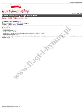 Informacje o produkcie Utworzono 07-03-2017 Sudan Południowy Flaga 90x150 cm Cena : 22,90 PLN (netto: 18,62 PLN) Nr katalogowy : 100000378 Stan magazynowy : brak w magazynie Średnia ocena : brak recenzji w w w .fl ag ii- hy m ny .p l 90 cm x 150 cm - 100% poliester - Prać w temperaturze 30 ° C - Wysoka jakość i stabilność - Zabezpieczony na krawedziach podwójnym szwem wzmocniony od strony masztu - Odporne na promieniowanie UV - Po bokach dwa metalowe oczka do wieszania, mozliwość zamówienia z karabinczykiem, lub tunelem na drzewiec (dopłata za wykonanie flagi z tunelem na drzewiec wynosi 2 zł) Wygenerowano w programie www.oscGold.com