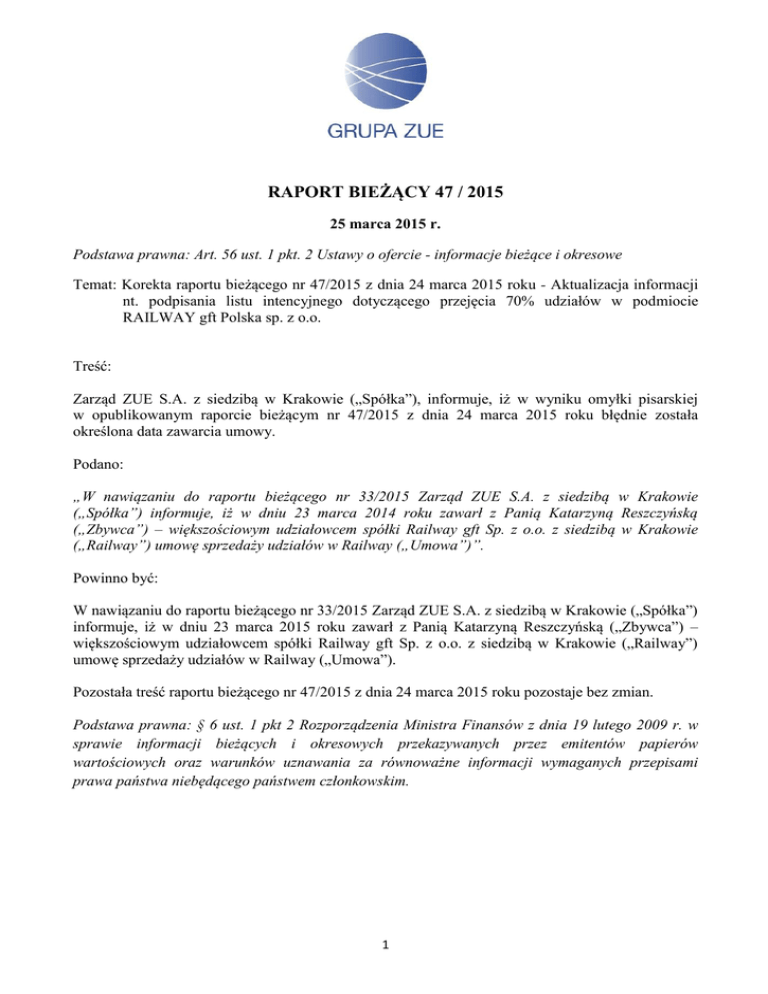 RAPORT BIEŻĄCY 47 / 2015 25 marca 2015 r. Podstawa prawna: Art. 56 ust. 1 pkt. 2 Ustawy o ofercie - informacje bieżące i okresowe Temat: Korekta raportu bieżącego nr 47/2015 z dnia 24 marca 2015 roku - Aktualizacja informacji nt. podpisania listu intencyjnego dotyczącego przejęcia 70% udziałów w podmiocie RAILWAY gft Polska sp. z o.o. Treść: Zarząd ZUE S.A. z siedzibą w Krakowie („Spółka”), informuje, iż w wyniku omyłki pisarskiej w opublikowanym raporcie bieżącym nr 47/2015 z dnia 24 marca 2015 roku błędnie została określona data zawarcia umowy. Podano: „W nawiązaniu do raportu bieżącego nr 33/2015 Zarząd ZUE S.A. z siedzibą w Krakowie („Spółka”) informuje, iż w dniu 23 marca 2014 roku zawarł z Panią Katarzyną Reszczyńską („Zbywca”) – większościowym udziałowcem spółki Railway gft Sp. z o.o. z siedzibą w Krakowie („Railway”) umowę sprzedaży udziałów w Railway („Umowa”)”. Powinno być: W nawiązaniu do raportu bieżącego nr 33/2015 Zarząd ZUE S.A. z siedzibą w Krakowie („Spółka”) informuje, iż w dniu 23 marca 2015 roku zawarł z Panią Katarzyną Reszczyńską („Zbywca”) – większościowym udziałowcem spółki Railway gft Sp. z o.o. z siedzibą w Krakowie („Railway”) umowę sprzedaży udziałów w Railway („Umowa”). Pozostała treść raportu bieżącego nr 47/2015 z dnia 24 marca 2015 roku pozostaje bez zmian. Podstawa prawna: § 6 ust. 1 pkt 2 Rozporządzenia Ministra Finansów z dnia 19 lutego 2009 r. w sprawie informacji bieżących i okresowych przekazywanych przez emitentów papierów wartościowych oraz warunków uznawania za równoważne informacji wymaganych przepisami prawa państwa niebędącego państwem członkowskim. 1