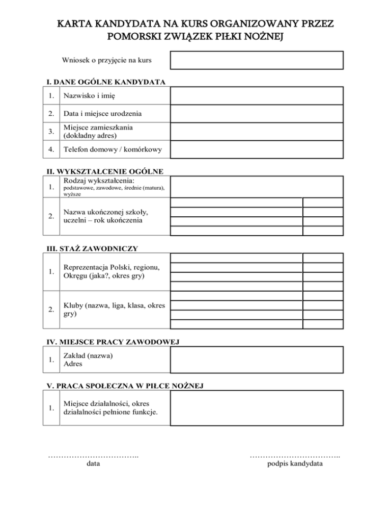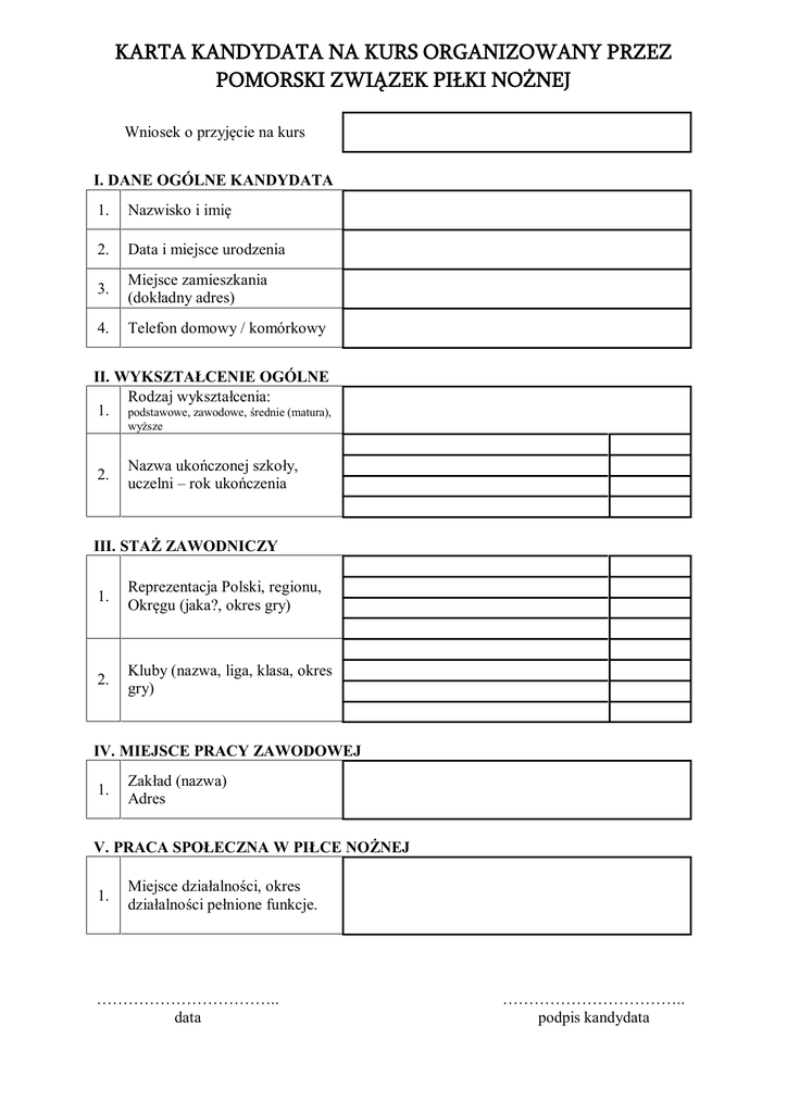 KARTA KANDYDATA NA KURS ORGANIZOWANY PRZEZ POMORSKI ZWIĄZEK PIŁKI NOŻNEJ Wniosek o przyjęcie na kurs I. DANE OGÓLNE KANDYDATA 1. Nazwisko i imię 2. Data i miejsce urodzenia 3. Miejsce zamieszkania (dokładny adres) 4. Telefon domowy / komórkowy II. WYKSZTAŁCENIE OGÓLNE Rodzaj wykształcenia: 1. podstawowe, zawodowe, średnie (matura), wyższe 2. Nazwa ukończonej szkoły, uczelni – rok ukończenia III. STAŻ ZAWODNICZY 1. Reprezentacja Polski, regionu, Okręgu (jaka?, okres gry) 2. Kluby (nazwa, liga, klasa, okres gry) IV. MIEJSCE PRACY ZAWODOWEJ 1. Zakład (nazwa) Adres V. PRACA SPOŁECZNA W PIŁCE NOŻNEJ 1. Miejsce działalności, okres działalności pełnione funkcje. …………………………….. data …………………………….. podpis kandydata