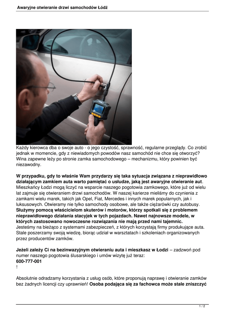 Awaryjne otwieranie drzwi samochodów Łódź Każdy kierowca dba o swoje auto - o jego czystość, sprawność, regularne przeglądy. Co zrobić jednak w momencie, gdy z niewiadomych powodów nasz samochód nie chce się otworzyć? Wina zapewne leży po stronie zamka samochodowego – mechanizmu, który powinien być niezawodny. W przypadku, gdy to właśnie Wam przydarzy się taka sytuacja związana z nieprawidłowo działającym zamkiem auta warto pamiętać o usłudze, jaką jest awaryjne otwieranie aut. Mieszkańcy Łodzi mogą liczyć na wsparcie naszego pogotowia zamkowego, które już od wielu lat zajmuje się otwieraniem drzwi samochodów. W naszej karierze mieliśmy do czynienia z zamkami wielu marek, takich jak Opel, Fiat, Mercedes i innych marek popularnych, jak i luksusowych. Otwieramy nie tylko samochody osobowe, ale także ciężarówki czy autobusy. Służymy pomocą właścicielom skuterów i motorów, którzy spotkali się z problemem nieprawidłowego działania stacyjek w tych pojazdach. Nawet najnowsze modele, w których zastosowano nowoczesne rozwiązania nie mają przed nami tajemnic. Jesteśmy na bieżąco z systemami zabezpieczeń, z których korzystają firmy produkujące auta. Stale poszerzamy swoją wiedzę, biorąc udział w warsztatach i szkoleniach organizowanych przez producentów zamków. Jeżeli zależy Ci na bezinwazyjnym otwieraniu auta i mieszkasz w Łodzi – zadzwoń pod numer naszego pogotowia ślusarskiego i umów wizytę już teraz: 600-777-001 ! Absolutnie odradzamy korzystania z usług osób, które proponują naprawę i otwieranie zamków bez żadnych licencji czy uprawnień! Osoba podająca się za fachowca może stale zniszczyć 1/2 Awaryjne otwieranie drzwi samochodów Łódź zamek naszego samochodu bądź doprowadzić do zarysowań lakieru czy wgniecenia karoserii! Nie warto narażać się na tego typu sytuacje, oszczędzając zaledwie kilka złotych – oferta naszego pogotowia zamkowego w Łodzi jest na tyle atrakcyjna, że nie warto szukać konkurencyjnych ofert. Pogotowie ślusarskie w Łodzi wykonując usługę otwierania drzwi daje Państwu gwarancję bezinwazyjnego otworzenia drzwi. Nasze pogotowie ślusarskie w Łodzi zaprasza do skorzystania z usług ślusarskich. Gwarantuje my satysfakcję z wykonywanych przez nas usług. Otwieranie aut warto zostawić ekspertom – dzięki temu można uniknąć wielu niepożądanych skutków i w krótkim czasie odzyskać funkcjonalność swojego auta. Serdecznie zapraszamy do skorzystania z usług naszego pogotowia ślusarskiego w Łodzi wszystkich kierowców samochodu, którzy mają problemy z otworzeniem swojego auta. 2/2