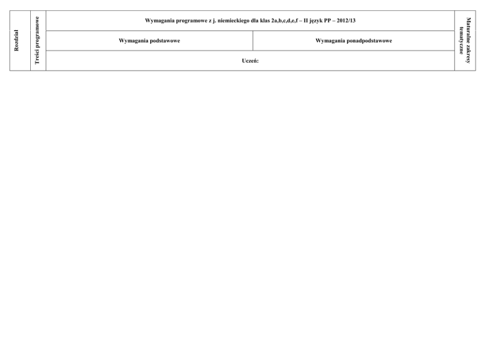 Treści programowe Rozdział Wymagania podstawowe Wymagania ponadpodstawowe Uczeń: Maturalne zakresy tematyczne Wymagania programowe z j. niemieckiego dla klas 2a,b,c,d,e,f – II język PP – 2012/13 swobodnie operuje bogatym słownictwem dotyczącym czynności, które najczęściej wykonuje się podczas wakacji szczegółowo opowiada, jak spędziły wakacje osoby przedstawione na zdjęciach podaje, które z przedstawionych w treści e-maila wakacji podobały mu się bardziej i szeroko uzasadnia swoją opinię przeprowadza z kolegą / koleżanką wywiad na temat wakacji i szczegółowo przedstawia zanotowane informacje na forum klasy w rozbudowanej wypowiedzi ustnej relacjonuje przebieg swoich wakacji i określa, czy jest z nich zadowolony umiejętnie opisuje, jak i z kim spędziły wakacje przedstawione na rysunkach osoby oraz snuje przypuszczenia, jakie są ich wrażenia z wprawą prowadzi dyskusję, przedstawiając liczne argumenty przemawiające za wakacjami z rodziną i z przyjaciółmi w formie rozbudowanej wypowiedzi ustnej opowiada o swoich wrażeniach z wakacji spędzonych z rodzicami i o zaistniałych ewentualnych konfliktach w e-mailu do koleżanki z Niemiec umiejętnie opisuje swoje wakacje i dołącza pracę do dossier w portfolio językowym rozpoznaje argumenty przemawiające za bądź przeciw spędzeniu urlopu za granicą oraz dodaje własne uwzględniając podane słownictwo, tworzy rozbudowane dialogi dotyczące zgłoszenia zagubionej rzeczy opisując kradzież portfela, szeroko relacjonuje policjantowi okoliczności zdarzenia i szczegółowo opisuje skradziony przedmiot pisze rozbudowane ogłoszenie informujące o zgubionym plecaku i dołącza pracę do dossier w portfolio językowym umiejętnie wyraża liczne przypuszczenia dotyczące interpretowania rysunku z podanej listy wybiera niezwykłe przeżycia wakacyjne i szeroko uzasadnia swój wybór wykorzystując podane słownictwo, przeprowadza rozbudowany dialog dotyczący przygody wakacyjnej szczegółowo opowiada o przygodzie wakacyjnej przedstawionej na rysunku oraz o swoim ciekawym zdarzeniu z wakacji wykorzystując podane słownictwo, szczegółowo opowiada historię, którą można zatytułować „Głupio wyszło!” pisze do kolegi z Niemiec list, w którym szczegółowo opisuje ciekawą przygodę wakacyjną, reakcję swoją i innych osób oraz pyta o jego zabawne przeżycia, a pracę dołącza do dossier w portfolio językowym prawidłowo tworzy rzeczowniki od podanych czasowników formułuje rozbudowane reakcje językowe w przedstawionych sytuacjach wykorzystując sugerowane czasowniki, wyraża w inny sposób sens podanych zdań wykonuje plakat, album lub stronę internetową mające zachęcić turystów do spędzenia wakacji w prezentowanym miejscu i prezentuje pracę w klasie swobodnie prezentuje materiał stymulujący, umiejętnie używając różnorodnych zwrotów pomocnych w jego opisywaniu i szczegółowo odpowiada na pytania podczas wypowiedzi prawidłowo realizuje samogłoskę nosową n sprawnie stosuje zdania z zaimkami einer, eine, ein(e)s z dopełniaczem i prawidłowo tłumaczy je na język niemiecki swobodnie posługuje się w wypowiedziach ustnych i pisemnych słownictwem zawartym w spisie Aktiver Wortschatz życie rodzinne i towarzyskie – formy spędzania czasu wolnego • praca – praca dorywcza • podróżowanie i turystyka – wycieczki, zwiedzanie Nach den Ferien • Mit wem in die Ferien? • Verloren? Gestohlen? • Selbst erlebt Kapitel 1 posługuje się podstawowym słownictwem dotyczącym czynności, które najczęściej wykonuje się podczas wakacji krótko opowiada, jak spędziły wakacje osoby przedstawione na zdjęciach wyszukuje pożądane informacje w treści wysłuchanego wywiadu / przeczytanych e-maili podaje, które z przedstawionych wakacji podobały mu się bardziej i w oparciu o schemat uzasadnia swoją opinię przeprowadza z kolegą / koleżanką wywiad na temat wakacji i krótko przedstawia uzyskane informacje na forum klasy w wypowiedzi ustnej zwięźle relacjonuje przebieg swoich wakacji i określa, czy jest z nich zadowolony na podstawie podanego słownictwa krótko opisuje, jak i z kim spędziły wakacje przedstawione na obrazkach osoby oraz jakie są ich wrażenia poprawnie rozróżnia przymiotniki o zabarwieniu pozytywnym i negatywnym wyszukuje właściwe informacje w tekstach dotyczących spędzania wakacji z rodzicami bierze udział w dyskusji, przedstawiając argumenty przemawiające za wakacjami z rodziną i za wakacjami z przyjaciółmi w formie krótkiej wypowiedzi ustnej opowiada o swoich wrażeniach z wakacji spędzonych z rodzicami, o zaistniałych ewentualnych konfliktach i z kim zamierza spędzić najbliższe wakacje pisze do koleżanki z Niemiec zwięzły e-mail o swoich wakacjach na podstawie wysłuchanej rozmowy z policjantem dopasowuje do jej treści właściwe ogłoszenie informujące o utracie danego przedmiotu po analizie ogłoszenia informującego o zgubionym przedmiocie poprawnie określa informacje znajdujące się w jego treści odpowiednio uzupełnia treść rozmowy o zgubionej torbie pytaniami policjanta poprawnie przyporządkowuje pytania i odpowiedzi w dialogu dotyczącym zgubionego przedmiotu na podstawie podanego słownictwa tworzy dialogi dotyczące zgłoszenia zagubionej rzeczy opisując kradzież portfela, krótko relacjonuje policjantowi okoliczności tego zdarzenia i szczegółowo opisuje skradziony przedmiot pisze zwięzłe ogłoszenie informujące o zgubionym plecaku krótko wyraża swoje przypuszczenia dotyczące interpretowania rysunku wyszukuje pożądane informacje w wysłuchanym / przeczytanym tekście związanym z przygodą wakacyjną z podanej listy wybiera niezwykłe przeżycia wakacyjne i zwięźle uzasadnia swój wybór na podstawie schematu przeprowadza krótki dialog dotyczący przygody wakacyjnej wybiera jedno z przeżyć wakacyjnych i przeprowadza krótkie dialogi, korzystając z podanego słownictwa zwięźle op