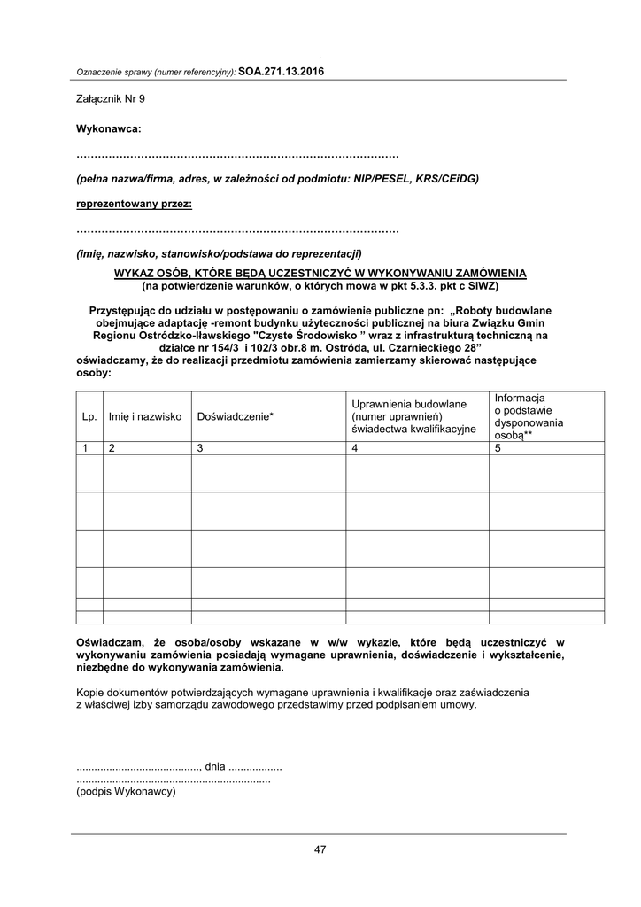 . Oznaczenie sprawy (numer referencyjny): SOA.271.13.2016 Załącznik Nr 9 Wykonawca: ……………………………………………………………………………… (pełna nazwa/firma, adres, w zależności od podmiotu: NIP/PESEL, KRS/CEiDG) reprezentowany przez: ……………………………………………………………………………… (imię, nazwisko, stanowisko/podstawa do reprezentacji) WYKAZ OSÓB, KTÓRE BĘDĄ UCZESTNICZYĆ W WYKONYWANIU ZAMÓWIENIA (na potwierdzenie warunków, o których mowa w pkt 5.3.3. pkt c SIWZ) Przystępując do udziału w postępowaniu o zamówienie publiczne pn: „Roboty budowlane obejmujące adaptację -remont budynku użyteczności publicznej na biura Związku Gmin Regionu Ostródzko-Iławskiego "Czyste Środowisko ” wraz z infrastrukturą techniczną na działce nr 154/3 i 102/3 obr.8 m. Ostróda, ul. Czarnieckiego 28” oświadczamy, że do realizacji przedmiotu zamówienia zamierzamy skierować następujące osoby: Lp. Imię i nazwisko Doświadczenie* Uprawnienia budowlane (numer uprawnień) świadectwa kwalifikacyjne 1 2 3 4 Informacja o podstawie dysponowania osobą** 5 Oświadczam, że osoba/osoby wskazane w w/w wykazie, które będą uczestniczyć w wykonywaniu zamówienia posiadają wymagane uprawnienia, doświadczenie i wykształcenie, niezbędne do wykonywania zamówienia. Kopie dokumentów potwierdzających wymagane uprawnienia i kwalifikacje oraz zaświadczenia z właściwej izby samorządu zawodowego przedstawimy przed podpisaniem umowy. ........................................., dnia .................. ................................................................. (podpis Wykonawcy) 47 . Oznaczenie sprawy (numer referencyjny): SOA.271.13.2016 * w kolumnie 3 tabeli należy wskazać doświadczenie na budowie przy zabytkach nieruchomych, zgodnie z § 24 rozporządzenia Ministra Kultury i Dziedzictwa Narodowego z dnia 27 lipca 2011 r. w sprawie prowadzenia prac konserwatorskich, prac restauratorskich, robót budowlanych, badań konserwatorskich, badań architektonicznych i innych działań przy zabytku wpisanym do rejestru zabytków oraz badań archeologicznych (Dz. U. Nr 165, poz. 987) lub przedstawić zaświadczenie o kwalifikacjach, o których mowa w § 31 ww. rozporządzenia. ** Należy podać stosunek prawny łączący Wykonawcę z daną osobą (umowa o pracę, zlecenie itp.). W przypadku osób, które będą udostępnione Wykonawcy przez podmioty trzecie w kolumnie 5 należy wpisać „zobowiązanie podmiotu trzeciego” oraz załączyć pisemne zobowiązanie tych podmiotów do oddania Wykonawcy do dyspozycji niezbędnych zasobów na okres korzystania z nich przy wykonaniu zamówienia. 48