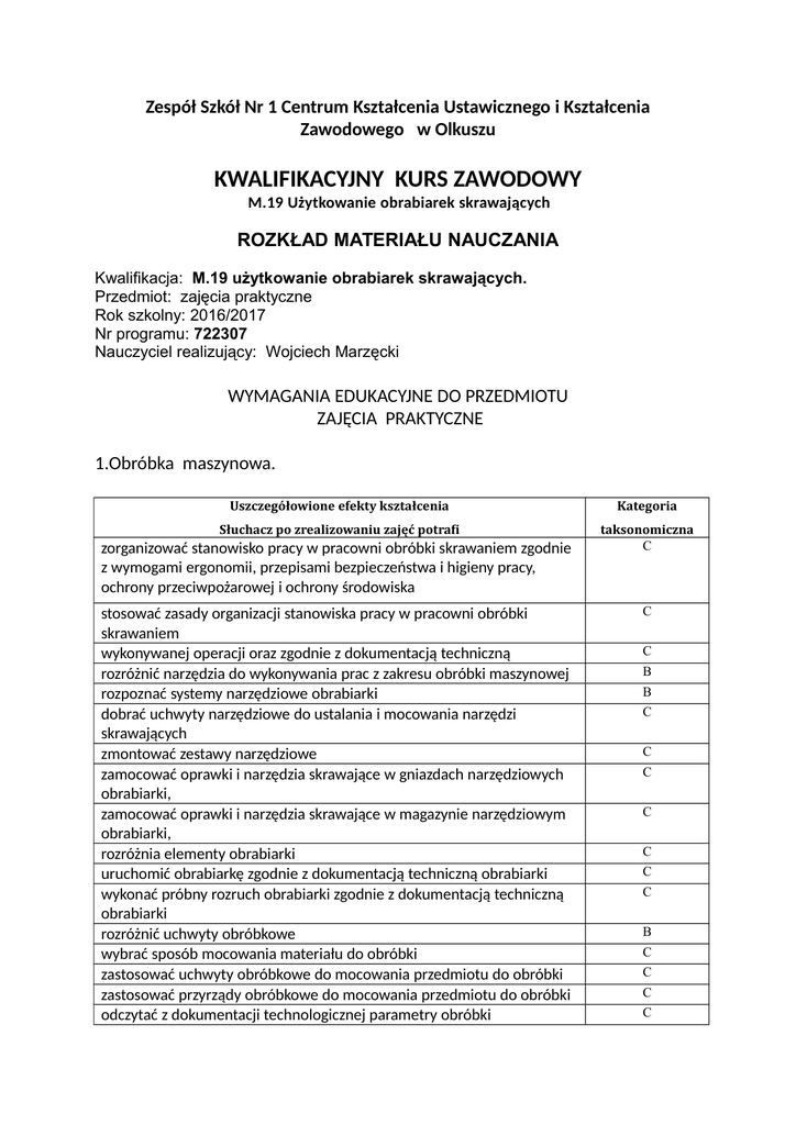 Zespół Szkół Nr 1 Centrum Kształcenia Ustawicznego i Kształcenia Zawodowego w Olkuszu KWALIFIKACYJNY KURS ZAWODOWY M.19 Użytkowanie obrabiarek skrawających ROZKŁAD MATERIAŁU NAUCZANIA Kwalifikacja: M.19 użytkowanie obrabiarek skrawających. Przedmiot: zajęcia praktyczne Rok szkolny: 2016/2017 Nr programu: 722307 Nauczyciel realizujący: Wojciech Marzęcki WYMAGANIA EDUKACYJNE DO PRZEDMIOTU ZAJĘCIA PRAKTYCZNE 1.Obróbka maszynowa. Uszczegółowione efekty kształcenia Kategoria Słuchacz po zrealizowaniu zajęć potrafi taksonomiczna C zorganizować stanowisko pracy w pracowni obróbki skrawaniem zgodnie z wymogami ergonomii, przepisami bezpieczeństwa i higieny pracy, ochrony przeciwpożarowej i ochrony środowiska stosować zasady organizacji stanowiska pracy w pracowni obróbki skrawaniem wykonywanej operacji oraz zgodnie z dokumentacją techniczną rozróżnić narzędzia do wykonywania prac z zakresu obróbki maszynowej rozpoznać systemy narzędziowe obrabiarki dobrać uchwyty narzędziowe do ustalania i mocowania narzędzi skrawających zmontować zestawy narzędziowe zamocować oprawki i narzędzia skrawające w gniazdach narzędziowych obrabiarki, zamocować oprawki i narzędzia skrawające w magazynie narzędziowym obrabiarki, rozróżnia elementy obrabiarki uruchomić obrabiarkę zgodnie z dokumentacją techniczną obrabiarki wykonać próbny rozruch obrabiarki zgodnie z dokumentacją techniczną obrabiarki rozróżnić uchwyty obróbkowe wybrać sposób mocowania materiału do obróbki zastosować uchwyty obróbkowe do mocowania przedmiotu do obróbki zastosować przyrządy obróbkowe do mocowania przedmiotu do obróbki odczytać z dokumentacji technologicznej parametry obróbki C C B B C C C C C C C B C C C C nastawić parametry obróbki dobrać z katalogów parametry obróbki dla danego zabiegu wykonać toczenie wykonać frezowanie wykonać struganie wykonać szlifowanie zorganizować stanowisko do wykonania prac z zakresu obróbki maszynowej zgodnie z przepisami bhp, ochrony przeciwpożarowej, ochrony środowiska i wymaganiami ergonomii wykonać prace z zakresu obróbki maszynowej zachowując właściwą staranność i dokładność oraz przestrzegając przepisów bhp, ochrony przeciwpożarowej i ochrony środowiska sprawdzić zgodność zaplanowanej operacji obróbki skrawaniem z dokumentacją technologiczną operacji obróbki skrawaniem z dokumentacją technologiczną nastawić parametry obróbki skrawaniem zgodnie z dokumentacją technologiczną przeprowadzić kontrolę międzyoperacyjną ocenić stan narzędzia zregenerować narzędzie dobrać narzędzie na podstawie katalogu narzędziowego zorganizować stanowisko pracy w pracowni obróbki mechanicznej zgodnie z wymogami ergonomii, przepisami bezpieczeństwa i higieny pracy, ochrony przeciwpożarowej i ochrony środowiska stosować zasady organizacji stanowiska pracy w pracowni obróbki mechanicznej. rozróżnić parametry jakościowe wyrobów wykonanych metodą obróbki maszynowej określić parametry jakościowe detalu(wyrobu)wykonanego metodą obróbki maszynowej ocenić jakość wykonanych prac z zakresu obróbki maszynowej rozróżnić narzędzia i przyrządy pomiarowe oraz sprawdziany rozróżnić pomocnicze urządzenia pomiarowe(np. liniały powierzchniowe, płyty pomiarowe, pryzmy, uchwyty do płytek wzorcowych, przyrząd kłowy) określić własności metrologiczne narzędzi i przyrządów pomiarowych dobrać przyrządy pomiarowe do wykonania pomiarów warsztatowych zorganizować stanowisko do wykonania pomiarów warsztatowych zgodnie z przepisami bhp, ochrony przeciwpożarowej, ochrony środowiska i wymaganiami ergonomii wykonać z określoną dokładnością pomiary długości przyrządami suwmiarkowymi wykonać z określoną dokładnością pomiary długości przyrządami mikrometrycznymi wykonać z określoną dokładnością pomiary długości za pomocą płytek wzorcowych C C C C C C C C C C C c C C C C C B C C C C B C C C C C wykonać z określoną dokładnością pomiary długości za pomocą przyrządów czujnikowych wykonać z określoną dokładnością pomiary kątów sprawdzić płaskość powierzchni sprawdzić wielkości szczelin i promieni zaokrągleń sprawdzić parametry geometryczne detali za pomocą sprawdzianów scharakteryzować metody pomiarowe dobrać materiały, narzędzia i urządzenia do wykonania zabezpieczenia antykorozyjnego obrabiarek zorganizować stanowisko do wykonania prac z zakresu zabezpieczenia antykorozyjnego obrabiarek zgodnie z przepisami bhp, ochrony przeciwpożarowej, ochrony środowiska i wymaganiami ergonomii wykonać zabezpieczenie antykorozyjne obrabiarek zachowując właściwą staranność i dokładność oraz przestrzegając przepisów bhp, ochrony przeciwpożarowej i ochrony środowiska dobrać materiały do konserwacji obrabiarek wykonać konserwację obrabiarek przestrzegając przepisów bhp, ochrony przeciwpożarowej, ochrony środowiska określić parametry jakościowe związane z konserwacją ocenić jakość wykonania konserwacji wymienić uszkodzone elementy narzędzia C C C C C c C C C c C C B B C