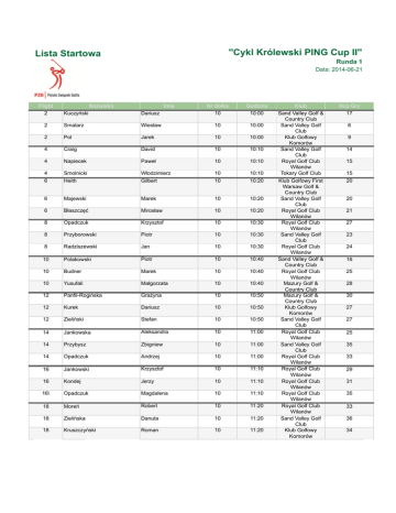 ''Cykl Królewski PING Cup II'' Lista Startowa Runda 1 Data: 2014-06-21 Flight 2 Kuczyński Nazwisko Dariusz Imię Nr dołka 10 Godzina 10:00 2 Smalarz Wiesław 10 10:00 2 Pol Jarek 10 10:00 4 Craig David 10 10:10 4 Napiecek Paweł 10 10:10 4 Smolnicki Włodzimierz 10 10:10 6 Heith Gilbert 10 10:20 6 Majewski Marek 10 10:20 6 Błaszczęć Mirosław 10 10:20 8 Opadczuk Krzysztof 10 10:30 8 Przyborowski Piotr 10 10:30 8 Radziszewski Jan 10 10:30 10 Polakowski Piotr 10 10:40 10 Budner Marek 10 10:40 10 Yusufali Małgorzata 10 10:40 12 Panfil-Rogińska Grażyna 10 10:50 12 Kurek Dariusz 10 10:50 12 Zieliński Stefan 10 10:50 14 Jankowska Aleksandra 10 11:00 14 Przybysz Zbigniew 10 11:00 14 Opadczuk Andrzej 10 11:00 16 Jankowski Krzysztof 10 11:10 16 Kondej Jerzy 10 11:10 16\ Opadczuk Magdalena 10 11:10 18 Moreń Robert 10 11:20 18 Zielińska Danuta 10 11:20 18 Kruszczyński Roman 10 11:20 Klub Sand Valley Golf & Country Club Sand Valley Golf Club Klub Golfowy Komorów Sand Valley Golf Club Royal Golf Club Wilanów Tokary Golf Club Hcp Gry 17 Klub Golfowy First Warsaw Golf & Country Club Sand Valley Golf Club Royal Golf Club Wilanów Royal Golf Club Wilanów Sand Valley Golf Club Royal Golf Club Wilanów Sand Valley Golf & Country Club Royal Golf Club Wilanów Mazury Golf & Country Club Mazury Golf & Country Club Klub Golfowy Komorów Sand Valley Golf Club Royal Golf Club Wilanów Sand Valley Golf Club Royal Golf Club Wilanów Royal Golf Club Wilanów Royal Golf Club Wilanów Royal Golf Club Wilanów Royal Golf Club Wilanów Sand Valley Golf Club Klub Golfowy Komorów 20 6 9 14 15 15 20 21 27 23 24 16 25 28 30 27 27 25 35 33 29 31 35 33 36 34