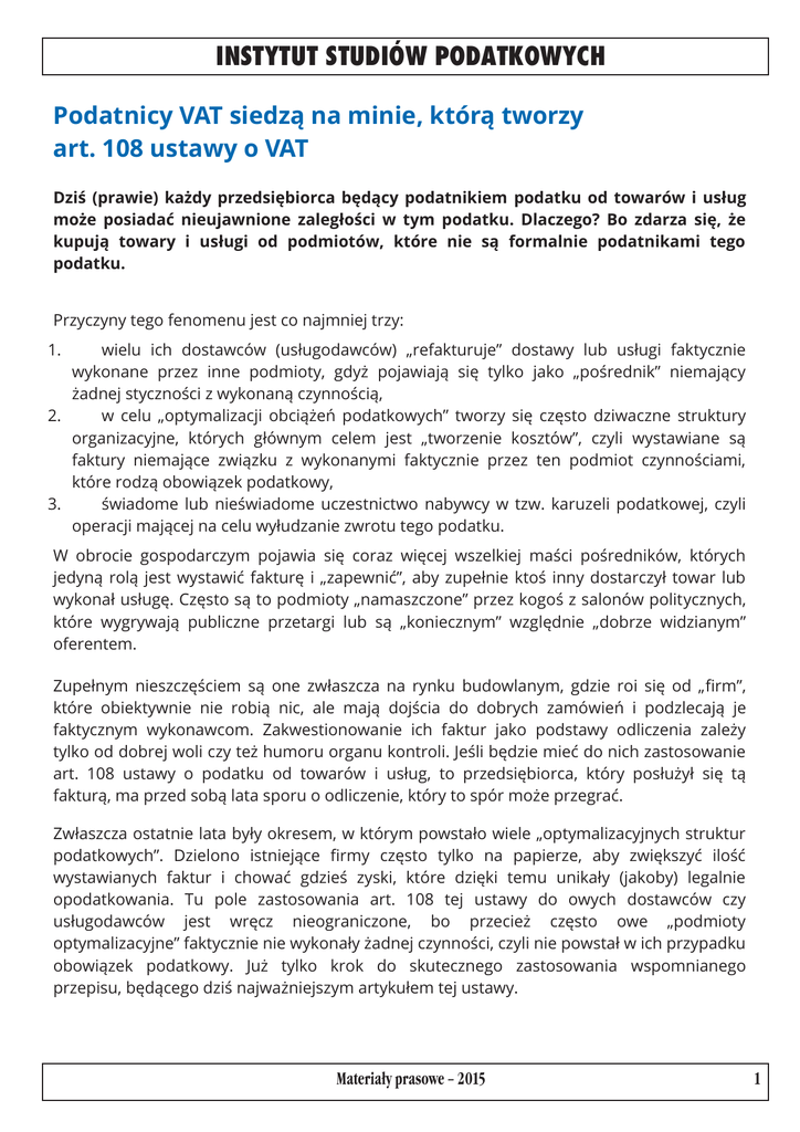 INSTYTUT STUDIÓW PODATKOWYCH Podatnicy VAT siedzą na minie, którą tworzy art. 108 ustawy o VAT Dziś (prawie) każdy przedsiębiorca będący podatnikiem podatku od towarów i usług może posiadać nieujawnione zaległości w tym podatku. Dlaczego? Bo zdarza się, że kupują towary i usługi od podmiotów, które nie są formalnie podatnikami tego podatku. Przyczyny tego fenomenu jest co najmniej trzy: 1. wielu ich dostawców (usługodawców) „refakturuje” dostawy lub usługi faktycznie wykonane przez inne podmioty, gdyż pojawiają się tylko jako „pośrednik” niemający żadnej styczności z wykonaną czynnością, 2. w celu „optymalizacji obciążeń podatkowych” tworzy się często dziwaczne struktury organizacyjne, których głównym celem jest „tworzenie kosztów”, czyli wystawiane są faktury niemające związku z wykonanymi faktycznie przez ten podmiot czynnościami, które rodzą obowiązek podatkowy, 3. świadome lub nieświadome uczestnictwo nabywcy w tzw. karuzeli podatkowej, czyli operacji mającej na celu wyłudzanie zwrotu tego podatku. W obrocie gospodarczym pojawia się coraz więcej wszelkiej maści pośredników, których jedyną rolą jest wystawić fakturę i „zapewnić”, aby zupełnie ktoś inny dostarczył towar lub wykonał usługę. Często są to podmioty „namaszczone” przez kogoś z salonów politycznych, które wygrywają publiczne przetargi lub są „koniecznym” względnie „dobrze widzianym” oferentem. Zupełnym nieszczęściem są one zwłaszcza na rynku budowlanym, gdzie roi się od „firm”, które obiektywnie nie robią nic, ale mają dojścia do dobrych zamówień i podzlecają je faktycznym wykonawcom. Zakwestionowanie ich faktur jako podstawy odliczenia zależy tylko od dobrej woli czy też humoru organu kontroli. Jeśli będzie mieć do nich zastosowanie art. 108 ustawy o podatku od towarów i usług, to przedsiębiorca, który posłużył się tą fakturą, ma przed sobą lata sporu o odliczenie, który to spór może przegrać. Zwłaszcza ostatnie lata były okresem, w którym powstało wiele „optymalizacyjnych struktur podatkowych”. Dzielono istniejące firmy często tylko na papierze, aby zwiększyć ilość wystawianych faktur i chować gdzieś zyski, które dzięki temu unikały (jakoby) legalnie opodatkowania. Tu pole zastosowania art. 108 tej ustawy do owych dostawców czy usługodawców jest wręcz nieograniczone, bo przecież często owe „podmioty optymalizacyjne” faktycznie nie wykonały żadnej czynności, czyli nie powstał w ich przypadku obowiązek podatkowy. Już tylko krok do skutecznego zastosowania wspomnianego przepisu, będącego dziś najważniejszym artykułem tej ustawy. Materia³y prasowe – 2015 1 INSTYTUT STUDIÓW PODATKOWYCH Świadome lub nieświadome uczestnictwo w transakcjach karuzelowych w obrocie m.in. paliwami, stalą, cementem, olejem rzepakowym (lista bardzo długa), jest największym ryzykiem dla firm handlowych. Towary te formalnie przechodzą przez ręce wielu odprzedawców, najczęściej w tranzycie rozliczanym, gdzie towaru nikt nie widział na oczy, a organizator tego procederu, uchylający się od opodatkowania, pozostaje nieuchwytny lub gdy wpadnie – idzie na współpracę z organami ścigania i topi kolejnych uczestników tej operacji. Zastosowanie do wystawionych tu faktur art. 108 ustawy o VAT - co wyklucza prawo do odliczenia - jest powszechną praktyką. Jak widać kluczowe znaczenie ma we wszystkich powyższych przypadkach art. 108 ustawy o VAT, a nabywca towarów lub usługobiorca może co najwyżej powoływać się na dobrą wiarę, czyli że „nie wiedział i nie mógł wiedzieć”, że posłużył się fakturą, która nie była wystawiona przez podmiot wykonujący czynność rodzącą obowiązek podatkowy. Szanse obrony odliczenia z tego tytułu są, ale w rzeczywistości bardzo małe, bo sądy administracyjne bardzo niechętne odnoszą się do zastosowania tej przesłanki odliczenia. Paradoksalnie władza ma bardzo duże możliwości zwiększenia dochodów budżetowych z tego podatku, a kryzys wpływów z tego tytułu prędzej czy później (po wyborach) przyspieszy działanie organów podatkowych, ale przede wszystkim kontroli skarbowej. Witold Modzelewski Profesor Uniwersytetu Warszawskiego Instytut Studiów Podatkowych http://ksiegowosc.infor.pl/podatki/vat/rozliczenia-vat/724739,Podatnicy-VAT-siedza-na-minie-ktora-tworzy-art-108-ustawy-o-VAT.html Materia³y prasowe – 2015 2