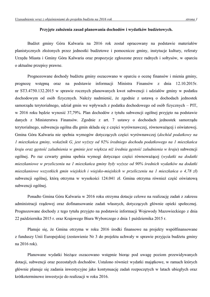 Uzasadnienie wraz z objaśnieniami do projektu budżetu na 2016 rok strona 1 Przyjęte założenia zasad planowania dochodów i wydatków budżetowych. Budżet gminy Góra Kalwaria na 2016 rok został opracowany na podstawie materiałów planistycznych złożonych przez jednostki budżetowe i pomocnicze gminy, instytucje kultury, referaty Urzędu Miasta i Gminy Góra Kalwaria oraz propozycje zgłoszone przez radnych i sołtysów, w oparciu o aktualne przepisy prawne. Prognozowane dochody budżetu gminy oszacowano w oparciu o ocenę finansów i mienia gminy, prognozę wstępną oraz na podstawie informacji Ministra Finansów z dnia 12.10.2015r. nr ST3.4750.132.2015 w sprawie rocznych planowanych kwot subwencji i udziałów gminy w podatku dochodowym od osób fizycznych. Należy nadmienić, że zgodnie z ustawą o dochodach jednostek samorządu terytorialnego, udział gmin we wpływach z podatku dochodowego od osób fizycznych – PIT, w 2016 roku będzie wynosić 37,79%. Plan dochodów z tytułu subwencji ogólnej przyjęto na podstawie danych z Ministerstwa Finansów. Zgodnie z art. 7 ustawy o dochodach jednostek samorządu terytorialnego, subwencja ogólna dla gmin składa się z części wyrównawczej, równoważącej i oświatowej. Gmina Góra Kalwaria nie spełnia wymogów dotyczących części wyrównawczej (dochód podatkowy na 1 mieszkańca gminy, wskaźnik G, jest wyższy od 92% średniego dochodu podatkowego na 1 mieszkańca kraju oraz gęstość zaludnienia w gminie jest większa niż średnia gęstość zaludnienia w kraju) subwencji ogólnej. Po raz czwarty gmina spełnia wymogi dotyczące części równoważącej (wydatki na dodatki mieszkaniowe w przeliczeniu na 1 mieszkańca gminy były wyższe od 90% średnich wydatków na dodatki mieszkaniowe wszystkich gmin wiejskich i wiejsko-miejskich w przeliczeniu na 1 mieszkańca o 4,78 zł) subwencji ogólnej, którą otrzyma w wysokości 124.041 zł. Gmina otrzyma również część oświatową subwencji ogólnej. Ponadto Gmina Góra Kalwaria w 2016 roku otrzyma dotacje celowe na realizację zadań z zakresu administracji rządowej oraz dofinansowanie zadań własnych, dotyczących głównie opieki społecznej. Prognozowane dochody z tego tytułu przyjęto na podstawie informacji Wojewody Mazowieckiego z dnia 22 października 2015 r. oraz Krajowego Biura Wyborczego z dnia 1 października 2015 r. Planuje się, że Gmina otrzyma w roku 2016 środki finansowe na projekty współfinansowane z funduszy Unii Europejskiej (zestawienie Nr 3 do projektu uchwały w sprawie przyjęcia budżetu gminy na 2016 rok). Planowane wydatki bieżące oszacowano wstępnie biorąc pod uwagę poziom przewidywanych dotacji, subwencji oraz pozostałych dochodów. Ustalono również wydatki majątkowe, w ramach których głównie planuje się zadania inwestycyjne jako kontynuację zadań rozpoczętych w latach ubiegłych oraz krótkoterminowe inwestycje do realizacji w roku 2016. Uzasadnienie wraz z objaśnieniami do projektu budżetu na 2016 rok strona 2 Na realizację gminnego programu Profilaktyki i Rozwiązywania Problemów Alkoholowych oraz Przeciwdziałania Narkomanii w Gminie Góra Kalwaria zabezpieczono środki wskazane w zestawieniu Nr 6 do projektu uchwały w sprawie przyjęcia budżetu gminy na 2016 rok. W założeniach projektu uwzględniono realizację wydatków w ramach Funduszu Sołeckiego – środki będące do dyspozycji jednostek pomocniczych gminy w 2016 roku określone są w zestawieniu Nr 11 do projektu uchwały w sprawie przyjęcia budżetu gminy na 2016 rok. Wniosek sołectwa Mikówiec został odrzucony ze względów merytorycznych. Sołtys nie skorzystał z przysługującego mu, na podstawie art. 5 ust. 6-8 ustawy o funduszu sołeckim, prawa. Wydatki realizowane w ramach ustawy o funduszu sołeckim, wyliczone zgodnie z art. 3 ust. 1 tej ustawy, ukształtowały się na poziomie 628.386 zł. Rada Miejska w dniu 27 czerwca 2014 r. podjęła Uchwałę Nr LVIII/638/2014 w sprawie określenia zasad zwiększania środków funduszu sołeckiego przypadających na poszczególne sołectwa. Po uwzględnieniu zapisów niniejszej Uchwały, środki będące do dyspozycji jednostek pomocniczych Gminy na 2016 rok ukształtowały się ostatecznie na poziomie 667.426 zł. Projekt budżetu na 2016 rok skonstruowano przy założeniu, iż roczny plan finansowy powinien zapewnić nie tylko realizację podstawowych zadań gminy, ale w sposób optymalny zabezpieczyć realizację wszystkich niezbędnych potrzeb mieszkańców (głównie z zakresu oświaty, opieki społecznej, ochrony zdrowia, edukacyjnej opieki wychowawczej, kultury, kultury fizycznej oraz bezpieczeństwa publicznego i ochrony przeciwpożarowej, oraz gospodarki komunalnej i ochrony środowiska). CHARAKTERYSTYKA DOCHODÓW BUDŻETU GMINY NA 2016 ROK Ogółem dochody budżetowe na 2016 rok zaplanowano w kwocie 95.302.962 zł , w tym: a/ bieżące b/majątkowe 89.932.962 zł 5.370.000 zł Na ogólną kwotę dochodów składają się: - dochody własne 64.695.336 zł - subwencja oświatowa i równoważąca 22.524.438 zł - dotacje 8.083.188 zł W poszczególnych dziedzinach życia społeczno-gospodarczego plan dochodów przedstawia się następująco: Uzasadnienie wraz z objaśnieniami do projektu budżetu na 2016 rok Dział 010 – Rolnictwo i łowiectwo strona 3 3.000 zł Dochody z tytułu czynszów za obwody łowieckie. Dział 700 - Gospodarka mieszkaniowa 9.441.110 zł Rozdział 70004 – różne jednostki obsługi gospodarki mieszkaniowej /ABK/ 2.251.110 zł Dochody otrzymane z czynszów za lokale mieszkalne, użytkowe, wpływy za wodę, ścieki, gaz i CO oraz dzierżawę terenu pod garaże. Rozdział 70005 -gospodarka gruntami i nieruchomościami 7.190.000 zł Dochody otrzymane z najmu, dzierżawy i sprzedaży składników majątkowych gminy oraz wpływów z opłat za użytkowanie wieczyste nieruchomości i wpłat z tytułu odpłatnego nabycia prawa własności nieruchomości. Dochody ze sp