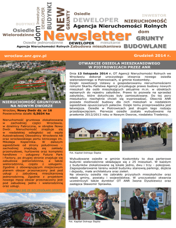 GRUNTY NEW BUDYNKI Osiedle Wielorodzinne DEWELOPER dom Inwestycje BUDYNKI Osiedle DEWELOPER INWESTOR NIERUCHOMOŚĆ Agencja Nieruchomości Rolnych Newsletter Osiedle jednorodzinne mieszkanie DEWELOPER Agencja Nieruchomości Rolnych Zabudowa mieszkaniowa dom GRUNTY BUDOWLANE Grudzień 2014 r. wroclaw.anr.gov.pl OTWARCIE OSIEDLA MIESZKANIOWEGO W PIOTROWICACH PRZEZ ANR NIERUCHOMOŚĆ GRUNTOWA NA NOWYM DWORZE Wrocław, Nowy Dwór dz. nr 16 Powierzchnia działki 0,5034 ha Nieruchomość gruntowa zlokalizowana w zachodniej części Wrocławia, w dzielnicy Fabryczna, w obrębie Nowy Dwór. Nieruchomość znajduje się w niedalekiej odległości od węzła Autostradowej Obwodnicy Wrocławia A8 oraz wrocławskiego portu lotniczego im. Mikołaja Kopernika. W dalszym sąsiedztwie od strony południowo – zachodniej znajdują się zakłady przemysłowe, hurtownie oraz kompleks handlowo – usługowy Futura Park i Factory, po drugiej stronie znajduje się zabudowa jednorodzinna, a także wielorodzinna, często z usługami. Zgodnie z obowiązującym miejscowym planem obszar przeznaczony jest pod usługi z zabudową mieszkaniową jednorodzinną. Zgodnie z projektem nowego mpzp obszar przeznaczony jest pod zabudowę jedno i wielorodzinną oraz usługi. Dnia 13 listopada 2014 r. OT Agencji Nieruchomości Rolnych we Wrocławiu dokonał uroczystego otwarcia nowego osiedla wielorodzinnego w Piotrowicach, w gminie Kostomłoty. Dzięki nowelizacji Ustawy o gospodarowaniu nieruchomościami rolnymi Skarbu Państwa Agencji przysługuje prawo budowy nowych mieszkań dla osób mieszkających aktualnie m.in. w obiektach wpisanych do rejestru zabytków. Prawo to pozwala na sprzedaż zabytków, które dotychczas były zamieszkiwane. Do tej pory mieszkańcy niechętnie chcieli się wyprowadzać. Obecnie ANR posiada możliwość budowy dla nich mieszkań w niedalekim sąsiedztwie opuszczanych pałaców. Dzięki temu przeprowadzka jest łatwiejsza. Osiedle w Piotrowicach jest drugim tego rodzaju przedsięwzięciem. Pierwsze osiedle zostało wybudowane na przełomie 2012/2013 roku w Nowym Dworze, niedaleko Trzebnicy. Fot. Kapitał Dolnego Śląska Wybudowane osiedle w gminie Kostomłoty to dwa parterowe budynki wielorodzinne składające się z 25 mieszkań. W każdym z budynków zlokalizowane są lokale jedno, dwu i trzy - pokojowe. Zagospodarowanie terenu wokół budynku stanowią parkingi, dojścia i dojazdy, mała architektura oraz zieleń. Na otwarciu osiedla nie zabrakło przyszłych mieszkańców oraz władz gminy, powiatu i województwa. W uroczystości otwarcia uczestniczyli także dyrektor OT ANR Iwona Dyszkiewicz oraz zastępca Sławomir Sprawka. ZAPOZNAJ SIĘ ZE SZCZEGÓŁAMI OFERTY Fot. Kapitał Dolnego Śląska Posiadamy w naszym zasobie jeszcze około 210 tys. ha gruntów, w tym 50 tys. ha nieruchomości inwestycyjnych. Przetargi na te nieruchomości organizowane są w trybie nieograniczonym i tym samym każdy może wziąć udział w licytacjach. Nasze nieruchomości mają uregulowany status prawny. ZOBACZ NASZE PRZYKŁADOWE OFERTY STRADOMIA WIERZCHNIA TARNINÓW GMINA LEGNICA WOJSZYCE GMINA WROCŁAW GMINA SYCÓW przeznaczenie: zabudowa mieszkaniowa jednorodzinna powierzchnia nieruchomości: od 0,1588 ha do 0,1796 ha położenie nieruchomości: miasto wojewódzkie – Wrocław – 60 km autostrada S8 – 0,4 km dworzec kolejowy w Sycowie – 8 km lotnisko – Wrocław – Strachowice – 63 km ZAPOZNAJ SIĘ ZE SZCZEGÓŁAMI OFERTY OSOBOWICE GMINA WROCŁAW przeznaczenie: lokal użytkowy powierzchnia użytkowa lokalu: 405,14 m2 W skład lokalu użytkowego wchodzi m.in.: czternaście pokoi biurowych, wielofunkcyjna sala oraz cztery pomieszczenia gospodarcze. Budynek jest w części jedno, a w części dwukondygnacyjny, murowany. ZAPOZNAJ SIĘ ZE SZCZEGÓŁAMI OFERTY przeznaczenie: zabudowa mieszkaniowa wielorodzinna powierzchnia nieruchomości: od 0,1671 ha do 0,9385 ha położenie nieruchomości: miasto wojewódzkie – Wrocław – 77 km autostrada A4 – 3 km dworzec kolejowy w Legnicy – 3 km lotnisko – Wrocław – Strachowice - 72 km przeznaczenie: zabudowa mieszkaniowa wielorodzinna i hotele powierzchnia nieruchomości: 6,7980ha położenie nieruchomości: droga krajowa nr 94 – 4 km droga krajowa nr 395 - bezpośrednio autostrada A4 – 9 km dworzec kolejowy we Wrocławiu– 4,5 km lotnisko – Wrocław – Strachowice - 16 km ZAPOZNAJ SIĘ ZE SZCZEGÓŁAMI OFERTY ZAPOZNAJ SIĘ ZE SZCZEGÓŁAMI OFERTY LIPA PIOTROWSKA SADKÓW przeznaczenie: zabudowa mieszkaniowa wielorodzinna powierzchnia nieruchomości: od 0,3808 ha do 0,9862 ha położenie nieruchomości: miasto wojewódzkie – Wrocław – 11 km AOW A8 – 1,5 km autostrada A4 – 9 km dworzec kolejowy we Wrocławiu– 11 km lotnisko – Wrocław – Strachowice - 15 km przeznaczenie: teren istniejącego oraz projektowanego zainwestowania powierzchnia nieruchomości: od 0,1426 ha do 0,1658 ha położenie nieruchomości: miasto wojewódzkie – Wrocław – 19 km autostrada A4 – 4 km dworzec kolejowy we Wrocławiu – 19 km lotnisko – Wrocław – Strachowice - 15 km GMINA WROCŁAW ZAPOZNAJ SIĘ ZE SZCZEGÓŁAMI OFERTY GMINA KĄTY WROCŁAWSKIE ZAPOZNAJ SIĘ ZE SZCZEGÓŁAMI OFERTY *Niniejsze oferty mają charakter informacyjny i nie są ofertą handlową w rozumieniu Kodeksu Cywilnego . Skontaktuj się z nami: ul. Mińska 60, 54-610 Wrocław, tel. 71 356 39 19