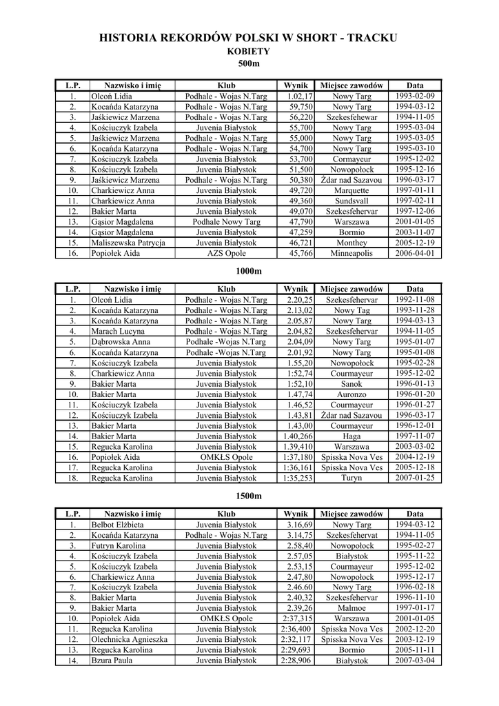 HISTORIA REKORDÓW POLSKI W SHORT - TRACKU KOBIETY 500m L.P. 1. 2. 3. 4. 5. 6. 7. 8. 9. 10. 11. 12. 13. 14. 15. 16. Nazwisko i imię Olcoń Lidia Kocańda Katarzyna Jaśkiewicz Marzena Kościuczyk Izabela Jaśkiewicz Marzena Kocańda Katarzyna Kościuczyk Izabela Kościuczyk Izabela Jaśkiewicz Marzena Charkiewicz Anna Charkiewicz Anna Bakier Marta Gąsior Magdalena Gąsior Magdalena Maliszewska Patrycja Popiołek Aida Klub Podhale - Wojas N.Targ Podhale - Wojas N.Targ Podhale - Wojas N.Targ Juvenia Białystok Podhale - Wojas N.Targ Podhale - Wojas N.Targ Juvenia Białystok Juvenia Białystok Podhale - Wojas N.Targ Juvenia Białystok Juvenia Białystok Juvenia Białystok Podhale Nowy Targ Juvenia Białystok Juvenia Białystok AZS Opole Wynik Miejsce zawodów 1.02,17 Nowy Targ 59,750 Nowy Targ 56,220 Szekesfehewar 55,700 Nowy Targ 55,000 Nowy Targ 54,700 Nowy Targ 53,700 Cormayeur 51,500 Nowopołock 50,380 Żdar nad Sazavou 49,720 Marquette 49,360 Sundsvall 49,070 Szekesfehervar 47,790 Warszawa 47,259 Bormio 46,721 Monthey 45,766 Minneapolis Data 1993-02-09 1994-03-12 1994-11-05 1995-03-04 1995-03-05 1995-03-10 1995-12-02 1995-12-16 1996-03-17 1997-01-11 1997-02-11 1997-12-06 2001-01-05 2003-11-07 2005-12-19 2006-04-01 Wynik 2.20,25 2.13,02 2.05,87 2.04,82 2.04,09 2.01,92 1.55,20 1:52,74 1:52,10 1.47,74 1.46,52 1.43,81 1.43,00 1.40,266 1.39,410 1:37,180 1:36,161 1:35,253 Miejsce zawodów Szekesfehervar Nowy Tag Nowy Targ Szekesfehervar Nowy Targ Nowy Targ Nowopołock Courmayeur Sanok Auronzo Courmayeur Żdar nad Sazavou Courmayeur Haga Warszawa Spisska Nova Ves Spisska Nova Ves Turyn Data 1992-11-08 1993-11-28 1994-03-13 1994-11-05 1995-01-07 1995-01-08 1995-02-28 1995-12-02 1996-01-13 1996-01-20 1996-01-27 1996-03-17 1996-12-01 1997-11-07 2003-03-02 2004-12-19 2005-12-18 2007-01-25 Wynik Miejsce zawodów 3.16,69 Nowy Targ 3.14,75 Szekesfehervat 2.58,40 Nowopołock 2.57,05 Białystok 2.53,15 Courmayeur 2.47,80 Nowopołock 2.46.60 Nowy Targ 2.40,32 Szekesfehervar 2.39,26 Malmoe 2:37,315 Warszawa 2:36,400 Spisska Nova Ves 2:32,117 Spisska Nova Ves 2:29,693 Bormio 2:28,906 Białystok Data 1994-03-12 1994-11-05 1995-02-27 1995-11-22 1995-12-02 1995-12-17 1996-02-18 1996-11-10 1997-01-17 2001-01-05 2002-12-20 2003-12-19 2005-11-11 2007-03-04 1000m L.P. 1. 2. 3. 4. 5. 6. 7. 8. 9. 10. 11. 12. 13. 14. 15. 16. 17. 18. Nazwisko i imię Olcoń Lidia Kocańda Katarzyna Kocańda Katarzyna Marach Lucyna Dąbrowska Anna Kocańda Katarzyna Kościuczyk Izabela Charkiewicz Anna Bakier Marta Bakier Marta Kościuczyk Izabela Kościuczyk Izabela Bakier Marta Bakier Marta Regucka Karolina Popiołek Aida Regucka Karolina Regucka Karolina Klub Podhale - Wojas N.Targ Podhale - Wojas N.Targ Podhale - Wojas N.Targ Podhale - Wojas N.Targ Podhale -Wojas N.Targ Podhale -Wojas N.Targ Juvenia Białystok Juvenia Białystok Juvenia Białystok Juvenia Białystok Juvenia Białystok Juvenia Białystok Juvenia Białystok Juvenia Białystok Juvenia Białystok OMKŁS Opole Juvenia Białystok Juvenia Białystok 1500m L.P. 1. 2. 3. 4. 5. 6. 7. 8. 9. 10. 11. 12. 13. 14. Nazwisko i imię Belbot Elżbieta Kocańda Katarzyna Futryn Karolina Kościuczyk Izabela Kościuczyk Izabela Charkiewicz Anna Kościuczyk Izabela Bakier Marta Bakier Marta Popiołek Aida Regucka Karolina Olechnicka Agnieszka Regucka Karolina Bzura Paula Klub Juvenia Białystok Podhale - Wojas N.Targ Juvenia Białystok Juvenia Białystok Juvenia Białystok Juvenia Białystok Juvenia Białystok Juvenia Białystok Juvenia Białystok OMKŁS Opole Juvenia Białystok Juvenia Białystok Juvenia Białystok Juvenia Białystok 3000m L.P. 1. 2. 3. 4. 5. 6. Nazwisko i imię Brzuszczyńska Anna Charkiewicz Anna Charkiewicz Anna Bakier Marta Olechnik Agnieszka Regucka Karolina Regucka Karolina Klub Orzeł Elbląg Juvenia Białystok Juvenia Białystok Juvenia Białystok Juvenia Białystok Juvenia Białystok Juvenia Białystok Wynik Miejsce zawodów 6.53,24 Nowy Targ 6.29,30 Nowopołock 6.01,13 Opole 5.45,51 Szekesfehervar 5.43,386 Warszawa 5:28,242 Spisska Nova Ves 5:24,761 Turyn Data 1994-03-13 1995-02-27 1997-02-23 1997-11-02 2003-03-02 2004-12-19 2007-01-26 3000m sztafeta L.P. Klub 1. Juvenia Białystok Nazwisko i imię Bakier Marta Charkiewicz Anna Futryn Karolina Kościuczyk Izabela Wynik Miejsce zawodów Data 5.26,92 Białystok 1995-12-22 5.16,30 Nowy Targ 1996-02-18 2. Juvenia Białystok Bakier Marta Charkiewicz Anna Futryn Karolina Kościuczyk Izabela 3. Polska -Juvenia Białystok Charkiewicz Anna Futryn Karolina Piekarska Anna Wiszniewska Ewelina 5.07,67 Szekesfehervar 1996-11-10 4. Juvenia Białystok Bakier Marta Charkiewicz Anna Futryn Karolina Piekarska Anna 5.00,50 Oświęcim 1997-02-17 5. Polska -Juvenia Białystok Bakier Marta Charkiewicz Anna Piekarska Anna Sadowska Aneta 4.57,90 Szkesfeheryar 1997-12-07 Juvenia Białystok Bakier Marta Charkiewicz Anna Piekarska Anna Futryn Karolina 4.57,76 Opole 1998-02-28 Juvenia Białystok Supranowicz Wioleta Żylińska Beata Świerczkowa 4.51,84 Natalia Futryn Karolina Spisska Nova Ves 1999-12-12 4.51,49 Białystok 2001-03-06 4.46,35 Białystok 2002-03-10 6. 7. 8. Juvenia 1 Białystok Rzemek Laura Romanowicz Anna Supranowicz Wioleta Świerczkowa Natalia Gąsior Magdalena Romanowicz Anna Regucka Karolina Żylińska Beata 9. Polska II 10. Białystok M.Gąsior, A.Bawerna, K.Regucka, P.Maliszewska 4:38,568 Spisska Nova Ves 2003-12-19 11. Polska II Regucka Karolina, Popiołek Aida, Maliszewska Patrycja, Zawada Malwina 4:35,406 Spisska Nova Ves 2004-12-19 12. POLAND I Maliszewska Patrycja, Zawoda Malwina, Popiołek Aida, Regucka Karolina 4:34,066 Krynica 2006-01-22 13. POLAND III Popiołek Aida, Regucka Karolina, Romanowicz Anna, Maliszewska Patrycja 4:28,462 Bormio 2006-11-12 MĘŻCZYŹNI 500m L.P. 1. 2. 3. 4. 5. 6. 7. 8. 9. 10. 11. 12. 13. 14. 15. 16. 17. 18. 19. Nazwisko i imię Cukier Krzysztof Krawczyk Ludwik Krawczyk Ludwik Krawczyk Ludwik Gierasimiuk Ireneusz Krawczyk Ludwik Krawczyk Ludwik Krawczyk Ludwik Krawczyk Ludwik Kra