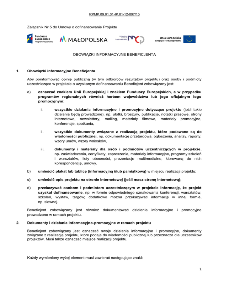 RPMP.09.01.01-IP.01-12-007/15 Załącznik Nr 5 do Umowy o dofinansowanie Projektu OBOWIĄZKI INFORMACYJNE BENEFICJENTA 1. Obowiązki informacyjne Beneficjenta Aby poinformować opinię publiczną (w tym odbiorców rezultatów projektu) oraz osoby i podmioty uczestniczące w projekcie o uzyskanym dofinansowaniu Beneficjent zobowiązany jest: a) oznaczać znakiem Unii Europejskiej i znakiem Funduszy Europejskich, a w przypadku programów regionalnych również herbem województwa lub jego oficjalnym logo promocyjnym: i. wszystkie działania informacyjne i promocyjne dotyczące projektu (jeśli takie działania będą prowadzone), np. ulotki, broszury, publikacje, notatki prasowe, strony internetowe, newslettery, mailing, materiały filmowe, materiały promocyjne, konferencje, spotkania, ii. wszystkie dokumenty związane z realizacją projektu, które podawane są do wiadomości publicznej, np. dokumentację przetargową, ogłoszenia, analizy, raporty, wzory umów, wzory wniosków, iii. dokumenty i materiały dla osób i podmiotów uczestniczących w projekcie, np. zaświadczenia, certyfikaty, zaproszenia, materiały informacyjne, programy szkoleń i warsztatów, listy obecności, prezentacje multimedialne, kierowaną do nich korespondencję, umowy. b) umieścić plakat lub tablicę (informacyjną i/lub pamiątkową) w miejscu realizacji projektu; c) umieścić opis projektu na stronie internetowej (jeśli masz stronę internetową); d) przekazywać osobom i podmiotom uczestniczącym w projekcie informację, że projekt uzyskał dofinansowanie, np. w formie odpowiedniego oznakowania konferencji, warsztatów, szkoleń, wystaw, targów; dodatkowo można przekazywać informację w innej formie, np. słownej. Beneficjent zobowiązany jest również prowadzone w ramach projektu. 2. dokumentować działania informacyjne i promocyjne Dokumenty i działania informacyjno-promocyjne w ramach projektu Beneficjent zobowiązany jest oznaczać swoje działania informacyjne i promocyjne, dokumenty związane z realizacją projektu, które podaje do wiadomości publicznej lub przeznacza dla uczestników projektów. Musi także oznaczać miejsce realizacji projektu. Każdy wymieniony wyżej element musi zawierać następujące znaki: 1 RPMP.09.01.01-IP.01-12-007/15 Znak Funduszy Europejskich (FE) Znak Unii Europejskiej (UE) złożony z symbolu graficznego, nazwy Fundusze Europejskie oraz nazwy programu, z którego w części lub w całości finansowany jest Twój projekt. złożony z flagi UE, napisu Unia Europejska i nazwy funduszu, który współfinansuje Twój projekt. Przykładowe zestawienie znaków – układ poziomy: Jeśli realizuje projekt finansowany przez program regionalny, w zestawieniu znaków umieszcza także herb lub oficjalne logo promocyjne województwa. Wzory z właściwymi oznaczeniami dla każdego programu są dostępne na stronach internetowych programów. Znajdują się tam także gotowe wzory dla plakatów i tablic, z których Beneficjent powinien skorzystać. Herb lub oficjalne logo promocyjne województwa muszą być stosowane zgodnie z wzorami wskazanymi na stronach internetowych programów regionalnych. Nie ma obowiązku zamieszczania dodatkowej informacji słownej o programie, w ramach którego realizowany jest projekt oraz o funduszu współfinansującym projekt. Zestaw znaków zawiera wszystkie niezbędne informacje1. W przypadku reklamy dostępnej w formie dźwiękowej bez elementów graficznych (np. spoty/audycje radiowe) na końcu tej reklamy powinien znaleźć się komunikat słowny. Oznaczenie projektów realizowanych w ramach Inicjatywy na rzecz zatrudnienia ludzi młodych Jeśli Beneficjent realizuje projekt, w którym występuje dofinansowanie z UE w postaci środków ze specjalnej linii budżetowej Inicjatywa na rzecz zatrudnienia ludzi młodych, zobowiązany jest zastosować następujące oznaczenia: znak Funduszy Europejskich z nazwą programu Wiedza Edukacja Rozwój, znak Unii Europejskiej z nazwą Europejski Fundusz Społeczny, informacja słowna „Projekt realizowany w ramach Inicjatywy na rzecz zatrudnienia ludzi młodych”. Informacja, że dany projekt jest wspierany w ramach Inicjatywy na rzecz zatrudnienia ludzi młodych, powinna znaleźć się na wszelkich materiałach informacyjnych i promocyjnych, dokumentach dotyczących realizacji projektu, podawanych do publicznej wiadomości lub wydawanych uczestnikom projektów, w tym na zaświadczeniach o udziale lub innych certyfikatach. Należy ją umieścić także na plakatach z informacjami na temat projektu oraz na stronie internetowej. 3. Oznaczenie miejsca projektu Obowiązki związane z oznaczaniem miejsca realizacji projektu zależą od rodzaju projektu oraz wysokości dofinansowania projektu. Beneficjenci (za wyjątkiem tych, którzy muszą stosować 1 Wyjątek stanowią projekty realizowane w ramach Inicjatywy na rzecz zatrudnienia ludzi młodych. 2 RPMP.09.01.01-IP.01-12-007/15 tablice informacyjne i/lub pamiątkowe) są zobowiązani do umieszczenia w widocznym miejscu co najmniej jednego plakatu identyfikującego projekt. Kto? Jeśli Beneficjent realizuje projekt współfinasowany z Europejskiego Funduszu Rozwoju Regionalnego lub Funduszu Spójności, który w ramach programu uzyskał dofinansowanie na kwotę powyżej 500 tys. euro i który dotyczy: Co? Tablica informacyjna (w trakcie realizacji projektu) a) działań w zakresie infrastruktury lub b) prac budowlanych. Jeśli Beneficjent zakończył realizację projektu dofinasowanego na kwotę powyżej 500 tys. euro, który polegał na: a) działaniach w zakresie infrastruktury lub b) pracach budowlanych lub Tablica pamiątkowa (po zakończeniu realizacji projektu) c) zakupie środków trwałych. Jeśli Beneficjent nie jest zobowiązany do: a) umieszczania tablicy informacyjnej lub Plakat (w trakcie realizacji projektu) b) umieszczania tablicy pamiątkowej. Jeśli Beneficjent uzyskał dofinansowanie poniżej 500 tys. euro może umieścić tablicę info