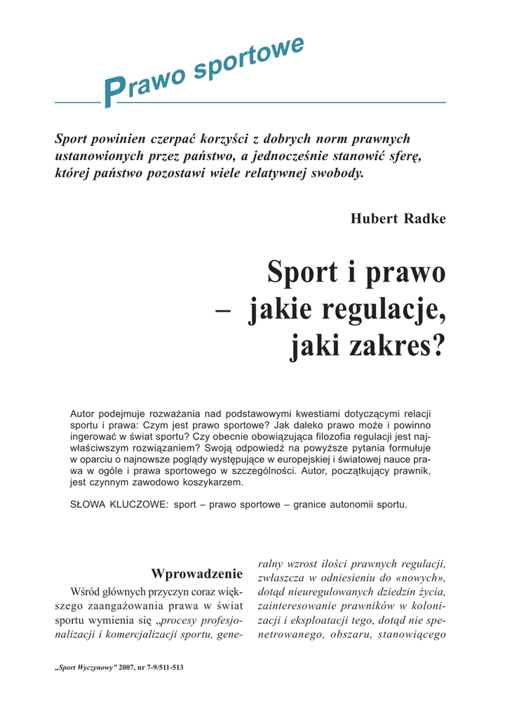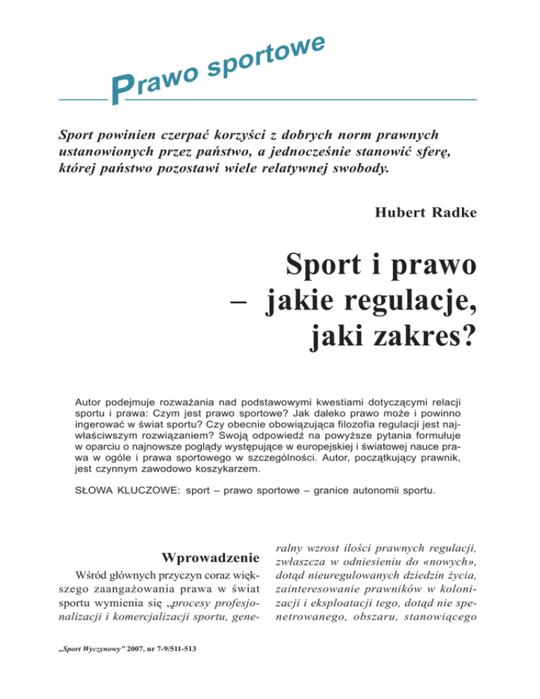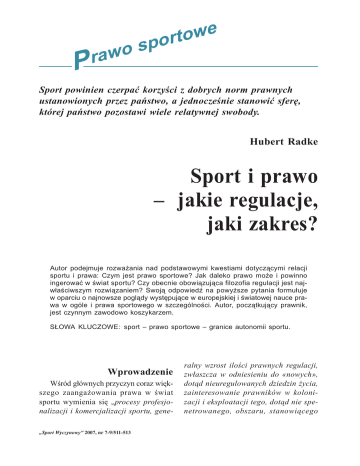 e w o t r o p s rawo 139 P Sport powinien czerpać korzyści z dobrych norm prawnych ustanowionych przez państwo, a jednocześnie stanowić sferę, której państwo pozostawi wiele relatywnej swobody. Hubert Radke Sport i prawo – jakie regulacje, jaki zakres? Autor podejmuje rozważania nad podstawowymi kwestiami dotyczącymi relacji sportu i prawa: Czym jest prawo sportowe? Jak daleko prawo może i powinno ingerować w świat sportu? Czy obecnie obowiązująca filozofia regulacji jest najwłaściwszym rozwiązaniem? Swoją odpowiedź na powyższe pytania formułuje w oparciu o najnowsze poglądy występujące w europejskiej i światowej nauce prawa w ogóle i prawa sportowego w szczególności. Autor, początkujący prawnik, jest czynnym zawodowo koszykarzem. SŁOWA KLUCZOWE: sport – prawo sportowe – granice autonomii sportu. Wprowadzenie Wśród głównych przyczyn coraz większego zaangażowania prawa w świat sportu wymienia się „procesy profesjonalizacji i komercjalizacji sportu, gene„Sport Wyczynowy” 2007, nr 7-9/511-513 ralny wzrost ilości prawnych regulacji, zwłaszcza w odniesieniu do «nowych», dotąd nieuregulowanych dziedzin życia, zainteresowanie prawników w kolonizacji i eksploatacji tego, dotąd nie spenetrowanego, obszaru, stanowiącego 140 potencjalne pole ich profesjonalnej aktywności czy wreszcie konieczność rozwiązywania problemów wynikających z dynamicznego rozwoju sportu, powodujących «moralną panikę» prowadzącą do konieczności prawnej interwencji.”1 Najważniejszym celem różnych rozwiązań wydaje się jednak nie chęć uporządkowania spraw sportu, lecz jego podporządkowanie władzy nadrzędnej. Brakuje zaś ogólnej koncepcji dotyczącej charakteru i pożądanego zakresu regulacji prawnych, z jakimi powinniśmy mieć w świecie sportu do czynienia. Tendencja powyższa niewątpliwie wynika z aktualnego rozumienia i wykorzystywania prawa. Oczywiste jest, że podstawą porządku społeczno-ekonomicznego i politycznego w państwach rozwiniętych mogą być jedynie akty prawne, że „widzialna ręka prawa” jest niezbędnym narzędziem reform, które nie dokonują się samorzutnie.2 Jednakże obecnie można zaobserwować dążenie do jurydyzacji, czyli regulacji każdej możliwej dziedziny życia w jak najbardziej szczegółowy sposób. We współczesnym świecie prawo nie jest tylko środkiem wyznaczającym ogólne ramy funkcjonowania określonych dziedzin życia, ustanawiającym granice dozwolonej działalności, lecz wydaje się wprost wyznaczać kierunek wszelkich zacho1Davis T. (ed.): Sports and the law: a modern anthology. Durham North Carolina 1999. Carolina Academic Press, s. 7. 2Morawski L.: Główne problemy współczesnej filozofii prawa. Warszawa 2003. Wydawnictwo Prawnicze Lexis Nexis, s. 84. Hubert Radke dzących w społeczeństwie procesów. Zakazy i nakazy formułowane przez prawo przestają być formą ochrony ludzkich praw i wolności czy też formą ochrony elementarnych standardów etycznych i stają się niezależnym medium sterowania.3 Sport od zawsze uznawany był za dziedzinę cechującą się swoistą niezależnością, funkcjonującą w oparciu o własne zasady i reguły. Niezależność ta nie była jednak nigdy uznawana za wyraz oddzielenia sportu od innych dziedzin życia i zasad w nich panujących. Wręcz przeciwnie, jak twierdzi Matthew Mitten: „Istnieje wzajemna zależność pomiędzy sportem i wartościami społecznymi. Sport inkorporuje istniejące w społeczeństwie wartości i pogłębia te wartości na polu gry, poprzez swoje reguły i ustanowione instytucje. Sport także eksportuje swoje zasady i wnioski wyciągnięte z uczestniczenia w rywalizacji oraz podstawy swojej organizacji do społeczeństwa w ogóle.”4 Obecnie zależność ta nabrała zdecydowanie bardziej formalnego charakteru. Sport został na stałe wpisany w kontekst ogólny i stał się przedmiotem wielu szczegółowych regulacji prawnych, dotąd nie mających żadnego wpływu na jego funkcjonowanie. Należy więc zastanowić się nad kwestią charakteru, zakresu i podmiotów uprawnionych do decydowania o jego kształcie. 3Morawski L., op. cit., s. 109, 120. 4Mitten M., Davis T., Smith R. K., Berry R. C.: Sports law and regulation: cases, materials and problems. New York 2005, Aspen Publishers, s. 4. Sport i prawo – jakie regulacje, jaki zakres? Do charakterystyki porządku normatywnego istniejącego w świecie sportu najczęściej używa się pojęcia prawa sportowego, budzącego wciąż wiele kontrowersji. W środowisku prawników świata zachodniego dyskusje co do istnienia prawa sportowego trwają od przełomu lat siedemdziesiątych i osiemdziesiątych minionego stulecia. W USA prawo sportowe od ponad dwóch dekad uznawane jest za w pełni samodzielną dyscyplinę prawa. W Europie wciąż trwa debata w tej kwestii.5 W dalszych rozważaniach skoncentruję się na problemach kontynentu europejskiego, korzystając z interesujących doświadczeń zza oceanu. Czym w istocie jest prawo sportowe? Nasze rozważania należy zacząć od ustalenia możliwości posługiwania się terminem prawo w odniesieniu do wszystkich sportowych unormowań. Jeżeli bowiem za podstawę przyjąć pozytywistyczną koncepcję prawa, powszechnie akceptowaną we wszystkich krajach naszego kręgu cywilizacyjnego, za którą opowiadają się także Konstytucja Rzeczypospolitej Polskiej z 2 kwietnia 1997 roku6 oraz nasz Trybunał Konstytucyjny, to z całą pewnością nie wszystkie normy mogą zostać zaliczone do prawa sportowego. Nowoczesne i realistyczne spojrzenie na prawo wymaga zakwestionowania tezy, że istnieje konieczny 5Halgreen L., European sports law: a comparative analysis of the European and American models of sport. Copenhagen 2004. Forlaget Thomson, s. 23. 6Dz. U. 1997, Nr 78, poz. 483. 141 związek między nim i państwem. Współcześnie istnieje pewien pluralizm porządków prawnych, tworzonych przez różne instytucje, jak np. Unia 