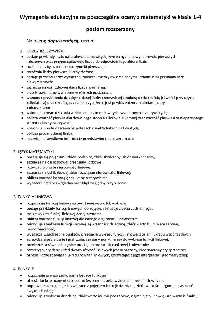 Wymagania edukacyjne na poszczególne oceny z matematyki w klasie 1-4