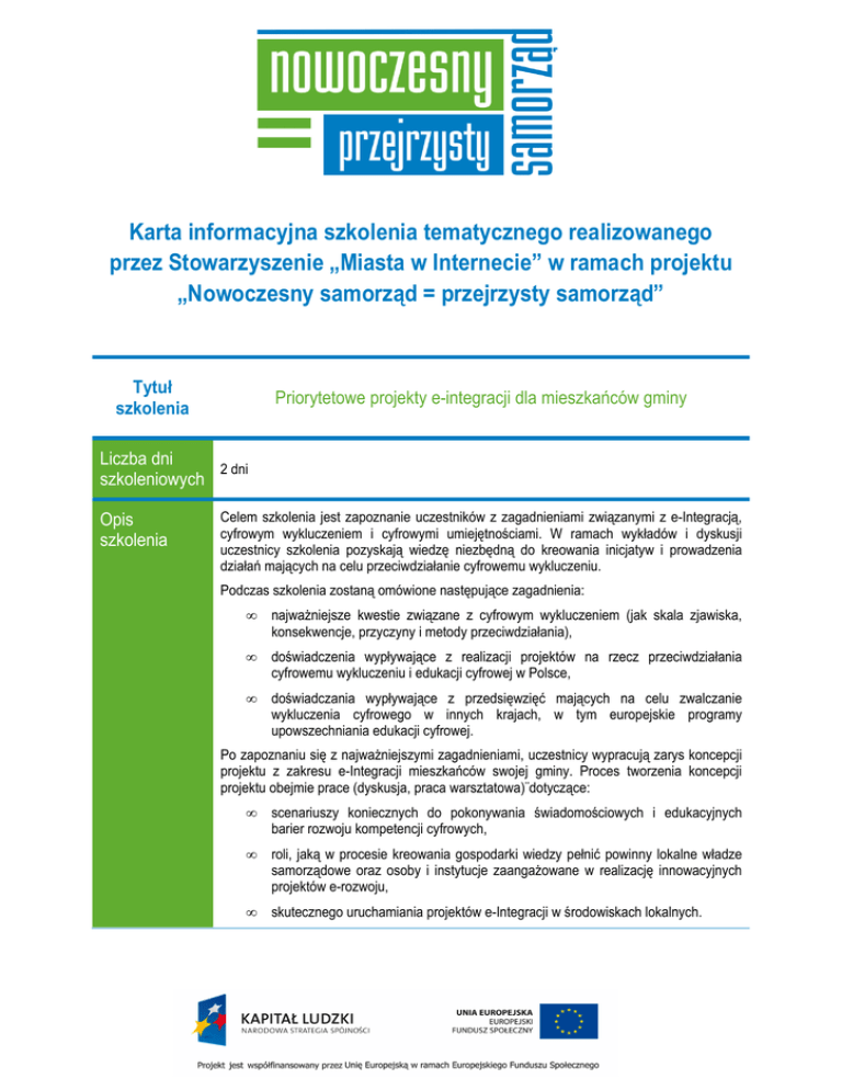 Karta informacyjna szkolenia tematycznego realizowanego przez Stowarzyszenie „Miasta w Internecie” w ramach projektu „Nowoczesny samorząd = przejrzysty samorząd” Tytuł szkolenia Liczba dni szkoleniowych Opis szkolenia Priorytetowe projekty e-integracji dla mieszkańców gminy 2 dni Celem szkolenia jest zapoznanie uczestników z zagadnieniami związanymi z e-Integracją, cyfrowym wykluczeniem i cyfrowymi umiejętnościami. W ramach wykładów i dyskusji uczestnicy szkolenia pozyskają wiedzę niezbędną do kreowania inicjatyw i prowadzenia działań mających na celu przeciwdziałanie cyfrowemu wykluczeniu. Podczas szkolenia zostaną omówione następujące zagadnienia: • najważniejsze kwestie związane z cyfrowym wykluczeniem (jak skala zjawiska, konsekwencje, przyczyny i metody przeciwdziałania), • doświadczenia wypływające z realizacji projektów na rzecz przeciwdziałania cyfrowemu wykluczeniu i edukacji cyfrowej w Polsce, • doświadczania wypływające z przedsięwzięć mających na celu zwalczanie wykluczenia cyfrowego w innych krajach, w tym europejskie programy upowszechniania edukacji cyfrowej. Po zapoznaniu się z najważniejszymi zagadnieniami, uczestnicy wypracują zarys koncepcji projektu z zakresu e-Integracji mieszkańców swojej gminy. Proces tworzenia koncepcji projektu obejmie prace (dyskusja, praca warsztatowa)¨dotyczące: • scenariuszy koniecznych do pokonywania świadomościowych i edukacyjnych barier rozwoju kompetencji cyfrowych, • roli, jaką w procesie kreowania gospodarki wiedzy pełnić powinny lokalne władze samorządowe oraz osoby i instytucje zaangażowane w realizację innowacyjnych projektów e-rozwoju, • skutecznego uruchamiania projektów e-Integracji w środowiskach lokalnych. Agenda 1 dzień 7:30 – 7:45 Rejestracja uczestników, przywitanie 7:45 – 9:30 Cyfrowe wykluczenie i jego skutki. Cyfrowe wykluczenie w Polsce – skala zjawiska, Polska na tle innych krajów 9:30 – 10:00 Przerwa 10:00 – 12:00 Przyczyny cyfrowego wykluczenia. Motywacja, dostęp do technologii, kompetencje i faktyczne wykorzystanie. 12:00 – 13:00 Przerwa 13:00 – 15:30 Doświadczenia z polskich i zagranicznych projektów na rzecz przeciwdziałania cyfrowemu wykluczeniu 2 dzień 7:30 – 9:30 Rola lokalnych władz samorządowych w walce z cyfrowym wykluczeniem i eintegracji 9:30 – 10:00 Przerwa 10:00 – 12:00 Scenariusze przeciwdziałania cyfrowemu wykluczeniu i e-integracji 12:00 – 13:00 Przerwa 13:00 – 15:30 Jak uruchamiać projekty e-integracji Prelegent Anna Kuczyńska Absolwentka socjologii na Uniwersytecie Warszawskim oraz Polskiej Szkoły Reportażu. Doktorantka w Instytucie Socjologii Uniwersytetu Warszawskiego, przygotowuje doktorat dotyczący cyfrowego wykluczenia. Uczestniczka 2nd International Summer Academy on Political Consulting and Strategic Campaign Communication na Uniwersytecie w Mannheim, projektu Waves of Democracy w Brandbjerg i Kopenhadze oraz Brukseli, a także Central European Conference (Rajk László College for Advanced Studies). Absolwentka I edycji Szkoły Młodych Liderów Socjologii. Zasiadała w Radzie Programowej XIII Ogólnopolskiego Zjazdu Socjologicznego. Zajmuje się socjologią i badaniami nowych mediów, badała też adaptację do miasta, budownictwo społeczne oraz postrzeganie globalizacji w Chinach i w Polsce, a także obserwowała protesty na Węgrzech i uczyła statystycznej analizy danych. Uczestniczka i koordynatorka konferencji polskich i międzynarodowych, autorka tekstów naukowych oraz reportaży. Współpracowała z Dziennikiem, Gazetą Wyborczą, Res Publicą, Instytutem Badań nad Gospodarką Rynkową, Centrum im. Adama Smitha, Stowarzyszeniem Miasta w Internecie i Odyseją Umysłu. Współtworzyła badania dla Banku Rozwoju Rady Europy, Polskiego Radia i Centrum Nauki Kopernik. Członkini Polskiego Towarzystwa Socjologicznego. Współtworzy Warsztaty Analiz Socjologicznych. UM Radlin UM Czechowice-Dziedzice Liczba edycji szkolenia Liczba uczestników Daty edycji Liczba edycji szkolenia Liczba uczestników Daty edycji 2 30 osób 7-8.V.2013, 10-11.VI.2013 3 45 osób 13-14.V.2013, 15-16.V.2013, 12-13.VI.2013