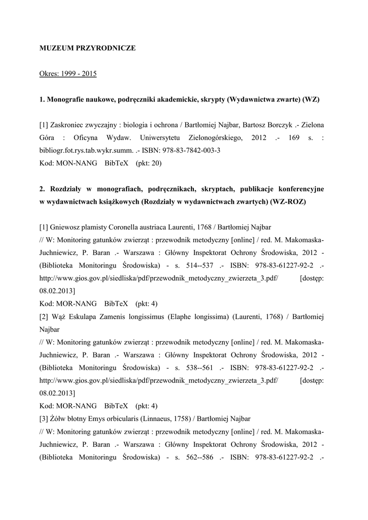 MUZEUM PRZYRODNICZE Okres: 1999 - 2015 1. Monografie naukowe, podręczniki akademickie, skrypty (Wydawnictwa zwarte) (WZ) [1] Zaskroniec zwyczajny : biologia i ochrona / Bartłomiej Najbar, Bartosz Borczyk .- Zielona Góra : Oficyna Wydaw. Uniwersytetu Zielonogórskiego, 2012 .- 169 s. : bibliogr.fot.rys.tab.wykr.summ. .- ISBN: 978-83-7842-003-3 Kod: MON-NANG BibTeX (pkt: 20) 2. Rozdziały w monografiach, podręcznikach, skryptach, publikacje konferencyjne w wydawnictwach książkowych (Rozdziały w wydawnictwach zwartych) (WZ-ROZ) [1] Gniewosz plamisty Coronella austriaca Laurenti, 1768 / Bartłomiej Najbar // W: Monitoring gatunków zwierząt : przewodnik metodyczny [online] / red. M. MakomaskaJuchniewicz, P. Baran .- Warszawa : Główny Inspektorat Ochrony Środowiska, 2012 (Biblioteka Monitoringu Środowiska) - s. 514--537 .- ISBN: 978-83-61227-92-2 .http://www.gios.gov.pl/siedliska/pdf/przewodnik_metodyczny_zwierzeta_3.pdf/ [dostęp: 08.02.2013] Kod: MOR-NANG BibTeX (pkt: 4) [2] Wąż Eskulapa Zamenis longissimus (Elaphe longissima) (Laurenti, 1768) / Bartłomiej Najbar // W: Monitoring gatunków zwierząt : przewodnik metodyczny [online] / red. M. MakomaskaJuchniewicz, P. Baran .- Warszawa : Główny Inspektorat Ochrony Środowiska, 2012 (Biblioteka Monitoringu Środowiska) - s. 538--561 .- ISBN: 978-83-61227-92-2 .http://www.gios.gov.pl/siedliska/pdf/przewodnik_metodyczny_zwierzeta_3.pdf/ [dostęp: 08.02.2013] Kod: MOR-NANG BibTeX (pkt: 4) [3] Żółw błotny Emys orbicularis (Linnaeus, 1758) / Bartłomiej Najbar // W: Monitoring gatunków zwierząt : przewodnik metodyczny [online] / red. M. MakomaskaJuchniewicz, P. Baran .- Warszawa : Główny Inspektorat Ochrony Środowiska, 2012 (Biblioteka Monitoringu Środowiska) - s. 562--586 .- ISBN: 978-83-61227-92-2 .- http://www.gios.gov.pl/siedliska/pdf/przewodnik_metodyczny_zwierzeta_3.pdf/ [dostęp: 08.02.2013] Kod: MOR-NANG BibTeX (pkt: 4) [4] Uwagi na temat aktywnej ochrony węża Eskulapa Zamenis longissimus longissimus (Laurenti, 1768) w latach 2009-2010 w Bieszczadach Zachodnich / Katarzyna Kurek, Bartłomiej Najbar, Stanisław Bury, Grzegorz Baś // W: Biologia płazów i gadów : ochrona herpetofauny / red. W. Zamachowski .- Kraków : Wydaw. Naukowe Uniwersytetu Pedagogicznego, 2011 - s. 144--156 .- ISBN: 978-83-7271707-8 Kod: MOR-NANG BibTeX (pkt: 4) [5] Polimorfizm pierścieni tchawicznych u nocka dużego (Myotis myotis) / Jan Cichocki, Agnieszka Barańska, Zbigniew Zawada, Agnieszka Ważna // W: Zmiany w populacji ssaków jako pochodna dynamiki zmian środowiska .- Kraków : Akademia Rolnicza im. Hugona Kołłątaja, 2005 - s. 149--154 .- ISBN: 83-922750-04 Kod: MOR-NANG BibTeX (pkt: 4) [6] Fischreste aus Mikulčice / Zbigniew Zawada // W: Studien zum Burgwall von Mikulčice / Hg. von L. Poláček . Bd. 5 .- Brno : Archäologisches Institut der Akademie der Wissenschaften der Tschechischen Republik, 2003 (Spisy Archeologického Ústavu AV ČR Brno ; 21) - s. 339--354 .- ISBN: 80-86023-30-3 Kod: MOR-NANG BibTeX (pkt: 4) 3. Artykuły w czasopismach (CZASOP) Uwaga!. Pokazane w nawiasach liczby oznaczają całkowitą wartość punktową danej publikacji. W przypadku publikacji wieloautorskich poszczególni jej autorzy otrzymują tylko pewną część tych punktów, zgodnie z odpowiednimi zasadami obowiązującymi na UZ. [1] Gizzard mass dynamics of nestling Rooks Corvus frugilegus / Grzegorz Orłowski, Zbigniew Kasprzykowski, Zbigniew Zawada // Avian Biology Research .- 2014, Vol. 7, no. 2, s. 117--120 : bibliogr.tab.wykr.summ. Słowa kluczowe: gizzard development, gizzard mass, nestling development Kod: CZR-JCR BibTeX (pkt: 20) DOI: 10.3184/175815514X14000005711392 [2] The educating insects - edukujące owady / Sebastian Pilichowski, Zbigniew Zawada // Edukacja Biologiczna i Środowiskowa .- 2014, nr 3, s. 65--81 : bibliogr.fot.rys.tab. Kod: CZR-WYKAZ BibTeX (pkt: 5) [3] Paleopathology of brown bears (Ursus arctos, L. 1758) from Liptovská Mara, Northern Slovakia / Aleksander Chrószcz, Maciej Janeczek, Edyta Pasicka, Zora Bielichová, Zbigniew Zawada, Joanna Klećkowska-Nawrot, Agnieszka Szarek // Research Opinions in Animal & Veterinary Sciences .- 2014, No. 1, s. 35--39 : bibliogr.rys.tab.summ. Słowa kluczowe: Ursus arctos, archeozoology, brown bear, paleopathology, teeth Kod: CZR-INNE BibTeX (pkt: 0) [4] Migrations of hatchling European pond turtle (Emys orbicularis) after nest emergence / Bartłomiej Najbar, Sławomir Mitrus // Amphibia-Reptilia .- 2013, Vol. 34, no. 1, s. 25--30 Słowa kluczowe: Poland, post-emergence migrations, survival rate Kod: CZR-JCR BibTeX (pkt: 25) DOI: 10.1163/15685381-00002862 [5] Population differentiation of the European pond turtle (Emys orbicularis) in Poland inferred by the analysis of mitochondrial and microsatellite DNA: implications for conservation / Beata Prusak, Sławomir Mitrus, Bartłomiej Najbar, A. Pacholewska, A. Deas, Grzegorz Górecki, Grzegorz Grzybowski, Anita Hryniewicz, R. Wróblewski, Tomasz Grzybowski // AmphibiaReptilia .- 2013, s. [abstr.] Kod: CZR-JCR BibTeX (pkt: 25) DOI: 10.1163/15685381-00002898 [6] Spectrins: a structural platform for stabilization and activation of membrane channels, receptors and transporters / Beata Machnicka, Aleksander Czogalla, Anita HryniewiczJankowska, Dżamila Bogusławska, Renata Grochowalska, Elżbieta Heger, Aleksander F. Sikorski // Biochimica et Biophysica Acta - Biomembrane .- 2013, s. [15] : bibliogr.rys.summ. .- [in press] Słowa kluczowe: plasma mebrane domain, spectrin, spectrin-based membrane skeleton Kod: CZR-JCR BibTeX (pkt: 35) [7] Relationships between stomach content and concentrations of essential and non-essential elements in tissues of omnivorous nestling rooks Corvus frugilegus: is the size and composition of stomach content relevant? / Grzegorz Orłowski, Piotr Kamiński, Zbigniew Kasprzykowski, Zbigniew Zawada // Folia Zoologica .- 2013, Vol. 62, no. 4, s. 281--288 : bibliogr.tab.summ. Słowa kluczowe: bird diet, cad
