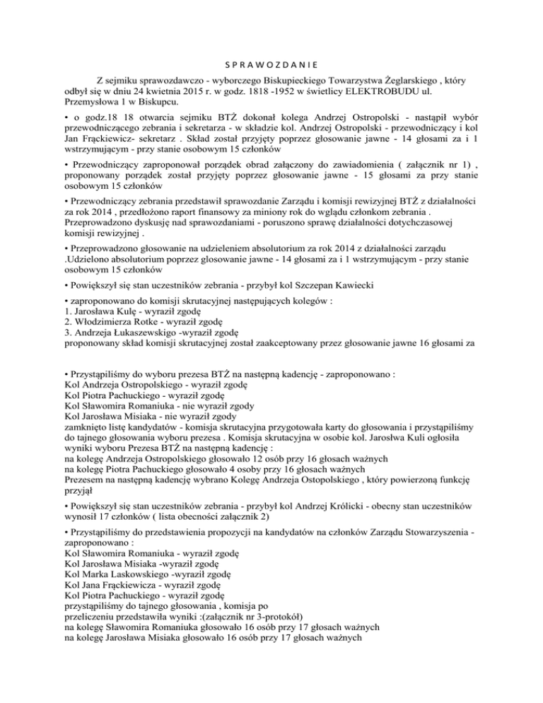SPRAWOZDANIE Z sejmiku sprawozdawczo - wyborczego Biskupieckiego Towarzystwa Żeglarskiego , który odbył się w dniu 24 kwietnia 2015 r. w godz. 1818 -1952 w świetlicy ELEKTROBUDU ul. Przemysłowa 1 w Biskupcu. • o godz.18 18 otwarcia sejmiku BTŻ dokonał kolega Andrzej Ostropolski - nastąpił wybór przewodniczącego zebrania i sekretarza - w składzie kol. Andrzej Ostropolski - przewodniczący i kol Jan Frąckiewicz- sekretarz . Skład został przyjęty poprzez głosowanie jawne - 14 głosami za i 1 wstrzymującym - przy stanie osobowym 15 członków • Przewodniczący zaproponował porządek obrad załączony do zawiadomienia ( załącznik nr 1) , proponowany porządek został przyjęty poprzez głosowanie jawne - 15 głosami za przy stanie osobowym 15 członków • Przewodniczący zebrania przedstawił sprawozdanie Zarządu i komisji rewizyjnej BTŻ z działalności za rok 2014 , przedłożono raport finansowy za miniony rok do wglądu członkom zebrania . Przeprowadzono dyskusję nad sprawozdaniami - poruszono sprawę działalności dotychczasowej komisji rewizyjnej . • Przeprowadzono głosowanie na udzieleniem absolutorium za rok 2014 z działalności zarządu .Udzielono absolutorium poprzez glosowanie jawne - 14 głosami za i 1 wstrzymującym - przy stanie osobowym 15 członków • Powiększył się stan uczestników zebrania - przybył kol Szczepan Kawiecki • zaproponowano do komisji skrutacyjnej następujących kolegów : 1. Jarosława Kulę - wyraził zgodę 2. Włodzimierza Rotke - wyraził zgodę 3. Andrzeja Łukaszewskigo -wyraził zgodę proponowany skład komisji skrutacyjnej został zaakceptowany przez głosowanie jawne 16 głosami za • Przystąpiliśmy do wyboru prezesa BTŻ na następną kadencję - zaproponowano : Kol Andrzeja Ostropolskiego - wyraził zgodę Kol Piotra Pachuckiego - wyraził zgodę Kol Sławomira Romaniuka - nie wyraził zgody Kol Jarosława Misiaka - nie wyraził zgody zamknięto listę kandydatów - komisja skrutacyjna przygotowała karty do głosowania i przystąpiliśmy do tajnego głosowania wyboru prezesa . Komisja skrutacyjna w osobie kol. Jarosłwa Kuli ogłosiła wyniki wyboru Prezesa BTŻ na następną kadencję : na kolegę Andrzeja Ostropolskiego głosowało 12 osób przy 16 głosach ważnych na kolegę Piotra Pachuckiego głosowało 4 osoby przy 16 głosach ważnych Prezesem na następną kadencję wybrano Kolegę Andrzeja Ostopolskiego , który powierzoną funkcję przyjął • Powiększył się stan uczestników zebrania - przybył kol Andrzej Królicki - obecny stan uczestników wynosił 17 członków ( lista obecności załącznik 2) • Przystąpiliśmy do przedstawienia propozycji na kandydatów na członków Zarządu Stowarzyszenia zaproponowano : Kol Sławomira Romaniuka - wyraził zgodę Kol Jarosława Misiaka -wyraził zgodę Kol Marka Laskowskiego -wyraził zgodę Kol Jana Frąckiewicza - wyraził zgodę Kol Piotra Pachuckiego - wyraził zgodę przystąpiliśmy do tajnego głosowania , komisja po przeliczeniu przedstawiła wyniki :(załącznik nr 3-protokół) na kolegę Sławomira Romaniuka głosowało 16 osób przy 17 głosach ważnych na kolegę Jarosława Misiaka głosowało 16 osób przy 17 głosach ważnych na kolegę Marka Laskowskiego głosowało 12 osób przy 17 głosach ważnych na kolegę Jana Frąckiewicza głosowało 8 osób przy 17 głosach ważnych na kolegę Piotra Pachuckiego głosowało 16 osób przy 17 głosach ważnych Komisja uznała wybory i poinformowała ,że w skład zarządu wchodzą : Kolega Sławomir Romaniuk Kolega Jarosław Misiak Kolega Marek Laskowski Kolega Piotr Pachucki • Przystąpiliśmy do przedstawienia kandydatów do komisji Rewizyjnej na następną kadencję . zaproponowano : Kolegę Jana Frąckiewicza Kolegę Krzysztof Gzyla Kolegę Szczepana Kawieckiego W głosowaniu jawnym 17 głosami przyjęto proponowany skład osobowy do komisji Rewizyjnej . • Członkowie Zarządu dokonali osób funkcyjnych na następną kadencję i tak : v-ce prezesem został Kol Jarosław Misiak skarbnikiem został Kol. Piotr Pachucki członkiem zarządu Kol . Sławomir Romaniuk członkiem zarządu Kol. Marek Laskowski Przedstawiono zebranym nowo-wybrany skład zarządu BTŻ • Prezes Andrzej Ostropolski przedstawił plany działalności na rok 2015 i zachęcił do aktywniejszego uczestnictwa w działalności BTŻ . Zaproponował coroczne regaty o Puchar Prezesa BTŻ na dzień 9 maja 2015 roku . Nastąpiła wymiana propozycji ze strony uczestników na tematy uczestnictwa członków w imprezach organizowanych na terenie zaprzyjaźnionych organizacji żeglarskich . • Przewodniczący zebrania otworzył dyskusję nad wnioskami i propozycjami działalności Towarzystwa. Poruszono miedzy innymi : wysokości rekompensaty za nieuczestniczenie w pracach na rzecz BTŻ- pozostawiono wysokość na poziomie 40 zł za godzinę wysokość opłat za korzystanie z naszej przystani dla jednostek obcych - opłaty pozostawiono na dotychczasowym poziomie wniosek Kolegi Jarosława Kuli w sprawie odsprzedaży wyeksploatowanych 3 łodzi będących na majątku BTŻ ( 2 szt. Łódź klasy Laser , 1 szt. Klasy Finn) , które były zakupione przez Kolegę Kulę w ramach sponsoringu w latach poprzednich . Zgromadzenie w ramach głosowania jawnego 17 głosami za-zobowiązała zarząd do wyjaśnienia aspektów prawno-podatkowych ewentualnej odsprzedaży powyższych wyeksploatowanych łodzi . wniosek Kol Andrzeja Ostropolskiego w sprawie w sprawie wykluczenia z listy członków osób , które uchylają się od opłat członkowskich przez okres ostatnich 3 lat oraz nie uczestniczą w działalności Towarzystwa .Po dyskusji zebranie upoważniło Zarząd do postępowania wobec tych osób zgodnie ze statutem BTŻ po wcześniejszym pisemnym powiadomieniu . • Po wyczerpaniu tematów -przewodniczący zakończył sejmik BTŻ o godzinie 19:52 sporządził : Jan Frąckiewicz