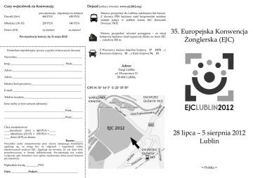 Ceny wejściówek na Konwencję: Dorośli (16+) Dojazd (zobacz również: www.ejc2012.org) pre-rejestracja rejestracja na miejscu 460 PLN 630 PLN Młodzież (10-15) 250 PLN 340 PLN Dzieci (0-9) za darmo! za darmo! Możesz przyjechać do Lublina autobusem lub busem. Z dworca PKS będziesz miał bezpośredni autobus miejski jadący w pobliże terenu EJC (kierunek Dworzec PKP) Pre-rejestracja kończy się 31 maja 2012! Możesz przyjechać również pociągiem – ze stacji kolejowej będziesz miał naprawdę blisko na teren EJC – zaledwie 200 m. Formularz rejestracyjny (proszę wypełnić drukowanymi literami) Z Warszawy możesz dojechać krajową 17 , E372 ; z Rzeszowa krajową 19 ; z Kielc krajową 74, 19. 35. Europejska Konwencja Żonglerska (EJC) Nazwisko:________________________________________________ Imię:________________________________________ Wiek:_______ Adres:____________________________________________________ Adres:____________________________________________________ Adres: Targi Lublin ul. Dworcowa 11 20-406 Lublin, Miasto/kod pocztowy:_____________________________________ E-mail:___________________________________________________ GPS N: 51° 14' 5" E: 22° 33' 55" Telefon (ważne):___________________________________________ Inne osoby (z tym samym adresem): _____________________________________________Wiek:________ _____________________________________________Wiek:________ Chcę zarejestrować: ____dorosłych (16+) x 460 PLN =_____ ____ młodzieży (10-15) x 250 PLN =_____ ____ dzieci (0-9) za darmo Razem:______ Wszystkie osoby zarejestrowane przy użyciu niniejszego formularza zgadzają się, że mogą być na zdjęciach i nagraniach wideo rejestrowanych podczas EJC. Zgadzają się również, by ich dane były przechowywane w formie elektronicznej. Pre-rejestracja jest ważna wyłącznie, gdy formularz oraz opłata rejestracyjna dotrą przed końcem pre-rejestracji. Wpłaciłem kwotę _________PLN Data:_____________Podpis:______________________________ 28 lipca – 5 sierpnia 2012 Lublin < Polska > Drodzy Żonglerzy, Chcielibyśmy serdecznie zaprosić Was na 35. Europejską Konwencję Żonglerską odbywającą się w Lublinie. Przez 9 dni, od 28 lipca do 5 sierpnia będziesz mógł tu spotkać ludzi zainteresowanych szeroko pojętą żonglerką, akrobatyką oraz sztukami ruchu – ludzi z całego świata; aktywnych, twórczych, pełnych pasji, mających pozytywny stosunek do swojego rozwoju, zabawy i innych osób. Mamy dwie duże hale, gdzie możecie trenować, oraz pole namiotowe w parku. To pozwoli Wam żonglować przez 24h na dobę, spotykać się ze znajomymi oraz świetnie się bawić. Więcej informacji, jak również formularz rejestracyjny znajdziecie na stronie: www.ejc2012.org Zakwaterowanie Od soboty, 28 lipca, pole namiotowe będzie dostępne w parku tuż obok hal. Nie będzie można parkować samochodów na terenie pola namiotowego, ale będzie możliwość skorzystania z parkingu dla samochodów campingowych przed halą. Nie wolno wprowadzać psów na pole namiotowe i pozostałe przestrzenie Konwencji. Jedzenie Na terenie EJC będą stanowiska, gdzie można będzie kupić coś do zjedzenia. Znajdziesz tam zarówno coś na śniadanie, jak i gorące posiłki (również wegetariańskie). Kontakt i informacje Fundacja Sztukmistrze ul. Ogrodowa 17/8 20-075 Lublin www.ejc2012.org [email protected] Co się będzie działo? (więcej na: www.ejc2012.org) Różnorodne warsztaty, codzienne open stage i special stage, show otwierające, kolorowa parada i igrzyska żonglerskie, wielka Gala Show oraz dużo, dużo więcej... Wstępny program Sobota, 28 lipca, 12.00 Otwarcie EJC i pola namiotowego Niedziela, 29 lipca Show otwierające Wtorek, 30 lipca Walne Zgromadzenie (członków EJA) Środa, 1 sierpnia Fire Night Piątek, 3 sieprnia Gala Show Sobota, 4 sierpnia Parada, Igrzyska, Fire Gala Show Niedziela, 5 sierpnia, 15.00 Koniec. Szerokiej drogi do domu! Ta konwencja jest organizowana w duchu: przez żonglerów dla żonglerów, dlatego będziemy wdzięczni za pomoc: przeprowadzenie warsztatów, występ na open stage czy renegade, dyżur przy kontroli opasek, itd. Bądź częścią EJC! Nie wahaj się, każda para rąk się przyda! Pre-rejestracja kończy się 31 maja 2012! Wypełnij formularz, który znajduje się po prawej stronie i odeślij na adres: Fundacja Sztukmistrze ul. Ogrodowa 17/8 20-075 Lublin lub zarejestruj się on-line na www.ejc2012.org/prereg Wpłaty dokonaj na konto: 20 1540 1144 2114 6407 6434 0001 Fundacja Sztukmistrze ul. Królowej Jadwigi 19/56 20-282 Lublin Cena zawiera: dostęp do przestrzeni treningowej (hale), pokazów i spektakli, możliwość uczestniczenia w warsztatach, igrzyskach, nocleg na polu namiotowym oraz dostęp do wielu innych atrakcji... Fundacja Sztukmistrze ul. Ogrodowa 17/8 20-075 Lublin Zapraszamy na Europejską Konwencję Żonglerską 2012! Chciałbym/chciałabym... ...otrzymywać mailem informacje o Europejskim Stowarzyszeniu Żonglerskim (EJA) oraz przyszłych EJC …zaoferować organizatorom: _______________________________________________ _______________________________________________ … żeby podczas EJC... ________________________________________________ _______________________________________________
