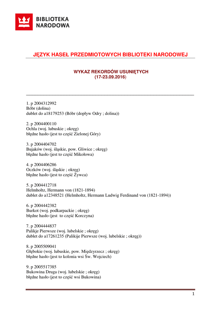 JĘZYK HASEŁ PRZEDMIOTOWYCH BIBLIOTEKI NARODOWEJ WYKAZ REKORDÓW USUNIĘTYCH (17-23.09.2016) __________________________________________________________ 1. p 2004312992 Bóbr (dolina) dublet do a18179253 (Bóbr (dopływ Odry ; dolina)) 2. p 2004400110 Ochla (woj. lubuskie ; okręg) błędne hasło (jest to część Zielonej Góry) 3. p 2004404702 Bujaków (woj. śląskie, pow. Gliwice ; okręg) błędne hasło (jest to część Mikołowa) 4. p 2004406286 Oczków (woj. śląskie ; okręg) błędne hasło (jest to część Żywca) 5. p 2004412718 Helmholtz, Hermann von (1821-1894) dublet do a12348521 (Helmholtz, Hermann Ludwig Ferdinand von (1821-1894)) 6. p 2004442382 Burkot (woj. podkarpackie ; okręg) błędne hasło (jest to część Korczyna) 7. p 2004444837 Palikje Pierwsze (woj. lubelskie ; okręg) dublet do a17261235 (Palikije Pierwsze (woj. lubelskie ; okręg)) 8. p 2005509041 Głębokie (woj. lubuskie, pow. Międzyrzecz ; okręg) błędne hasło (jest to kolonia wsi Św. Wojciech) 9. p 2005517385 Bukowina Druga (woj. lubelskie ; okręg) błędne hasło (jest to część wsi Bukowina) 1 10. p 2006539137 Ordynki (woj. podlaskie ; okręg) dublet do a25233567 (Odrynki (woj. podlaskie ; okręg)) 11. p 2006544014 Pajęczno (woj. lubuskie ; okręg) błędne hasło (jest to część wsi Sterków) 12. p 2006801781 Kurowski, Apolinary dublet do rekordu a30338359 (Kurowski, Apolinary (1937- )) 13. p 2007621461 Obrowo (woj. kujawsko-pomorskie, pow. Toruń ; okręg) dublet do a19517993 (Obrowo (woj. kujawsko-pomorskie ; okręg) 14. p 2007628782 Okunin (woj. mazowieckie ; okręg) błędne hasło (jest to część Nowego Dworu Maz.) 15. p 2008004363 Osełków (woj. świętokrzyskie ; okręg) błędne hasło (jest to część wsi Łączna) 16. p 2008053358 Arkuszów (woj. świętokrzyskie ; okręg) błędne hasło (jest część miejscowości Rakówka) 17. p 2008053392 Borówno (woj. wielkopolskie ; okręg) błędne hasło (jest to część miejscowości Mroczeń) 18. p 2008054874 Grabowo (woj. pomorskie, pow. Gdańsk ; okręg) błędne hasło (jest to przysiółek wsi i nie może mieć "okręgu") 19. p 2008054891 Osiek (woj. lubuskie, pow. Strzelce Krajeńskie ; okręg) dublet do a17495830 (Osiek (woj. lubuskie ; okręg)) 20. p 2010014193 Bóbr (dolina) komunikacja dublet do a18524758 (Bóbr (dopływ Odry ; dolina) komunikacja) 21. p 2010014194 Bóbr (dolina) turystyka dublet do a19000546 (Bóbr (dopływ Odry ; dolina) turystyka) 22. p 2012003108 Bóbr (dolina) geologia dublet do a21633617 (Bóbr (dopływ Odry ; dolina) geologia) 2 23. p 2015176526 Gautier, Brigitte (1958- ) dublet do a19393556 (Gautier, Brigitte (1954- )) 24. p 2016094577 Batkiewicz, Michał dublet do a19334564 (Batkiewicz, Michał (1957- )) 25. p 2016106934 Szydłowiec (woj. mazowiecki ; pow. Szydłowiec) dublet do a10178715 (Szydłowiec (woj. mazowieckie)) 26. p 2016307425 Łyka-Kosińska, Kamila (1987- ) dublet do a33582956 (Łyłka-Kosińska, Kamila (1987- )) 27. p 2016377571 Heide, F. dublet do a2795531x (Heide, Franz (1801-1867)) 28. p 2016378632 Hellmich, M. dublet do a20061316 ( Hellmich, Max (1867-1937)) 29. p 2016391678 Wykluczenie społeczne zapobieganie i zwalczanie Polska 21 w. błędne hasło 30. p 2016391686 Wykluczenie cyfrowe zapobieganie i zwalczanie Polska 21 w. błędne hasło 31. p 2016392079 Łusze (Litwa) dublet do a25512079 (Łusza (Litwa)) 3
