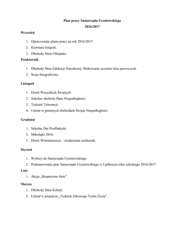 Plan pracy Samorządu Uczniowskiego 2016/2017 Wrzesień 1. Opracowanie planu pracy na rok 2016/2017. 2. Kiermasz książek. 3. Obchody Dnia Chłopaka. Październik 1. Obchody Dnia Edukacji Narodowej. Ślubowanie uczniów klas pierwszych. 2. Sesja fotograficzna. Listopad 1. Dzień Wszystkich Świętych. 2. Szkolne obchody Dnia Niepodległości. 3. Tydzień Tolerancji. 4. Udział w gminnych obchodach Święta Niepodległości. Grudzień 1. Szkolne Dni Profilaktyki. 2. Mikołajki 2016. 3. Dzień Wolontariusza – rozdawanie serduszek. Styczeń 1. Wybory do Samorządu Uczniowskiego. 2. Podsumowanie prac Samorządu Uczniowskiego w I półroczu roku szkolnego 2016/2017. Luty 1. Akcja „Bezpieczne ferie”. Marzec 1. Obchody Dnia Kobiet. 2. Udział w projekcie „Tydzień Zdrowego Trybu Życia”. Kwiecień 1. Obchody Święta Szkoły i finał konkursu „Super klasa 2016/2017”. 2. Wyjazd do Siekierek. 3. Apel z okazji uroczystego wręczenia świadectw ukończenia szkoły kl. III LO, IV TZ i III LD. Maj 1. Udział w uroczystościach z okazji Święta Konstytucji 3 Maja. Czerwiec 1. Obchody Dnia Dziecka. 2. Podsumowanie prac Samorządu Uczniowskiego w bieżącym roku i zaplanowanie działań na następny rok szkolny. 3. Zakończenie roku szkolnego 2016/2017. Cały rok szkolny: 1. Organizacja i udział w akcjach charytatywnych m.in. Góra Grosza, WOŚP, „Szkoło Pomóż i Ty” 2. Współorganizacja uroczystości szkolnych. 3. Kontakt z nauczycielami i pomoc w organizowanych przez nich konkursach i imprezach. 4. Przekazywanie informacji na stronę internetową szkoły. 5. Prowadzenie gabloty Samorządu Uczniowskiego. 6. Przygotowywanie artykułów do szkolnej gazety Wióry. 7. Organizowane przedsięwzięć w ramach współzawodnictwa klas o tytuł „Super Klasy”.