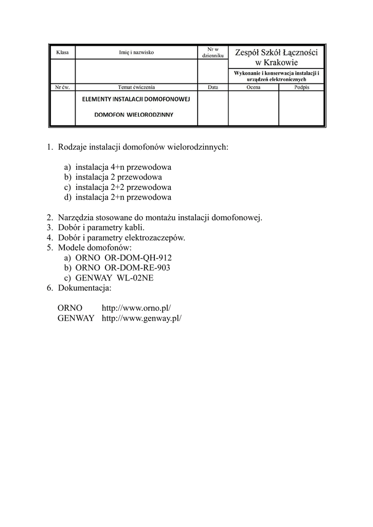 1. Rodzaje instalacji domofonów wielorodzinnych: a) b) c) d) instalacja 4+n przewodowa instalacja 2 przewodowa instalacja 2+2 przewodowa instalacja 2+n przewodowa Narzędzia stosowane do montażu instalacji domofonowej. Dobór i parametry kabli. Dobór i parametry elektrozaczepów. Modele domofonów: a) ORNO OR-DOM-QH-912 b) ORNO OR-DOM-RE-903 c) GENWAY WL-02NE 6. Dokumentacja: 2. 3. 4. 5. ORNO http://www.orno.pl/ GENWAY http://www.genway.pl/