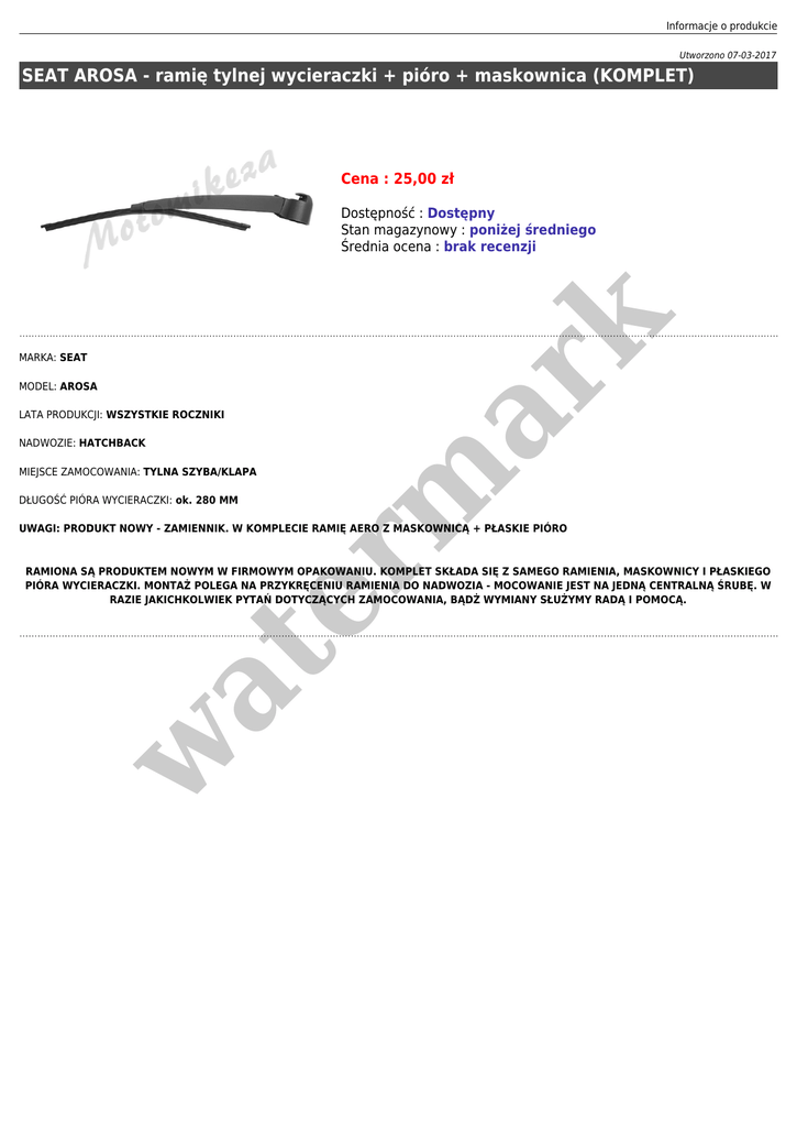 Informacje o produkcie Utworzono 07-03-2017 SEAT AROSA - ramię tylnej wycieraczki + pióro + maskownica (KOMPLET) Cena : 25,00 zł MARKA: SEAT MODEL: AROSA er m ar k Dostępność : Dostępny Stan magazynowy : poniżej średniego Średnia ocena : brak recenzji LATA PRODUKCJI: WSZYSTKIE ROCZNIKI NADWOZIE: HATCHBACK MIEJSCE ZAMOCOWANIA: TYLNA SZYBA/KLAPA DŁUGOŚĆ PIÓRA WYCIERACZKI: ok. 280 MM UWAGI: PRODUKT NOWY - ZAMIENNIK. W KOMPLECIE RAMIĘ AERO Z MASKOWNICĄ + PŁASKIE PIÓRO w at RAMIONA SĄ PRODUKTEM NOWYM W FIRMOWYM OPAKOWANIU. KOMPLET SKŁADA SIĘ Z SAMEGO RAMIENIA, MASKOWNICY I PŁASKIEGO PIÓRA WYCIERACZKI. MONTAŻ POLEGA NA PRZYKRĘCENIU RAMIENIA DO NADWOZIA - MOCOWANIE JEST NA JEDNĄ CENTRALNĄ ŚRUBĘ. W RAZIE JAKICHKOLWIEK PYTAŃ DOTYCZĄCYCH ZAMOCOWANIA, BĄDŻ WYMIANY SŁUŻYMY RADĄ I POMOCĄ.