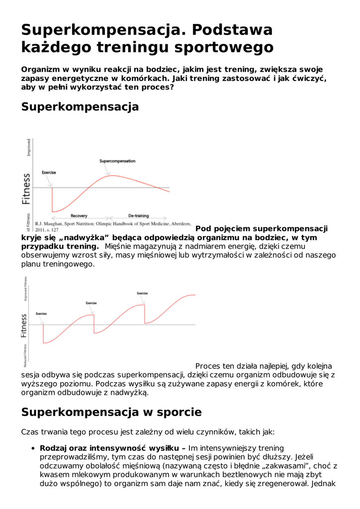 Superkompensacja. Podstawa każdego treningu sportowego Organizm w wyniku reakcji na bodziec, jakim jest trening, zwiększa swoje zapasy energetyczne w komórkach. Jaki trening zastosować i jak ćwiczyć, aby w pełni wykorzystać ten proces? Superkompensacja Pod pojęciem superkompensacji kryje się „nadwyżka” będąca odpowiedzią organizmu na bodziec, w tym przypadku trening. Mięśnie magazynują z nadmiarem energię, dzięki czemu obserwujemy wzrost siły, masy mięśniowej lub wytrzymałości w zależności od naszego planu treningowego. Proces ten działa najlepiej, gdy kolejna sesja odbywa się podczas superkompensacji, dzięki czemu organizm odbudowuje się z wyższego poziomu. Podczas wysiłku są zużywane zapasy energii z komórek, które organizm odbudowuje z nadwyżką. Superkompensacja w sporcie Czas trwania tego procesu jest zależny od wielu czynników, takich jak: Rodzaj oraz intensywność wysiłku – Im intensywniejszy trening przeprowadziliśmy, tym czas do następnej sesji powinien być dłuższy. Jeżeli odczuwamy obolałość mięśniową (nazywaną często i błędnie „zakwasami”, choć z kwasem mlekowym produkowanym w warunkach beztlenowych nie mają zbyt dużo wspólnego) to organizm sam daje nam znać, kiedy się zregenerował. Jednak w przypadku braku DOMS – delayed-onset muscle soreness (opóźniony ból mięśni) również może dojść do przetrenowania, który spowoduje zatrzymanie, a nawet pogorszenie rezultatów. W okresie kiedy występują charakterystyczne dla DOMS objawy następuje kilkunastoprocentowy spadek siły, a mięśnie są sztywniejsze niż zazwyczaj. Jednak wykonywanie w tym czasie treningów, nie wpływa dodatkowo na zwiększenie bólu. Warto więc wsłuchać się w swój organizm, ponieważ poza wzrostem frustracji, taki stan jest prostą drogą do kontuzji wywołanej nieprawidłową techniką wykonywania ćwiczeń. Cykl treningowy, którym ćwiczymy Prawidłowe odżywianie i dostarczanie odpowiednio wysokiej ilość energii: Te dwa czynniki są współzależne, ponieważ jeżeli jesteśmy w trakcie redukcji tkanki tłuszczowej to nasz bilans kaloryczny jest ujemny przez co regeneracja może się wydłużyć. Odwrotną sytuację obserwuje się w czasie budowania masy lub siły, gdy dostarczamy nadwyżki kalorycznej. W takim przypadku większość osób nie ma problemów z regeneracją przy przestrzeganiu pozostałych zasad. Długość oraz jakość snu: Optymalna długość snu jest cechą indywidualną, jednak większości osób jest potrzebne 7–8 godzin nieprzerwanego snu. Poza długością snu warto zadbać o optymalną temperaturę oraz wilgotność powietrza w sypialni. Czas od poprzedniego treningu: Kolejną zasadą jest odpoczynek od ostatniej sesji treningowej. Im trening był cięższy i więcej grup mięśniowych angażował, tym przerwa powinna być dłuższa. Na przystosowanie się do wysiłku mogą mieć wpływ inne aktywności, które pobudzają organizm do odbudowy, nie zużywając przy tym zbyt dużych rezerw energii. Stan zdrowia, suplementacja W przypadku choroby, np. przeziębienia, czas potrzebny na zregenerowanie się organizmu zostaje wydłużony. Z drugiej strony są na rynku suplementy mogące pozytywnie wpłynąć na regenerację organizmu. Zaliczamy do nich carbo/vitargo, kreatynę oraz bcaa. Pamiętajmy jednak, że same suplementy nie są w stanie odbudować rezerw energii zużytej podczas treningu, dlatego warto potraktować je jako dodatek uzupełniający nasze działania. Zasada działania tego procesu jest stała, jednak każdy musi dostosować częstotliwość i intensywność treningów do własnych możliwości tak, aby uniknąć przetrenowania i osiągać jak najlepsze rezultaty. Nie warto stosować się do sztywnych wytycznych, które możemy bez problemu znaleźć w Internecie, ponieważ sami musimy dostosować czas odpoczynku do aktualnej sytuacji, z uwzględnieniem naszego wytrenowania, metody treningu, diety, trybu pracy oraz snu. Author: Damian Adamiak Link do artykułu: http://bonavita.pl/superkompensacja-podstawa-kazdego-treningusportowego