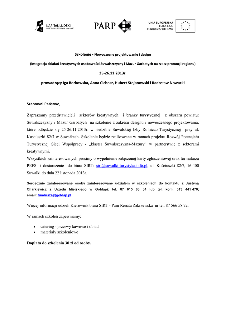 Szkolenie - Nowoczesne projektowanie i design (integracja działań kreatywnych osobowości Suwalszczyzny i Mazur Garbatych na rzecz promocji regionu) 25-26.11.2013r. prowadzący Iga Borkowska, Anna Cichosz, Hubert Stojanowski i Radosław Nowacki Szanowni Państwo, Zapraszamy przedstawicieli sektorów kreatywnych i branży turystycznej z obszaru powiatu: Suwalszczyzny i Mazur Garbatych na szkolenie z zakresu designu i nowoczesnego projektowania, które odbędzie się 25-26.11.2013r. w siedzibie Suwalskiej Izby Rolniczo-Turystycznej przy ul. Kościuszki 82/7 w Suwałkach. Szkolenie będzie realizowane w ramach projektu Rozwój Potencjału Turystycznej Sieci Współpracy - „klaster Suwalszczyzna-Mazury” w partnerstwie z sektorami kreatywnymi. Wszystkich zainteresowanych prosimy o wypełnienie załączonej karty zgłoszeniowej oraz formularza PEFS i dostarczenie do biura SIRT: [email protected], ul. Kościuszki 82/7, 16-400 Suwałki do dnia 22 listopada 2013r. Serdecznie zainteresowane osoby zainteresowane udziałem w szkoleniach do kontaktu z Justyną Charkiewicz z Urzędu Miejskiego w Gołdapi: tel. 87 615 60 34 lub tel. kom. 513 441 470; email: [email protected] Więcej informacji udzieli Kierownik biura SIRT - Pani Renata Zakrzewska nr tel. 87 566 58 72. W ramach szkoleń zapewniamy: catering - przerwy kawowe i obiad materiały szkoleniowe Dopłata do szkolenia 30 zł od osoby. P ROGRAM SZKOLENIA 25 listopada 2013r. 8.30-11.30 Blok szkoleniowy - Podstawowe zasady sztuki design’u i nowoczesne trendy w projektowaniu, prowadzący – Anna Cichosz /Fashion Designer/ 11.30 – 12.00 Przerwa kawowa 12.00 – 15.30 Blok szkoleniowy - Nowoczesny design w projektowaniu banerów, stron i portali internetowych, prowadzący - Iga Borkowska /Wiejska Pracownia Projektowa TUTAJ/ 13.30 - 14.00 Obiad 26 listopada 2013r. 8.30 – 11.30 Blok szkoleniowy - Profesjonalne przygotowanie do prezentacji oferty (grafika - layuot, redakcja tekstu, animacja), prowadzący –– Radek Nowacki /Black Stork Studio/ 11.30 – 12.00 Przerwa 12.00 – 15.30 Blok szkoleniowy - Podstawowe zasady tworzenia i odbioru fotografii i filmu (część I), prowadzący – Hubert Stojanowski 13.30 - 14.00 Obiad Szkolenie praktyczne połączone z wypracowaniem kreatywnych propozycji w zakresie design’u strony internetowej projektu Kraina Jaćwingów oraz jej poszczególnych elementów: planer turystyczny, prezentacja sektorów kreatywnych, prezentacja regionów – partnerów projektu, prezentacja ofert produktowych (ze strony ekspertów prowadzących: konspekt zajęć i materiały szkoleniowe /w tym „lista podstawowych zasad”/, scenariusze, zdjęcia, grafika, layout do czołówki filmu, strony internetowej i jej elementów, ulotki, kreatywny opis promocyjny). Dziedziny projektowania i design’u (propozycje wstępne): - podstawowe zasady sztuki design’u i nowoczesne trendy w projektowaniu – Anna Cichosz (Fashion Designer) - profesjonalne przygotowanie do prezentacji oferty (fotografia, film, grafika - layuot, redakcja tekstu, animacja) - Hubert Stojanowski, Radek Nowacki - Black Stork Studio - nowoczesny design w projektowaniu banerów, stron i portali internetowych – Hubert Stojanowski, Iga Borkowska Wiejska Pracowania projektowa TUTAJ), Radek Nowacki Black Stork Studio, - projektowanie materiałów promocyjnych (ulotki, foldery, wizytówki, pocztówki, mapy i przewodniki) – Iga Borkowska - projektowanie pamiątek regionalnych – Iga Borkowska, Anna Cichosz