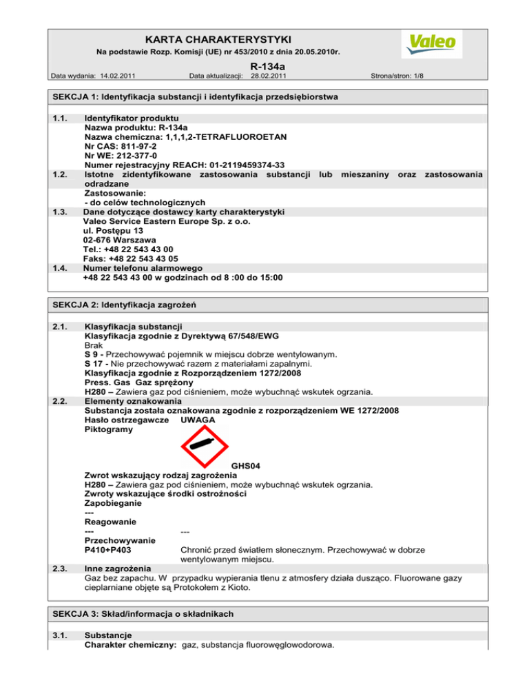 KARTA CHARAKTERYSTYKI Na podstawie Rozp. Komisji (UE) nr 453/2010 z dnia 20.05.2010r. R-134a Data wydania: 14.02.2011 Data aktualizacji: 28.02.2011 Strona/stron: 1/8 SEKCJA 1: Identyfikacja substancji i identyfikacja przedsiębiorstwa 1.1. 1.2. 1.3. 1.4. Identyfikator produktu Nazwa produktu: R-134a Nazwa chemiczna: 1,1,1,2-TETRAFLUOROETAN Nr CAS: 811-97-2 Nr WE: 212-377-0 Numer rejestracyjny REACH: 01-2119459374-33 Istotne zidentyfikowane zastosowania substancji lub mieszaniny oraz zastosowania odradzane Zastosowanie: - do celów technologicznych Dane dotyczące dostawcy karty charakterystyki Valeo Service Eastern Europe Sp. z o.o. ul. Postępu 13 02-676 Warszawa Tel.: +48 22 543 43 00 Faks: +48 22 543 43 05 Numer telefonu alarmowego +48 22 543 43 00 w godzinach od 8 :00 do 15:00 SEKCJA 2: Identyfikacja zagroŜeń 2.1. 2.2. 2.3. Klasyfikacja substancji Klasyfikacja zgodnie z Dyrektywą 67/548/EWG Brak S 9 - Przechowywać pojemnik w miejscu dobrze wentylowanym. S 17 - Nie przechowywać razem z materiałami zapalnymi. Klasyfikacja zgodnie z Rozporządzeniem 1272/2008 Press. Gas Gaz spręŜony H280 – Zawiera gaz pod ciśnieniem, moŜe wybuchnąć wskutek ogrzania. Elementy oznakowania Substancja została oznakowana zgodnie z rozporządzeniem WE 1272/2008 Hasło ostrzegawcze UWAGA Piktogramy GHS04 Zwrot wskazujący rodzaj zagroŜenia H280 – Zawiera gaz pod ciśnieniem, moŜe wybuchnąć wskutek ogrzania. Zwroty wskazujące środki ostroŜności Zapobieganie --Reagowanie ----Przechowywanie P410+P403 Chronić przed światłem słonecznym. Przechowywać w dobrze wentylowanym miejscu. Inne zagroŜenia Gaz bez zapachu. W przypadku wypierania tlenu z atmosfery działa dusząco. Fluorowane gazy cieplarniane objęte są Protokołem z Kioto. SEKCJA 3: Skład/informacja o składnikach 3.1. Substancje Charakter chemiczny: gaz, substancja fluorowęglowodorowa. KARTA CHARAKTERYSTYKI Na podstawie Rozp. Komisji (UE) nr 453/2010 z dnia 20.05.2010r. R-134a Data wydania: 14.02.2011 Data aktualizacji: 28.02.2011 Strona/stron: 2/8 Masa cząsteczkowa: 102,6 g/mol Nazwa substancji Identyfikator Klasyfikacja 67/548/EWG Klasyfikacja 1272/2008 1,1,1,2TETRAFLUOROETAN Nr CAS: 811-97-2 Nr WE: 212-377-0 Nr rejestracyjny REACH: 012119459374-33 C2H2F4 --- Press. Gas Wzór sumaryczny: % wag H280 100 Wzór strukturalny: SEKCJA 4: Środki pierwszej pomocy 4.1. 4.2. 4.3. Opis środków pierwszej pomocy Następstwa wdychania: Wyprowadzić poszkodowana osobę na świeŜe powietrze. UłoŜyć w wygodnej pozycji. Zapewnić ciepło i spokój. Następstwa połknięcia: Nie ma moŜliwości zaistnienia. Kontakt z oczami: • Usunąć szkła kontaktowe. Przemyć oczy większą ilością letniej wody przez 15 minut, przy wywiniętych powiekach. • W razie potrzeby zapewnić pomoc okulisty Kontakt ze skórą: • Następstwa są takie, jak w przypadku odmroŜeń. Przemyć odmroŜone miejsce większą ilością wody. • W razie potrzeby zapewnić pomoc dermatologa. NajwaŜniejsze ostre i opóźnione objawy oraz skutki naraŜenia Odśrodkowy układ nerwowy. Efekt narkotyczny Zaburzenia serca Wskazania dotyczące wszelkiej natychmiastowej pomocy lekarskiej i szczególnego postępowania z poszkodowanym W miejscu pracy powinny być dostępne środki umoŜliwiające pomoc przedlekarską. Osoby udzielające pierwszej pomocy powinny posiadać rękawiczki medyczne. Informacja dla lekarzy: Nie podawać katecholamin (z uwagi na efekty kardiologiczne wywoływane przez produkt). SEKCJA 5: Postępowanie w przypadku poŜaru 5.1. 5.2. Środki gaśnicze Odpowiednie środki gaśnicze do gaszenia poŜarów w sąsiedztwie: Stosować środki w zaleŜności od natury i rozmiaru poŜaru. Prądy wodne rozproszone, ditlenek węgla CO2. Niewłaściwe środki gaśnicze: Brak Szczególne zagroŜenia związane z substancją lub mieszaniną Gaz, niepalny. W wyniku działania wysokiej temperatury, pojemnik moŜe ulec gwałtownemu rozszczelnieniu z wydzieleniem szkodliwych gazów i aerozoli. Produkty spalania: Podczas działania wysokich temperatur tworzy się fluorowodór. KARTA CHARAKTERYSTYKI Na podstawie Rozp. Komisji (UE) nr 453/2010 z dnia 20.05.2010r. R-134a Data wydania: 14.02.2011 5.3. Data aktualizacji: 28.02.2011 Strona/stron: 3/8 Mieszaniny wybuchowe: Nie dotyczy. Zbiorniki i inne opakowania oraz instalacje z gazem naraŜone na działanie ognia lub wysokiej temperatury mogą eksplodować i naleŜy je intensywnie schładzać wodą.. Informacje dla straŜy poŜarnej NaraŜenie na działanie ognia moŜe spowodować rozerwanie / wybuch pojemnika. Stosować standardowe metody gaszenia poŜarów. Zbiorniki i instalacje naraŜone na działanie wysokiej temperatury chłodzić wodą i w miarę moŜliwości usunąć z zagroŜonego obszaru. MoŜe się gromadzić w przestrzeniach zamkniętych, szczególnie na poziomie lub poniŜej poziomu terenu. Sprzęt ochronny straŜaków: Ubrania odporne na działanie wysokich temperatur. NiezaleŜne aparaty izolujące drogi oddechowe. W razie zagroŜenia rozerwaniem pojemników. Gasić poŜar z zabezpieczonych stanowisk. SEKCJA 6: Postępowanie w przypadku niezamierzonego uwolnienia do środowiska 6.1. 6.2. 6.3. 6.4. Indywidualne środki ostroŜności, wyposaŜenie ochronne i procedury w sytuacjach awaryjnych Osoby udzielające pomocy powinny posiadać ubrania ochronne przeciwchemiczne, gazoszczelne, rękawice ochronne, szczelne okulary ochronne oraz ochrony dróg oddechowych. Unikać kontaktu ze skórą i oczami Usunąć wszystkie źródła zapłonu. Nie palić Nie wdychać par Zatrzymać wyciek. W przypadku niezamierzonego wydostania się gazu do otoczenia, nakazać opuszczenie obszaru działań ratowniczym osobom postronnym. Postępować zgodnie z instrukcją alarmową Ostrzec okoliczną ludność. Środki ostroŜności w zakresie ochrony środowiska Nie dopuścić do niekontrolowanej emisji do środowiska. Metody i materiały zapobiegające rozprzestrzenianiu się skaŜenia i słuŜące do usuwania skaŜenia Usunąć w