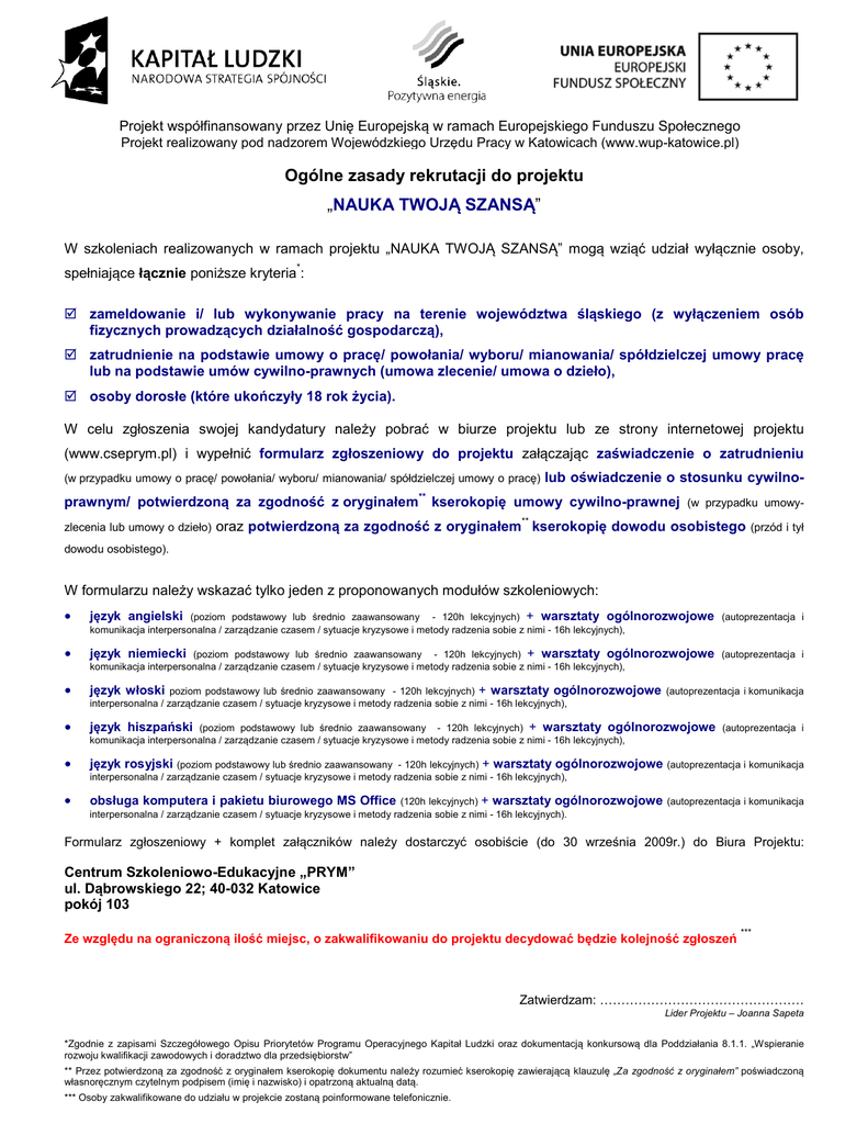 Projekt współfinansowany przez Unię Europejską w ramach Europejskiego Funduszu Społecznego Projekt realizowany pod nadzorem Wojewódzkiego Urzędu Pracy w Katowicach (www.wup-katowice.pl) Ogólne zasady rekrutacji do projektu „NAUKA TWOJĄ SZANSĄ” W szkoleniach realizowanych w ramach projektu „NAUKA TWOJĄ SZANSĄ” mogą wziąć udział wyłącznie osoby, spełniające łącznie poniższe kryteria : * zameldowanie i/ lub wykonywanie pracy na terenie województwa śląskiego (z wyłączeniem osób fizycznych prowadzących działalność gospodarczą), zatrudnienie na podstawie umowy o pracę/ powołania/ wyboru/ mianowania/ spółdzielczej umowy pracę lub na podstawie umów cywilno-prawnych (umowa zlecenie/ umowa o dzieło), osoby dorosłe (które ukończyły 18 rok życia). W celu zgłoszenia swojej kandydatury należy pobrać w biurze projektu lub ze strony internetowej projektu (www.cseprym.pl) i wypełnić formularz zgłoszeniowy do projektu załączając zaświadczenie o zatrudnieniu (w przypadku umowy o pracę/ powołania/ wyboru/ mianowania/ spółdzielczej umowy o pracę) lub oświadczenie o stosunku cywilno- prawnym/ potwierdzoną za zgodność z oryginałem kserokopię umowy cywilno-prawnej (w przypadku umowy** zlecenia lub umowy o dzieło) oraz potwierdzoną za zgodność z oryginałem kserokopię dowodu osobistego (przód i tył ** dowodu osobistego). W formularzu należy wskazać tylko jeden z proponowanych modułów szkoleniowych: • język angielski • język niemiecki • język włoski • język hiszpański (poziom podstawowy lub średnio zaawansowany - 120h lekcyjnych) + warsztaty ogólnorozwojowe (autoprezentacja i komunikacja interpersonalna / zarządzanie czasem / sytuacje kryzysowe i metody radzenia sobie z nimi - 16h lekcyjnych), • język rosyjski (poziom podstawowy lub średnio zaawansowany • obsługa komputera i pakietu biurowego MS Office (120h lekcyjnych) + warsztaty ogólnorozwojowe (autoprezentacja i komunikacja interpersonalna / zarządzanie czasem / sytuacje kryzysowe i metody radzenia sobie z nimi - 16h lekcyjnych). (poziom podstawowy lub średnio zaawansowany - 120h lekcyjnych) + warsztaty ogólnorozwojowe (autoprezentacja i komunikacja interpersonalna / zarządzanie czasem / sytuacje kryzysowe i metody radzenia sobie z nimi - 16h lekcyjnych), (poziom podstawowy lub średnio zaawansowany - 120h lekcyjnych) + warsztaty ogólnorozwojowe (autoprezentacja i komunikacja interpersonalna / zarządzanie czasem / sytuacje kryzysowe i metody radzenia sobie z nimi - 16h lekcyjnych), poziom podstawowy lub średnio zaawansowany - 120h lekcyjnych) + warsztaty ogólnorozwojowe (autoprezentacja i komunikacja interpersonalna / zarządzanie czasem / sytuacje kryzysowe i metody radzenia sobie z nimi - 16h lekcyjnych), - 120h lekcyjnych) + warsztaty ogólnorozwojowe (autoprezentacja i komunikacja interpersonalna / zarządzanie czasem / sytuacje kryzysowe i metody radzenia sobie z nimi - 16h lekcyjnych), Formularz zgłoszeniowy + komplet załączników należy dostarczyć osobiście (do 30 września 2009r.) do Biura Projektu: Centrum Szkoleniowo-Edukacyjne „PRYM” ul. Dąbrowskiego 22; 40-032 Katowice pokój 103 Ze względu na ograniczoną ilość miejsc, o zakwalifikowaniu do projektu decydować będzie kolejność zgłoszeń *** Zatwierdzam: ………………………………………… Lider Projektu – Joanna Sapeta *Zgodnie z zapisami Szczegółowego Opisu Priorytetów Programu Operacyjnego Kapitał Ludzki oraz dokumentacją konkursową dla Poddziałania 8.1.1. „Wspieranie rozwoju kwalifikacji zawodowych i doradztwo dla przedsiębiorstw” ** Przez potwierdzoną za zgodność z oryginałem kserokopię dokumentu należy rozumieć kserokopię zawierającą klauzulę „Za zgodność z oryginałem” poświadczoną własnoręcznym czytelnym podpisem (imię i nazwisko) i opatrzoną aktualną datą. *** Osoby zakwalifikowane do udziału w projekcie zostaną poinformowane telefonicznie.