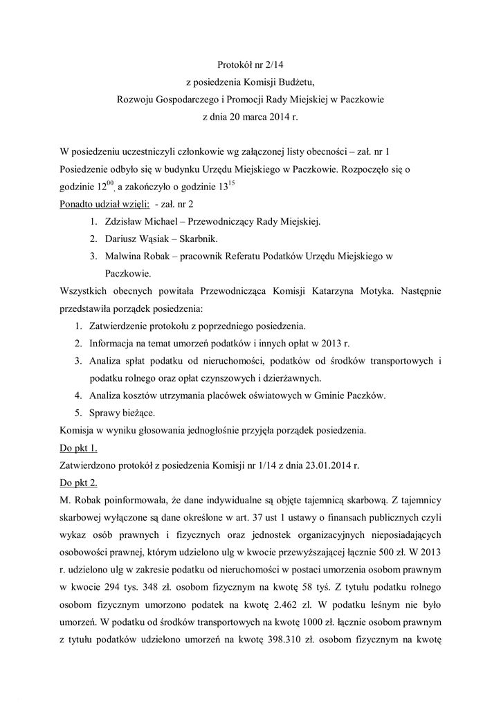 Protokół nr 2/14 z posiedzenia Komisji Budżetu, Rozwoju Gospodarczego i Promocji Rady Miejskiej w Paczkowie z dnia 20 marca 2014 r. W posiedzeniu uczestniczyli członkowie wg załączonej listy obecności – zał. nr 1 Posiedzenie odbyło się w budynku Urzędu Miejskiego w Paczkowie. Rozpoczęło się o godzinie 1200, a zakończyło o godzinie 1315 Ponadto udział wzięli: - zał. nr 2 1. Zdzisław Michael – Przewodniczący Rady Miejskiej. 2. Dariusz Wąsiak – Skarbnik. 3. Malwina Robak – pracownik Referatu Podatków Urzędu Miejskiego w Paczkowie. Wszystkich obecnych powitała Przewodnicząca Komisji Katarzyna Motyka. Następnie przedstawiła porządek posiedzenia: 1. Zatwierdzenie protokołu z poprzedniego posiedzenia. 2. Informacja na temat umorzeń podatków i innych opłat w 2013 r. 3. Analiza spłat podatku od nieruchomości, podatków od środków transportowych i podatku rolnego oraz opłat czynszowych i dzierżawnych. 4. Analiza kosztów utrzymania placówek oświatowych w Gminie Paczków. 5. Sprawy bieżące. Komisja w wyniku głosowania jednogłośnie przyjęła porządek posiedzenia. Do pkt 1. Zatwierdzono protokół z posiedzenia Komisji nr 1/14 z dnia 23.01.2014 r. Do pkt 2. M. Robak poinformowała, że dane indywidualne są objęte tajemnicą skarbową. Z tajemnicy skarbowej wyłączone są dane określone w art. 37 ust 1 ustawy o finansach publicznych czyli wykaz osób prawnych i fizycznych oraz jednostek organizacyjnych nieposiadających osobowości prawnej, którym udzielono ulg w kwocie przewyższającej łącznie 500 zł. W 2013 r. udzielono ulg w zakresie podatku od nieruchomości w postaci umorzenia osobom prawnym w kwocie 294 tys. 348 zł. osobom fizycznym na kwotę 58 tyś. Z tytułu podatku rolnego osobom fizycznym umorzono podatek na kwotę 2.462 zl. W podatku leśnym nie było umorzeń. W podatku od środków transportowych na kwotę 1000 zł. łącznie osobom prawnym z tytułu podatków udzielono umorzeń na kwotę 398.310 zł. osobom fizycznym na kwotę 64.143 zł. Łączna kwota umorzeń udzielona w 2013 r. wyniosła 462.453 zł. Następnie przedstawiła wykaz umorzeń: W. Nowakowska zadała pytanie co oznacza że umarza się podatek z uwagi na interes podatnika? M. Robak odpowiedziała, że interes podatnika jest to zdarzenie losowe, które powoduje, że sytuacja finansowa podatnika jest ciężka, a on nie miał na to wpływu. W. Nowakowska zadała pytanie czy umorzenia powtarzają się u niektórych osób? M. Robak odpowiedziała, że może tak być, aczkolwiek każde umorzenie jest sytuacją nadzwyczajną i nie może mieć charakteru stałego i powtarzalnego. Każda sytuacja jest za każdym razem badana. Musi wystąpić ważny interes podatnika, lub interes publiczny. Do pkt 3. Skarbnik przedstawił informacje o spłatach podatków. Poinformował, że w zaplanowano dochody z tytułu podatku od nieruchomości na kwotę 2.387.326 zł. wykonano 2.327.529 zł. Należności na koniec roku 2.803.630 zł. Skutki ulg wyniosły 574.831 zł. Skutki decyzji, które wydał Burmistrz dla osób prawnych 294.348 zł. a odroczenia, rozłożenia na raty na kwotę 5.357 zł. W podatku rolnym od osób prawnych wykonano ponad 100% planu, gdyż podatek został wpłacony w kwocie 606.410 zł., a planowano 606.000 zł. Zaległości nie wystąpiły, ale z uwagi na to, że nie stosowano ceny za 1 kwintal pszenicy Prezesa GUS tylko obniżono stawkę ta kwota była mniejsza o 101 tyś zł. Podatek od środków transportowych od osób prawnych zrealizowano w wysokości 14.693 zł., a planowano 15.000 zł. Zaległość podatkowa to 7.771 zł. Przypomniał, że z powodu nie zastosowania stawek maksymalnych podatków wpływy były mniejsze o 20.229 zł. Plan podatku od nieruchomości od osób fizycznych 1.374.929 zł. wykonanie 1.562.543 zł. Nie zastosowanie stawek maksymalnych również powoduje mniejsze wpływy o 419.624 zł. Podatek rolny od osób fizycznych 700 tyś zł wykonano 617.520 zł. Jeżeli chodzi o zaległości to jest kwota 85.812 zł. umorzono 2.462 zł. Podatek leśny od osób fizycznych plan 1.005 zł. wykonano 899 zł. Sprawozdanie Rb – 27 S z wykonania planu dochodów budżetowych stanowi załącznik do niniejszego protokołu. Do pkt 4. K. Rolka przedstawiła informację odnośnie kosztów utrzymania placówek oświatowych w Gminie Paczków, która stanowi załącznik do niniejszego protokołu. Poinformowała, że trudno jest zamknąć placówkom oświatowym budżety mając tylko subwencję +40%. Na dodatki wyrównujące przekazano kwotę 57.000 zł. gdzie wcześniej było znacznie więcej. Ogólnie koszt utrzymania placówek szkolnych gminnych w 10.762.000 zł. przedszkoli 3.040.763 zł. szkoły niepubliczne 593.000 zł. dowóz 323.000 zł. Łącznie kwota 14.800.827 zł. Kwota subwencji 8.335.645 zł. Kwota 6.465.198 zł. jest dopłacana przez Gminę. W porównaniu z rokiem poprzednim jest o 90 uczniów mniej. Przewodnicząca Komisji zadała pytanie czy są oszczędności związane z tym że przekazano przedszkola do prowadzenia stowarzyszeniom? Skarbnik odpowiedział, że w drugim roku były duże oszczędności, które teraz maleją z uwagi na fakt, że wzrasta utrzymanie dzieci w przedszkolach publicznych. Przewodnicząca Komisji zadała pytanie kto utrzymuje budynki? Skarbnik odpowiedział, że stowarzyszenia. K. Rolka poinformowała, że każdy wzrost wydatków w przedszkolach prowadzonych przez Gminę powoduje wzrost dotacji dla przedszkoli stowarzyszeniowych. Kwoty te przeliczane są miesięcznie, gdyż zmienia się też liczba dzieci w przedszkolach. Dodała, że na pewno mniejszy jest koszt utrzymania przedszkoli stowarzyszeniowych niż przedszkoli jednodziałowych gdzie obowiązywała karta nauczyciela. Pierwszy raz pod koniec zeszłego roku otrzymano dotację na przedszkola. Skarbnik poinformował, że największa subwencja jest na dziecko niepełnosprawne. Liczba tych dzieci wzrasta. K. Rolka poinformowała, że dziecko niepełnosprawne m