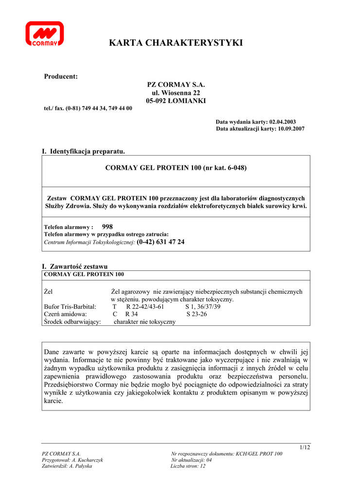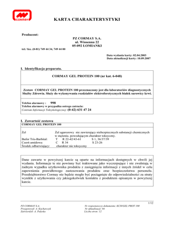 KARTA CHARAKTERYSTYKI Producent: PZ CORMAY S.A. ul. Wiosenna 22 05-092 ŁOMIANKI tel./ fax. (0-81) 749 44 34, 749 44 00 Data wydania karty: 02.04.2003 Data aktualizacji karty: 10.09.2007 I. Identyfikacja preparatu. CORMAY GEL PROTEIN 100 (nr kat. 6-048) Zestaw CORMAY GEL PROTEIN 100 przeznaczony jest dla laboratoriów diagnostycznych SłuŜby Zdrowia. SłuŜy do wykonywania rozdziałów elektroforetycznych białek surowicy krwi. Telefon alarmowy : 998 Telefon alarmowy w przypadku ostrego zatrucia: Centrum Informacji Toksykologicznej: (0-42) 631 47 24 I. Zawartość zestawu CORMAY GEL PROTEIN 100 śel Bufor Tris-Barbital: Czerń amidowa: Środek odbarwiający: śel agarozowy nie zawierający niebezpiecznych substancji chemicznych w stęŜeniu. powodującym charakter toksyczny. T R 22-42/43-61 S 1, 36/37/39 C R 34 S 23-26 charakter nie toksyczny Dane zawarte w powyŜszej karcie są oparte na informacjach dostępnych w chwili jej wydania. Informacje te nie powinny być traktowane jako wyczerpujące i nie zwalniają w Ŝadnym wypadku uŜytkownika produktu z zasięgnięcia informacji z innych źródeł w celu zapewnienia prawidłowego zastosowania produktu oraz bezpieczeństwa personelu. Przedsiębiorstwo Cormay nie będzie mogło być pociągnięte do odpowiedzialności za straty wynikłe z uŜytkowania czy jakiegokolwiek kontaktu z produktem opisanym w powyŜszej karcie. 1/12 PZ CORMAY S.A. Przygotował: A. Kucharczyk Zatwierdził: A. Pałyska Nr rozpoznawczy dokumentu: KCH/GEL PROT 100 Nr aktualizacji: 04 Liczba stron: 12 KARTA CHARAKTERYSTYKI Producent: PZ CORMAY S.A. ul. Wiosenna 22 05-092 ŁOMIANKI tel./ fax. (0-81) 749 44 34, 749 44 00 Data wydania karty: 02.04.2003 Data aktualizacji karty: 10.09.2007 1. Identyfikacja preparatu. CORMAY GEL PROTEIN 100 (nr kat. 6-048) BUFOR TRIS-BARBITAL Zestaw CORMAY GEL PROTEIN 100 przeznaczony jest dla laboratoriów diagnostycznych SłuŜby Zdrowia. SłuŜy do wykonywania rozdziałów elektroforetycznych białek surowicy krwi. Bufor Tris-barbital zapewnia odpowiednie warunki procesu elektroforezy i słuŜy do rozcieńczania próbek surowicy. Telefon alarmowy : 998 Telefon alarmowy w przypadku ostrego zatrucia: Centrum Informacji Toksykologicznej: (0-42) 631 47 24 2. Identyfikacja zagroŜeń. Produkt toksyczny Działa szkodliwie po połknięciu. MoŜe powodować uczulenie w następstwie naraŜenia drogą oddechową i w kontakcie ze skórą. MoŜe działać szkodliwie na dziecko w łonie matki. 3. Skład / informacje o składnikach. Składniki preparatu: kwas 5,5-dwuetylobarbiturowy Zakres stęŜeń: 0,5 – 1,3% Numer CAS: Numer WE: Numer Indeksowy Szkodliwość: T; 57-44-3 200-331-2 - brak 5,5-dwuetylobarbituran sodu Numer CAS: Numer WE: Numer Indeksowy 144-02-5 205-613-9 - brak azydek sodu Numer CAS: Numer WE: Numer Indeksowy Zwroty: R 22-42/43-61; S 3/7/9-22-36/37/39-45-53 Zakres stęŜeń: 3 – 6% Szkodliwość: T; Zwroty: R 22-42/43-61; S 3/7/9-22-36/37/39-45-53 Zakres stęŜeń: 0,5- 0,12% 26628-22-8 247-852-1; 011-004-00-7 Szkodliwość: T+; N; Zwroty: R 28-32-50/53; S 28-45-53-60-61 4. Pierwsza pomoc. 2/12 PZ CORMAY S.A. Przygotował: A. Kucharczyk Zatwierdził: A. Pałyska Nr rozpoznawczy dokumentu: KCH/GEL PROT 100 Nr aktualizacji: 04 Liczba stron: 12 Po naraŜeniu drogą oddechową: ŚwieŜe powietrze. Wezwać lekarza. Po zanieczyszczeniu skóry: Zmyć duŜą ilością wody. Natychmiast zdjąć skaŜoną odzieŜ. Po zanieczyszczeniu oczu: Natychmiast przemyć wodą lub 0,9% roztworem chlorku sodu przez przynajmniej 15 minut trzymając szeroko rozwarte powieki. Jeśli podraŜnienie utrzymuje/nasila się – zasięgnij medycznej porady okulisty. Po spoŜyciu: Podać poszkodowanemu do picia duŜą ilość wody. JeŜeli czuje się niezdrowo, natychmiast wezwać lekarza/pogotowie. 5. Postępowanie w przypadku poŜaru: Odpowiednie środki gaśnicze: - woda, -proszek, piana ZagroŜenia specjalne: PoŜar w otoczeniu moŜe wyzwolić niebezpieczne gazy i pary. Specjalne przeciwpoŜarowe wyposaŜenie ochronne: Nie przebywać w strefie zagroŜenia bez odpowiedniej odzieŜy ochronnej do chemikaliów i bez niezaleŜnego aparatu do oddychania. Inne informacje: Nie dopuszczać do przedostania się wody gaszącej do wód powierzchniowych lub gruntowych. 6. Postępowanie w przypadku niezamierzonego uwolnienia do środowiska: Środki zapobiegawcze związane z personelem: Unikać zanieczyszczenia preparatem. Unikać kontaktu ze skórą i oczami. Procedury czyszczenia / absorpcji: W przypadku rozlania się na podłogę i stoły zebrać uŜywając absorbującego, obojętnego materiału.. Jeśli to będzie konieczne spłukać duŜą ilością wody. 7. Postępowanie z preparatem i jego magazynowanie: Postępowanie: Zgodnie z ogólnie przyjętymi normami dla chemikaliów w laboratoriach. Podczas pracy z preparatem naleŜy stosować odpowiednie środki ochrony osobistej (patrz pkt.8) Unikać kontaktu preparatu ze skórą i oczami oraz wdychania mgieł preparatu. Zapewnić sprawną wentylację miejscową. Nie wolno spoŜywać posiłków, pić oraz palić tytoniu podczas pracy z preparatem z wyjątkiem miejsc do tego przeznaczonych. Przechowywanie: Szczelnie zamknięte w chłodnym miejscu z dala od kwasów, nie stosować pojemników metalowych. 8. Kontrola naraŜenia i środki ochrony indywidualnej: Właściwy parametr kontroli: Rozporządzenie MPiPS, Dz. U.2002 Nr 217, poz. 1833 Tlenki azotu: NDS – 5 mg/m3, NDSCh – 10 mg/m3 azydek sodowy: NDS – 0,1 mg/m3, NDSCh – 0,3 mg/m3. Ryzyko absorpcji przez skórę Osobiste wyposaŜenie ochronne: NaleŜy właściwie dobrać odzieŜ ochronną do miejsca pracy, zaleŜnie od stęŜenia i ilości substancji niebezpiecznych. Odporność odzieŜy ochronnej na chemikalia powinna być stwierdzona przez 3/12 PZ CORMAY S.A. Przygotował: A. Kucharczyk Zatwierdził: A. Pałyska Nr rozpoznawczy dokumentu: KCH/GEL PROT 100 Nr aktualizacji: 04 Liczba stron: 12 odpowiedniego dostawcę. Dróg oddechowych: Stosować w pomieszczeniach p