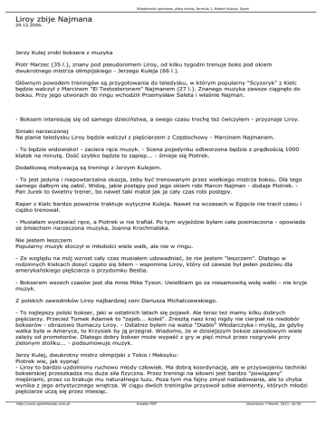 Wiadomości sportowe, piłka nożna, formuła 1, Robert Kubica. Sport Liroy zbije Najmana 29.12.2006. Jerzy Kulej zrobi boksera z muzyka Piotr Marzec (35 l.), znany pod pseudonimem Liroy, od kilku tygodni trenuje boks pod okiem dwukrotnego mistrza olimpijskiego - Jerzego Kuleja (66 l.). Głównym powodem treningów są przygotowania do teledysku, w którym popularny "Scyzoryk" z Kielc będzie walczył z Marcinem "El Testosteronem" Najmanem (27 l.). Znanego muzyka zawsze ciągnęło do boksu. Przy jego utworach do ringu wchodzili Przemysław Saleta i właśnie Najman. - Boksem interesuję się od samego dzieciństwa, a swego czasu trochę też ćwiczyłem - przyznaje Liroy. Siniaki narzeczonej Na planie teledysku Liroy będzie walczył z pięściarzem z Częstochowy - Marcinem Najmanem. - To będzie widowisko! - zaciera ręce muzyk. - Scena pojedynku odtworzona będzie z prędkością 1000 klatek na minutę. Dość szybko będzie to zapiep... - śmieje się Piotrek. Dodatkową motywacją są treningi z Jerzym Kulejem. - To jest jedyna i niepowtarzalna okazja, żeby być trenowanym przez wielkiego mistrza boksu. Dla tego samego dałbym się zabić. Widzę, jakie postępy pod jego okiem robi Marcin Najman - dodaje Piotrek. Pan Jurek to świetny trener, bo nawet taki matoł jak ja cały czas robi postępy. Raper z Kielc bardzo poważnie traktuje wytyczne Kuleja. Nawet na wczasach w Egipcie nie tracił czasu i ciężko trenował. - Musiałam wystawiać ręce, a Piotrek w nie trafiał. Po tym wyjeździe byłam cała posiniaczona - opowiada ze śmiechem narzeczona muzyka, Joanna Krochmalska. Nie jestem leszczem Popularny muzyk stoczył w młodości wiele walk, ale nie w ringu. - Ze względu na mój wzrost cały czas musiałem udowadniać, że nie jestem "leszczem". Dlatego w rodzinnych Kielcach dosyć często się biłem - wspomina Liroy, który od zawsze był pełen podziwu dla amerykańskiego pięściarza o przydomku Bestia. - Bokserem wszech czasów jest dla mnie Mike Tyson. Uwielbiam go za niesamowitą wolę walki - nie kryje muzyk. Z polskich zawodników Liroy najbardziej ceni Dariusza Michalczewskiego. - To najlepszy polski bokser, jaki w ostatnich latach się pojawił. Ale teraz też mamy kilku dobrych pięściarzy. Przecież Tomek Adamek to "zajeb... koleś". Zresztą nasz kraj nigdy nie cierpiał na niedobór bokserów - obrazowo tłumaczy Liroy. - Ostatnio byłem na walce "Diablo" Włodarczyka i myślę, że gdyby walka była w Ameryce, to Krzysiek by ją przegrał. Wiadomo, że w dzisiejszym boksie zawodowym wiele zależy od promotorów. Dlatego dobry bokser może wypaść z gry w pięć minut przez rozgrywki przy zielonym stoliku... - podsumowuje muzyk. Jerzy Kulej, dwukrotny mistrz olimpijski z Tokio i Meksyku: Piotrek wie, jak sypnąć - Liroy to bardzo uzdolniony ruchowo młody człowiek. Ma dobrą koordynację, ale w przyswojeniu techniki bokserskiej przeszkadza mu duża siła fizyczna. Przez treningi na siłowni jest bardzo "powiązany" mięśniami, przez co brakuje mu naturalnego luzu. Poza tym ma fajny zmysł naśladowania, ale to chyba wynika z jego artystycznego wnętrza. W ciągu dwóch treningów przyswoił sobie elementy, których młodzi pięściarze uczą się przez miesiąc. http://www.sportmaniak.com.pl Kreator PDF Utworzono 7 March, 2017, 16:50 Wiadomości sportowe, piłka nożna, formuła 1, Robert Kubica. Sport Lepiej, żeby Piotrka nikt na ulicy nie zaczepiał, bo ma bardzo silną lewą rękę i wie, jak z niej "sypnąć". Boks jest modny, trenuje nawet... papież Piotr Adamczyk (34 l.) aktor (m.in.: "Karol: Człowiek, który został papieżem", "Fryderyk Chopin - pragnienie miłości") Trenuje z Pawłem Skrzeczem Michał Żebrowski (34 l.) aktor (m.in.: "Ogniem i mieczem", "Pan Tadeusz", "Pręgi", "Wiedźmin") trenuje z Pawłem Skrzeczem Daniel Olbrychski (61 l.) aktor (m.in.: "Zemsta", "Potop", "Popioły", "Bokser", "Ziemia obiecana") trenuje z Pawłem Skrzeczem (SuperExpress) http://www.sportmaniak.com.pl Kreator PDF Utworzono 7 March, 2017, 16:50