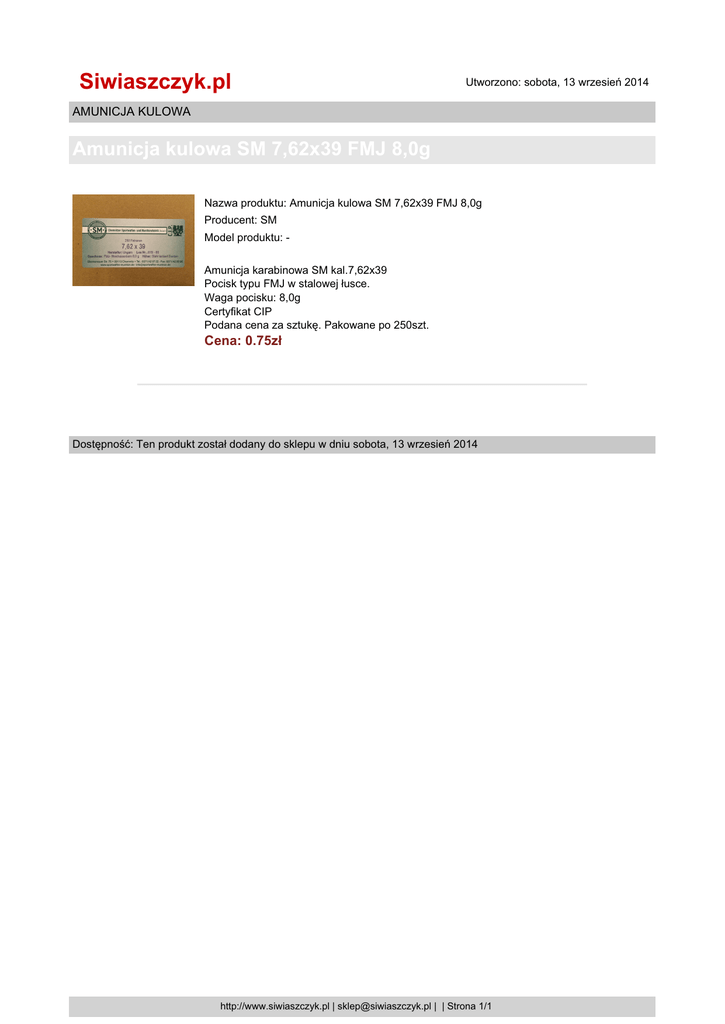 Siwiaszczyk.pl Utworzono: sobota, 13 wrzesień 2014 AMUNICJA KULOWA Amunicja kulowa SM 7,62x39 FMJ 8,0g Nazwa produktu: Amunicja kulowa SM 7,62x39 FMJ 8,0g Producent: SM Model produktu: Amunicja karabinowa SM kal.7,62x39 Pocisk typu FMJ w stalowej łusce. Waga pocisku: 8,0g Certyfikat CIP Podana cena za sztukę. Pakowane po 250szt. Cena: 0.75zł Dostępność: Ten produkt został dodany do sklepu w dniu sobota, 13 wrzesień 2014 http://www.siwiaszczyk.pl | [email protected] | | Strona 1/1