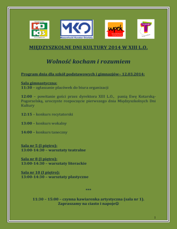 MIĘDZYSZKOLNE DNI KULTURY 2014 W XIII L.O. Wolność kocham i rozumiem Program dnia dla szkół podstawowych i gimnazjów– 12.03.2014: Sala gimnastyczna: 11:30 – zgłaszanie placówek do biura organizacji 12:00 – powitanie gości przez dyrektora XIII L.O., panią Ewę KotarskąPogorzelską, uroczyste rozpoczęcie pierwszego dnia Międzyszkolnych Dni Kultury 12:15 – konkurs recytatorski 13:00 – konkurs wokalny 14:00 – konkurs taneczny Sala nr 5 (I piętro): 13:00-14:30 – warsztaty teatralne Sala nr 8 (I piętro): 13:00-14:30 – warsztaty literackie Sala nr 10 (I piętro): 13:00-14:30 – warsztaty plastyczne *** 11:30 – 15:00 – czynna kawiarenka artystyczna (sala nr 1). Zapraszamy na ciasto i napoje 1 MIĘDZYSZKOLNE DNI KULTURY 2014 W XIII L.O. Wolność kocham i rozumiem Program dnia dla szkół ponadgimnazjalnych – 13.03.2014: Sala gimnastyczna: 11:30 – zgłaszanie placówek do biura organizacji 12:00 –uroczyste rozpoczęcie drugiego dnia Międzyszkolnych Dni Kultury 12:15 – konkurs recytatorski 13:00 – konkurs wokalny 14:00 – konkurs taneczny Sala nr 5 (I piętro): 13:00-14:30 – warsztaty teatralne Sala nr 8 (I piętro): 13:00-14:30 – warsztaty literackie Sala nr 10 (I piętro): 13:00-14:30 – warsztaty plastyczne *** 11:30 – 15:00 - czynna kawiarenka artystyczna (sala nr 1). Zapraszamy na ciasto i napoje 2 …A po południu… 12 marca godz. 16:00 – 18:00 Warsztaty taneczne i pokaz tańca Prowadzenie warsztatów: Piotr Brauner Pokaz w wykonaniu absolwenta XIII LO, Pawła Kostrzewy i jego partnerki Martyny Lewandowskiej Wicemistrzowie Polski (9 miejsce na MŚ w Paryżu – 2012r.), należą do ścisłej kadry narodowej i reprezentują kraj w najważniejszych turniejach na całym świecie. 13 marca godz. 16:00 – 18:00 Wieczór teatru i poezji śpiewanej z udziałem gości 14 marca godz. 13:00 – 16:00 Trzynaście anegdot o Trzynastce Pokaz talentów uczniów XIII LO Zapraszamy do udziału, wszystkich szczegółowych informacji udzielą Wam nauczyciele poloniści 3 25 marca 2014 r. godzina 13:00 – Finał Międzyszkolnych Dni Kultury 2014 Dom Kultury „Świt” Program uroczystości (dla wszystkich uczestników): 13:00 – uroczyste powitanie gości 13:15 – projekcja reportażu z przebiegu Międzyszkolnych Dni Kultury 13:45 – występy laureatów, wręczenie nagród zwycięzcom konkursów, podziękowania 4