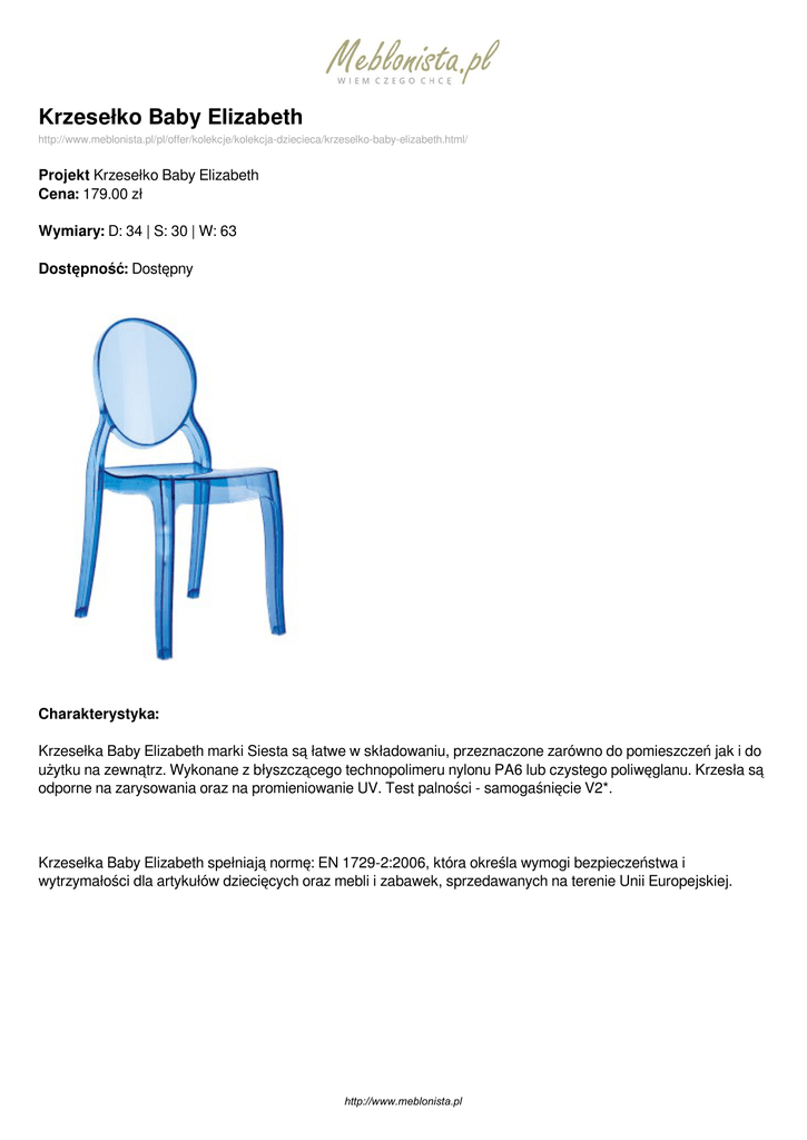 Krzesełko Baby Elizabeth http://www.meblonista.pl/pl/offer/kolekcje/kolekcja-dziecieca/krzeselko-baby-elizabeth.html/ Projekt Krzesełko Baby Elizabeth Cena: 179.00 zł Wymiary: D: 34 | S: 30 | W: 63 Dostępność: Dostępny Charakterystyka: Krzesełka Baby Elizabeth marki Siesta są łatwe w składowaniu, przeznaczone zarówno do pomieszczeń jak i do użytku na zewnątrz. Wykonane z błyszczącego technopolimeru nylonu PA6 lub czystego poliwęglanu. Krzesła są odporne na zarysowania oraz na promieniowanie UV. Test palności - samogaśnięcie V2*. Krzesełka Baby Elizabeth spełniają normę: EN 1729-2:2006, która określa wymogi bezpieczeństwa i wytrzymałości dla artykułów dziecięcych oraz mebli i zabawek, sprzedawanych na terenie Unii Europejskiej. http://www.meblonista.pl Dostępne wersje produktu: nazwa produktu Krzesełko Baby Elizabeth warianty kolor niebieski transparentny cena 179.00zł dostępne Dostępny Krzesełko Baby Elizabeth kolor biały 179.00zł Dostępny Krzesełko Baby Elizabeth kolor czerwony transparentny 179.00zł Dostępny Krzesełko Baby Elizabeth kolor fioletowy transparentny 179.00zł Dostępny Krzesełko Baby Elizabeth kolor różowy transparentny 179.00zł Dostępny Krzesełko Baby Elizabeth kolor transparentny 179.00zł Dostępny http://www.meblonista.pl Zdjęcia produktu: http://www.meblonista.pl Powered by TCPDF (www.tcpdf.org)