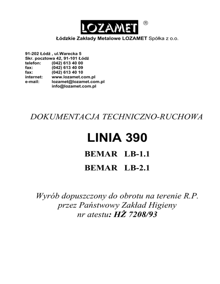 LOZAMEt Łódzkie Zakłady Metalowe LOZAMET Spółka z o.o. 91-202 Łódź , ul.Warecka 5 Skr. pocztowa 42, 91-101 Łódź telefon: (042) 613 40 00 fax: (042) 613 40 09 fax: (042) 613 40 10 internet: www.lozamet.com.pl e-mail: [email protected] [email protected] DOKUMENTACJA TECHNICZNO-RUCHOWA LINIA 390 BEMAR LB-1.1 BEMAR LB-2.1 Wyrób dopuszczony do obrotu na terenie R.P. przez Państwowy Zakład Higieny nr atestu: HŻ 7208/93 SPIS TREŚCI strona 1. ZASTOSOWANIE I CHARAKTERYSTYKA 3 1.1. Zastosowanie bemaru 3 1.2. Dane techniczne 3 2. INSTALOWANIE 3 2.1. Ustawienie 3 2.2. Podłączenie do instalacji elektrycznej 3 3. OBSŁUGA 3 3.1. Przygotowanie bemaru do pracy 3 3.2. Czynności po zakończeniu pracy 4 3.3. Bezpieczeństwo i higiena pracy 4 4. KONSERWACJA I NAPRAWY 4 4.1. Konserwacja 4 4.2. Naprawy i remonty 4 5. WYKAZ CZĘŚCI ZAMIENNYCH 5 6. RYSUNEK BEMARU 5 7. SCHEMAT ELEKTRYCZNY BEMARU 6 2 1. ZASTOSOWANIE I CHARAKTERYSTYKA 1.1. Zastosowanie bemaru Bemar przeznaczony jest do utrzymywania w stanie gorącym uprzednio przygotowanych potraw. 1.2. Dane techniczne PARAMETRY Głębokość Szerokość Wysokość Moc znamionowa Napięcie Częstotliwość prądu Ilość pojemników GN ¼ x 100 2. LB-1.1 LB-2.1 mm mm mm kW V Hz 390 272 254 0,25 ~230 50 390 544 254 0,5 ~230 50 szt. 2 4 INSTALOWANIE 2.1. Ustawienie Bemar należy ustawić w miejscu umożliwiającym jego ergonomiczne użytkowanie i gwarantującym stabilne położenie w czasie pracy. Miejsce w którym ustawiony zostanie bemar powinno mieć instalację elektryczną jednofazową 230 V ~50 Hz. Instalacja powinna mieć skuteczną ochronę p.porażeniową, tj. zerowanie lub uziemienie. 2.2. Podłączenie do instalacji elektrycznej a) sprawdzić zgodność parametrów instalacji elektrycznej z danymi znamionowymi bemaru b) sprawdzić stan osprzętu elektrycznego bemaru c) dokonać pomiaru ochrony p.porażeniowej /zerowanie lub uziemienie/ d) wykonać przyłączenie bemaru do sieci elektrycznej. Urządzenie wyposażone jest w giętki przewód zasilający o olejoodpornej powłoce polichloroprenowej typu H07RN-F (3x1,5mm2, w tym żyła ochronna). Przyłączenie wyrównawcze Urządzenie wyposażone jest w zacisk do przyłączenia zewnętrznych żył wyrównawczych oznaczone symbolem . Przed podłączeniem urządzenia należy sprawdzić prawidłowość wykonania i skuteczność działania połączeń wyrównawczych zgodnie z PN-IEC-60364-4-41. URUCHOMIENIE BEMARU MOŻE NASTĄPIĆ PO POTWIERDZENIU SKUTECZNOŚCI OCHRONY P.PORAŻENIOWEJ WYNIKAMI POMIARÓW. 3. OBSŁUGA 3.1. Przygotowanie bemaru do pracy a) urządzenie odkonserwować i ustawić w miejscu pracy, b) pojemniki funkcjonalne i pokrywki wymyć ciepłą wodą z dodatkiem płynu do mycia naczyń oraz dokładnie wypłukać, c) włożyć pojemniki z produktami spożywczymi w otwory bemaru, lub napełnić pojemniki uprzednio tam włożone, d) przyciskiem klawiszowym /rys.1 poz.6 / załączyć zasilanie bemaru, e) pokrętłem regulatora energii /rys.1 poz.8 / ustawić żądaną temperaturę. Załączenie regulatora sygnalizuje świecenie lampki sygnalizacyjnej /rys.1 poz.7 /, 3 3.2. - 3.3. Czynności po zakończeniu pracy przyciskiem klawiszowym /rys.1 poz.6 / włączyć bemar, pokrętło regulatora energii /rys.1 poz.8 / ustawić w pozycję "0", powierzchnie zewnętrzne umyć w ciepłej wodzie z dodatkiem płynu do mycia naczyń i wytrzeć do sucha Bezpieczeństwo i higiena pracy Nieumiejętna obsługa bemaru, niestosowanie się do ww. zaleceń oraz nieprzestrzeganie przepisów B H P może spowodować niebezpieczeństwo porażenia prądem elektrycznym lub poparzenia. Należy przestrzegać następujące zasady postępowania: a) przed pierwszym uruchomieniem oraz co najmniej raz w roku sprawdzić skuteczność ochrony przed porażeniem prądem elektrycznym b) osoby nieuprawnione nie powinny wykonywać napraw i regulacji bemaru c) w czasie napraw i konserwacji bezwzględnie odłączyć bemar od sieci elektrycznej d) w przypadku stwierdzenia uszkodzeń instalacji lub osprzętu elektrycznego, należy bezzwłocznie wyłączyć bemar z sieci elektrycznej e) w czasie mycia i czyszczenia, a także podczas bieżącej eksploatacji NIE WOLNO dopuszczać do zalania wodą lub innymi płynami instalacji elektrycznej bemaru, ZABRANIA SIĘ MYCIA URZĄDZENIA STRUMIENIEM WODY 4. KONSERWACJA I NAPRAWY 4.1. Konserwacja 4.2. codziennie po zakończeniu pracy bemaru należy umyć obudowę i pojemniki funkcjonalne, codziennie należy usunąć zanieczyszczenia z komory grzałki, Naprawy i remonty Producent bemarów ŁÓDZKIE ZAKŁADY METALOWE „LOZAMET" poprzez swoją służbę serwisową zapewnia naprawy u odbiorcy oraz przeprowadza remonty w siedzibie producenta. Producent nie ponosi odpowiedzialności za niewłaściwe lub niezgodne z zaleceniami podanymi w niniejszej dokumentacji użytkowanie wyrobu. Gwarancja nie obejmuje uszkodzeń powstałych w wyniku niewłaściwego użytkowania, braku konserwacji bieżącej i okresowej oraz powstałych w wyniku dokonywania napraw przez osoby nieupoważnione. 4 5. WYKAZ CZĘŚCI ZAMIENNYCH Ilość sztuk dla typu Poz. NAZWA 1 Pojemnik funkcjonalny GN ¼ x 100mm 2 Uchwyt 6 8 Łącznik klawiszowy Podświetlany Lampka sygnalizacyjna LS1 /pomarańczowa/ Pokrętło kompletne 11 12 Regulator energii Grzałka 250W/230V 7 5. Nr rysunku LB-1.1 LB-2.1 2 1 4 1 LF.A.02.00.00.08.0 1 1 ZB.A.02.00.00.01.0 1 1 1 1 1 1 1 2 Pozycja wg rys. 1 2 6 AN.A.00.00.00.00.0/C30 7 LV.A.04.00.00.00.0 8 EGO 50.57021.010 LV.A.02.00.00.00.0/C4 11 12 RYSUNEK BEMARU 5 6. SCHEMAT ELEKTRYCZNY BEMARU X1 S1/H1 S2 H2 E 6 listwa zaciskowa wyłącznik z lampką regulator energii lampka sygnalizacyjna grzałka