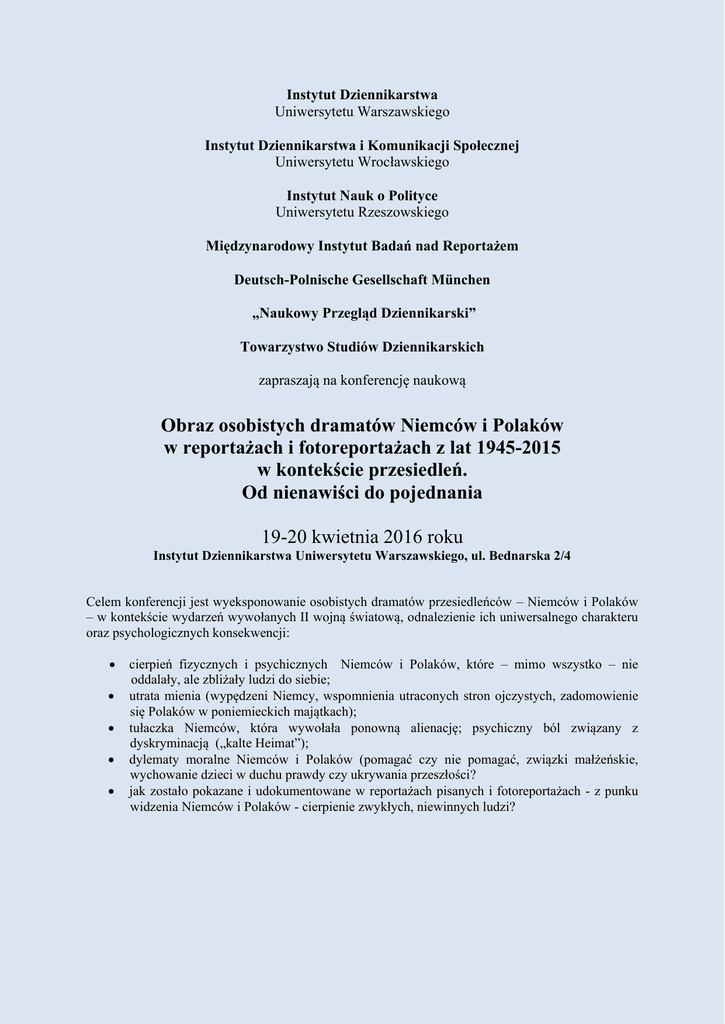 Instytut Dziennikarstwa Uniwersytetu Warszawskiego Instytut Dziennikarstwa i Komunikacji Społecznej Uniwersytetu Wrocławskiego Instytut Nauk o Polityce Uniwersytetu Rzeszowskiego Międzynarodowy Instytut Badań nad Reportażem Deutsch-Polnische Gesellschaft München „Naukowy Przegląd Dziennikarski” Towarzystwo Studiów Dziennikarskich zapraszają na konferencję naukową Obraz osobistych dramatów Niemców i Polaków w reportażach i fotoreportażach z lat 1945-2015 w kontekście przesiedleń. Od nienawiści do pojednania 19-20 kwietnia 2016 roku Instytut Dziennikarstwa Uniwersytetu Warszawskiego, ul. Bednarska 2/4 Celem konferencji jest wyeksponowanie osobistych dramatów przesiedleńców – Niemców i Polaków – w kontekście wydarzeń wywołanych II wojną światową, odnalezienie ich uniwersalnego charakteru oraz psychologicznych konsekwencji: cierpień fizycznych i psychicznych Niemców i Polaków, które – mimo wszystko – nie oddalały, ale zbliżały ludzi do siebie; utrata mienia (wypędzeni Niemcy, wspomnienia utraconych stron ojczystych, zadomowienie się Polaków w poniemieckich majątkach); tułaczka Niemców, która wywołała ponowną alienację; psychiczny ból związany z dyskryminacją („kalte Heimat”); dylematy moralne Niemców i Polaków (pomagać czy nie pomagać, związki małżeńskie, wychowanie dzieci w duchu prawdy czy ukrywania przeszłości? jak zostało pokazane i udokumentowane w reportażach pisanych i fotoreportażach - z punku widzenia Niemców i Polaków - cierpienie zwykłych, niewinnych ludzi? Reportaż jest gatunkiem, który opiera się na rzeczywistych wydarzeniach, przeżyciach i dokumentach, dlatego naczelnym zadaniem będzie dotarcie do takich tekstów reportażowych, które pozwolą znaleźć odpowiedź na pytanie, co sprawiło, że po latach nienawiści i wzajemnych animozji doszło do pojednania między sąsiadami. Organizatorzy konferencji stawiają sobie za cel opracowanie tematyki, na którą do tej pory nie zwracano uwagi (osobiste dramaty jednostek), a koncentrowano się na wydarzeniach historycznych i politycznych. Organizatorom zależy na zbadaniu i przeanalizowaniu reportaży pisanych, fotoreportaży autorstwa polskich i niemieckich reporterów oraz fotoreporterów, którzy wskazywali na: tragiczne losy niewinnych ludzi, ich dramat u schyłku II wojny światowej, po jej zakończeniu (przesiedlenia); szybką odbudowę zniszczonych Niemiec po II wojnie światowej (szok cywilizacyjny; plan Marshalla); przemiany w sposobie myślenia Polaków i Niemców w latach pięćdziesiątych i sześćdziesiątych XX wieku (zimna wojna, apel biskupów polskich do biskupów niemieckich), siedemdziesiątych (Willy Brandt) i osiemdziesiątych (okres łagodzenia napięć), wreszcie czasu transformacji ustrojowej w Polsce lat dziewięćdziesiątych XX wieku i zbliżenia Polaków i Niemców (Tadeusz Mazowiecki i Helmut Kohl) do siebie do tego stopnia, że bez żadnych urazów, po przyjęciu Polski do NATO (1999) żołnierze niemieccy i polscy stanęli w jednym szeregu, a nie po przeciwnych stronach. Zgłoszenia udziału w konferencji wraz ze streszczeniem referatu (150-200 słów) prosimy przesyłać do 10 stycznia 2016 roku na adres internetowy [email protected]. Informacja zwrotna dla autorów zaakceptowanych zgłoszeń zostanie przesłana do 20 stycznia 2016 roku. Osoby, których referaty zostaną zakwalifikowane do wygłoszenia, będą proszone o wniesienie do dnia 15 lutego 2016 roku opłaty konferencyjnej w wysokości 350 zł (200 zł dla doktorantów) na konto Towarzystwa Studiów Dziennikarskich: 97 1240 4751 1111 0000 5513 3359 Przewidywane rozpoczęcie konferencji we wtorek, 19 kwietnia o godz. 13, przewidywane zakończenie w środę, 20 kwietnia o godz. 14. W imieniu organizatorów: prof. dr hab. Kazimierz Wolny-Zmorzyński (UW) prof. nadzw. dr. hab. Wojciech Furman (UR) dr Mateusz Zimnoch (MIBnR) dr Joanna Szylko-Kwas (UW) mgr Urszula Kuźnik (UW) – sekretarz konferencji Rada Naukowa Konferencji prof. dr hab. Janusz W. Adamowski (UW) - przewodniczący dr Katarzyna Bernat (Radio Em Kielce) prof. dr hab. Krystyna Doktorowicz (UŚ) ks. prof. dr hab. Michał Drożdż (UPJPII) dr Krzysztof Groń (PŚl.) prof. dr hab. Marek Jabłonowski (UW) prof. dr hab. Jerzy Jastrzębski (UWr.) red. Henryk Martenka („Angora”) Werner Meier (DPG München) prof. dr hab. Tomasz Mielczarek (UJK) prof. nadzw. dr hab. Agnieszka Pawłowska (UR) dr Marek Perlikiewicz (UG) prof. dr hab. Izabela Surynt (UWr.) dr Hans-Christian Trepte (Universität Leipzig) prof. dr hab. Andrzej Zawada (UWr.)