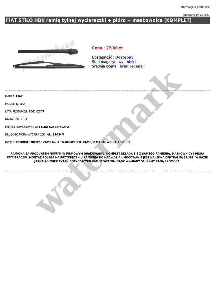 Informacje o produkcie Utworzono 07-03-2017 FIAT STILO HBK ramię tylnej wycieraczki + pióro + maskownica (KOMPLET) Cena : 27,00 zł MARKA: FIAT MODEL: STILO LATA PRODUKCJI: 2001-2007 NADWOZIE: HBK er m ar k Dostępność : Dostępny Stan magazynowy : niski Średnia ocena : brak recenzji MIEJSCE ZAMOCOWANIA: TYLNA SZYBA/KLAPA DŁUGOŚĆ PIÓRA WYCIERACZKI: ok. 330 MM UWAGI: PRODUKT NOWY - ZAMIENNIK. W KOMPLECIE RAMIĘ Z MASKOWNICĄ + PIÓRO w at RAMIONA SĄ PRODUKTEM NOWYM W FIRMOWYM OPAKOWANIU. KOMPLET SKŁADA SIĘ Z SAMEGO RAMIENIA, MASKOWNICY I PIÓRA WYCIERACZKI. MONTAŻ POLEGA NA PRZYKRĘCENIU RAMIENIA DO NADWOZIA - MOCOWANIE JEST NA JEDNĄ CENTRALNĄ ŚRUBĘ. W RAZIE JAKICHKOLWIEK PYTAŃ DOTYCZĄCYCH ZAMOCOWANIA, BĄDŻ WYMIANY SŁUŻYMY RADĄ I POMOCĄ.