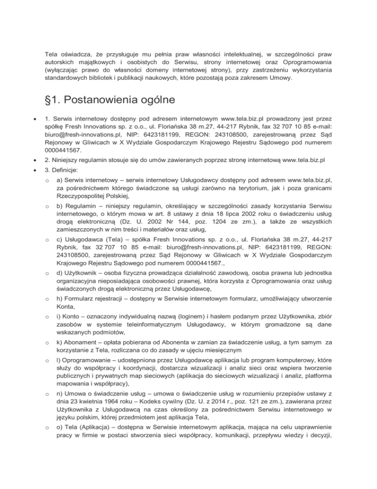 Tela oświadcza, że przysługuje mu pełnia praw własności intelektualnej, w szczególności praw autorskich majątkowych i osobistych do Serwisu, strony internetowej oraz Oprogramowania (wyłączając prawo do własności domeny internetowej strony), przy zastrzeżeniu wykorzystania standardowych bibliotek i publikacji naukowych, które pozostają poza zakresem Umowy. §1. Postanowienia ogólne  1. Serwis internetowy dostępny pod adresem internetowym www.tela.biz.pl prowadzony jest przez spółkę Fresh Innovations sp. z o.o., ul. Floriańska 38 m.27, 44-217 Rybnik, fax 32 707 10 85 e-mail: [email protected], NIP: 6423181199, REGON: 243108500, zarejestrowaną przez Sąd Rejonowy w Gliwicach w X Wydziale Gospodarczym Krajowego Rejestru Sądowego pod numerem 0000441567.  2. Niniejszy regulamin stosuje się do umów zawieranych poprzez stronę internetową www.tela.biz.pl  3. Definicje: o a) Serwis internetowy – serwis internetowy Usługodawcy dostępny pod adresem www.tela.biz.pl, za pośrednictwem którego świadczone są usługi zarówno na terytorium, jak i poza granicami Rzeczypospolitej Polskiej, o b) Regulamin – niniejszy regulamin, określający w szczególności zasady korzystania Serwisu internetowego, o którym mowa w art. 8 ustawy z dnia 18 lipca 2002 roku o świadczeniu usług drogą elektroniczną (Dz. U. 2002 Nr 144, poz. 1204 ze zm.), a także ze wszystkich zamieszczonych w nim treści i materiałów oraz usług, o c) Usługodawca (Tela) – spółka Fresh Innovations sp. z o.o., ul. Floriańska 38 m.27, 44-217 Rybnik, fax 32 707 10 85 e-mail: [email protected], NIP: 6423181199, REGON: 243108500, zarejestrowaną przez Sąd Rejonowy w Gliwicach w X Wydziale Gospodarczym Krajowego Rejestru Sądowego pod numerem 0000441567., o d) Użytkownik – osoba fizyczna prowadząca działalność zawodową, osoba prawna lub jednostka organizacyjna nieposiadająca osobowości prawnej, która korzysta z Oprogramowania oraz usług świadczonych drogą elektroniczną przez Usługodawcę, o h) Formularz rejestracji – dostępny w Serwisie internetowym formularz, umożliwiający utworzenie Konta, o i) Konto – oznaczony indywidualną nazwą (loginem) i hasłem podanym przez Użytkownika, zbiór zasobów w systemie teleinformatycznym Usługodawcy, w którym gromadzone są dane wskazanych podmiotów, o k) Abonament – opłata pobierana od Abonenta w zamian za świadczenie usług, a tym samym za korzystanie z Tela, rozliczana co do zasady w ujęciu miesięcznym o l) Oprogramowanie – udostępniona przez Usługodawcę aplikacja lub program komputerowy, które służy do współpracy i koordynacji, dostarcza wizualizacji i analiz sieci oraz wspiera tworzenie publicznych i prywatnych map sieciowych (aplikacja do sieciowych wizualizacji i analiz, platforma mapowania i współpracy), o n) Umowa o świadczenie usług – umowa o świadczenie usług w rozumieniu przepisów ustawy z dnia 23 kwietnia 1964 roku – Kodeks cywilny (Dz. U. z 2014 r., poz. 121 ze zm.), zawierana przez Użytkownika z Usługodawcą na czas określony za pośrednictwem Serwisu internetowego w języku polskim, której przedmiotem jest aplikacja Tela, o o) Tela (Aplikacja) – dostępna w Serwisie internetowym aplikacja, mająca na celu usprawnienie pracy w firmie w postaci stworzenia sieci współpracy, komunikacji, przepływu wiedzy i decyzji, będąca tym samym przedmiotem Umowy o świadczenie usług drogą elektroniczną zawartej przez Usługodawcę na rzecz Użytkownika w oparciu o niniejszy Regulamin, o  p) Dowód zakupu – faktura VAT lub inny dokument potwierdzający zakup. 4. Usługi świadczone drogą elektroniczną przez Usługodawcę polegają na: o a) umożliwieniu prowadzenia Konta w Serwisie internetowym, o b) umożliwieniu zawarcia Umowy o świadczenie usług, o c) umożliwieniu korzystania z aplikacji mobilnych Tela za pomocą przenośnych urządzeń elektronicznych, dostępnej w wersji systemowej: Android, Apple iOS 5. Przed wypełnieniem Formularza rejestracji wraz z utworzeniem Konta, Użytkownik proszony jest o zapoznanie się z treścią Regulaminu i jego akceptację.  6. Użytkownik uzyskuje dostęp do Konta za pośrednictwem loginu i hasła. Umowa dotycząca prowadzenia Konta w Serwisie internetowym jest zawierana na czas nieokreślony i nie pociąga za sobą żadnych zobowiązań finansowych dla Użytkownika. Umowa może zostać wypowiedziana w każdym momencie poprzez usunięcie Konta w Serwisie internetowym lub przesłanie informacji o rezygnacji przez Użytkownika na adres e-mail Usługodawcy: [email protected]. Wiadomość e-mail powinna być zatytułowana "Usunięcie danych z tela", a w jej treści należy podać swoje imię i nazwisko oraz nazwę reprezentowanej instytucji lub organizacji.  7. Korzystać z Serwisu internetowego mogą wyłącznie osoby, które mają ukończone co najmniej 13 lat. W przypadku wątpliwości co do wymaganego wieku Użytkownika, Usługodawca może zażądać okazania dokumentu potwierdzającego jego wiek.  8. Ogłoszenia, reklamy Usługodawcy, cenniki i inne informacje podane na stronach internetowych Serwisu internetowego, stanowią zaproszenie do zawarcia umowy w rozumieniu art. 71 Kodeksu cywilnego z dnia 23 kwietnia 1964 r. (Dz. U. z 2014 r., poz. 121 ze zm.).  9. Użytkownik jest odpowiedzialny za utrzymanie bezpieczeństwa własnego Konta.  10. Do korzystania z Serwisu internetowego www.tela.biz.pl, niezbędny jest komputer z procesorem min. 200MHz, 64MB RAM, kartą graficzną obsługującą rozdzielczości 800x600 i 256 kolorów oraz przeglądarka stron internetowych (Internet Explorer (wersja >= 6.0), Mozilla Firefox, Opera, Google Chrome, Safari), a także klawiatura lub inne urządzenie wskazujące, umożliwiające poprawne wypełnienie formularzy elektronicznych.  11. Usługodawca zobowiązuje się do świadczenia Usług z dołożeniem należytej staranności.  12. Użytkownik nie może korzystać z Konta, Serwisu, oprogramowania czy Tela do celó