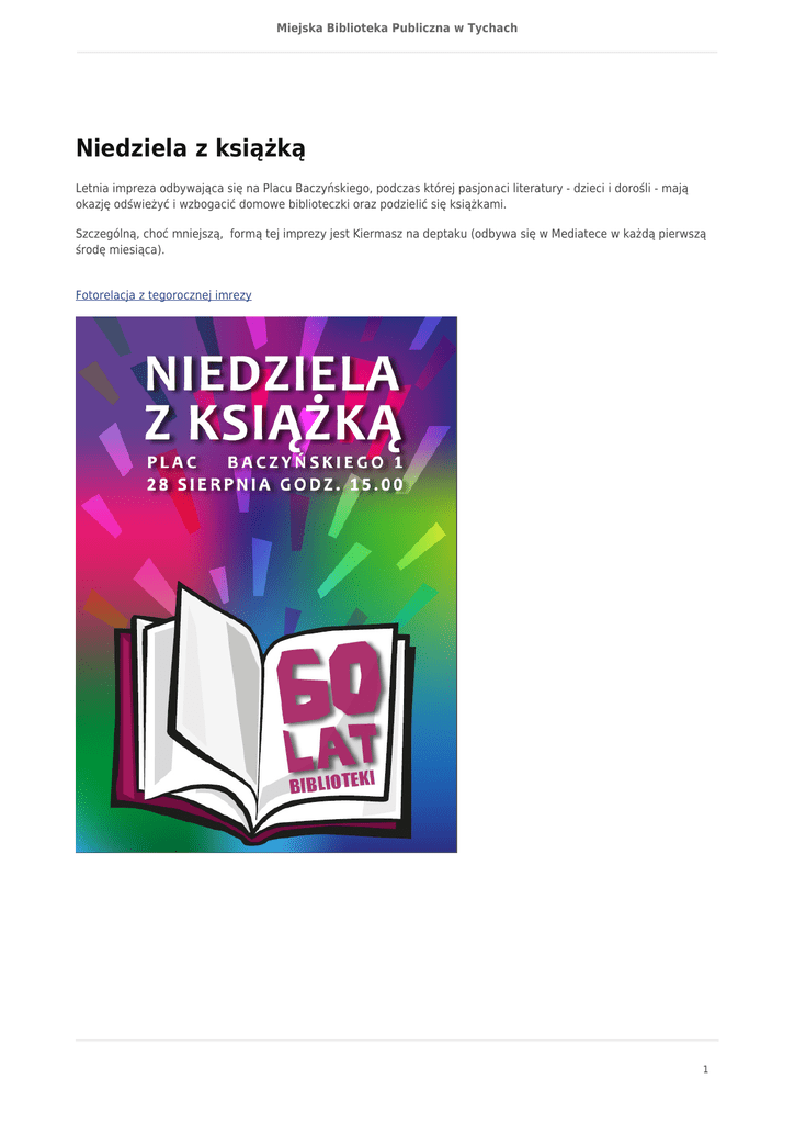 Miejska Biblioteka Publiczna w Tychach Niedziela z książką Letnia impreza odbywająca się na Placu Baczyńskiego, podczas której pasjonaci literatury - dzieci i dorośli - mają okazję odświeżyć i wzbogacić domowe biblioteczki oraz podzielić się książkami. Szczególną, choć mniejszą, formą tej imprezy jest Kiermasz na deptaku (odbywa się w Mediatece w każdą pierwszą środę miesiąca). Fotorelacja z tegorocznej imrezy 1