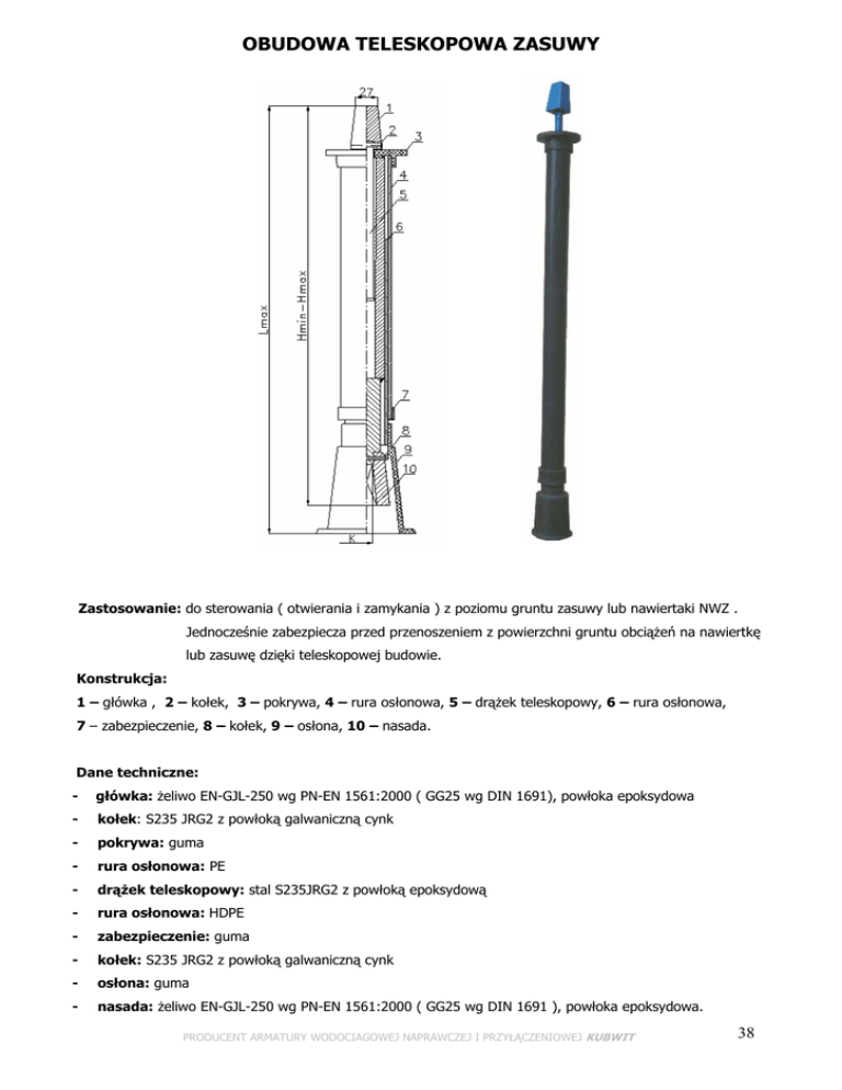 OBUDOWA TELESKOPOWA ZASUWY Zastosowanie: do sterowania ( otwierania i zamykania ) z poziomu gruntu zasuwy lub nawiertaki NWZ . Jednocześnie zabezpiecza przed przenoszeniem z powierzchni gruntu obciążeń na nawiertkę lub zasuwę dzięki teleskopowej budowie. Konstrukcja: 1 – główka , 2 – kołek, 3 – pokrywa, 4 – rura osłonowa, 5 – drążek teleskopowy, 6 – rura osłonowa, 7 – zabezpieczenie, 8 – kołek, 9 – osłona, 10 – nasada. Dane techniczne: - główka: żeliwo EN-GJL-250 wg PN-EN 1561:2000 ( GG25 wg DIN 1691), powłoka epoksydowa - kołek: S235 JRG2 z powłoką galwaniczną cynk - pokrywa: guma - rura osłonowa: PE - drążek teleskopowy: stal S235JRG2 z powłoką epoksydową - rura osłonowa: HDPE - zabezpieczenie: guma - kołek: S235 JRG2 z powłoką galwaniczną cynk - osłona: guma - nasada: żeliwo EN-GJL-250 wg PN-EN 1561:2000 ( GG25 wg DIN 1691 ), powłoka epoksydowa. PRODUCENT ARMATURY WODOCIAGOWEJ NAPRAWCZEJ I PRZYŁĄCZENIOWEJ KUBWIT 38 WYMIARY PRODUKOWANYCH OBUDÓW DN H min H max K Lmax 32 32 40 40 50 50 80 80 100 100 150 150 200 200 900 1300 12 1335 1300 1700 12 1735 900 1300 14 1335 1300 1700 14 1735 900 1300 14 1335 1300 1700 14 1735 900 1300 17 1335 1300 1700 17 1735 900 1300 19 1335 1300 1700 19 1735 900 1300 19 1335 1300 1700 19 1735 900 1300 24 1335 1300 1700 24 1735 Powyższy przegląd wymiarów stanowi standard w programie produkcji Wykonujemy obudowy o wymiarach H min – H max innych niż podane w tabeli Instrukcja montażu: - wysunąć drążek teleskopowy z rury osłonowej, - nałożyć drążek teleskopowy nasadą na wrzeciono zasuwy , - wsunąć jednocześnie zawleczkę w nasadę obudowy i wrzeciono zasuwy, - dla uzyskania pewnego połączenia obudowy z zasuwą odgiąć końce zawleczki, - pozostałe prace związane z zabudową obudowy teleskopowej tj. z montażem skrzynki ulicznej, podsypką należy prowadzić zgodnie z warunkami technicznymi odbioru robót instalacyjnych. * instrukcja montażu nie jest elementem gwarancyjnym stanowi jedynie informację techniczną. PRODUCENT ARMATURY WODOCIAGOWEJ NAPRAWCZEJ I PRZYŁĄCZENIOWEJ KUBWIT 39
