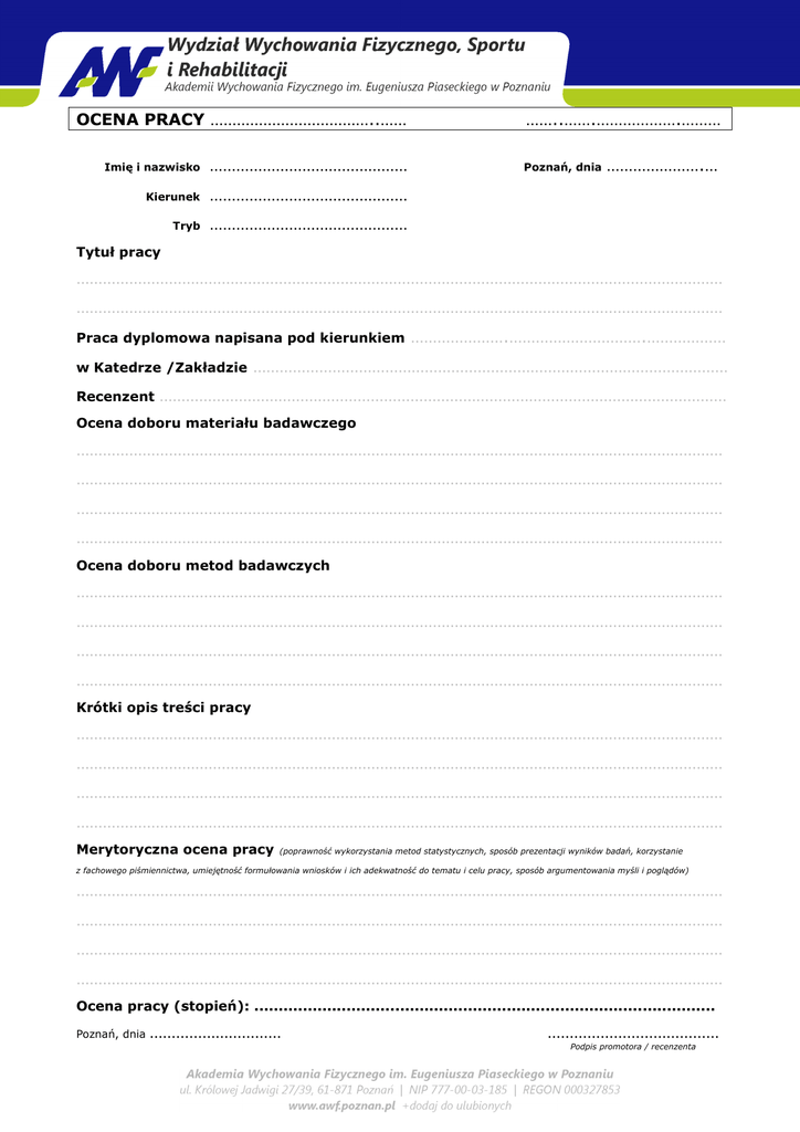 OCENA PRACY ………………………………..…… Imię i nazwisko ……………………………………… Kierunek ……………………………………… Tryb ……………………………………… ……..…….……………….……… Poznań, dnia ………………….… Tytuł pracy ………………………………………………………………………………………………………………………………… ………………………………………………………………………………………………………………………………… Praca dyplomowa napisana pod kierunkiem w Katedrze /Zakładzie Recenzent ………………….………………………….……………… ……………………………………………………………………………………………… ………………………………………………………………………………………………………………… Ocena doboru materiału badawczego ………………………………………………………………………………………………………………………………… ………………………………………………………………………………………………………………………………… ………………………………………………………………………………………………………………………………… ………………………………………………………………………………………………………………………………… Ocena doboru metod badawczych ………………………………………………………………………………………………………………………………… ………………………………………………………………………………………………………………………………… ………………………………………………………………………………………………………………………………… ………………………………………………………………………………………………………………………………… Krótki opis treści pracy ………………………………………………………………………………………………………………………………… ………………………………………………………………………………………………………………………………… ………………………………………………………………………………………………………………………………… ………………………………………………………………………………………………………………………………… Merytoryczna ocena pracy (poprawność wykorzystania metod statystycznych, sposób prezentacji wyników badań, korzystanie z fachowego piśmiennictwa, umiejętność formułowania wniosków i ich adekwatność do tematu i celu pracy, sposób argumentowania myśli i poglądów) ………………………………………………………………………………………………………………………………… ………………………………………………………………………………………………………………………………… ………………………………………………………………………………………………………………………………… ………………………………………………………………………………………………………………………………… Ocena pracy (stopień): ............................................................................................... Poznań, dnia ………………………… ………………………………… Podpis promotora / recenzenta