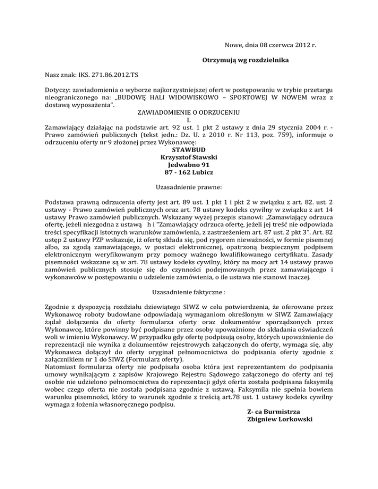 Nowe, dnia 08 czerwca 2012 r. Otrzymują wg rozdzielnika Nasz znak: IKS. 271.86.2012.TS Dotyczy: zawiadomienia o wyborze najkorzystniejszej ofert w postępowaniu w trybie przetargu nieograniczonego na: „BUDOWĘ HALI WIDOWISKOWO – SPORTOWEJ W NOWEM wraz z dostawą wyposażenia”. ZAWIADOMIENIE O ODRZUCENIU I. Zamawiający działając na podstawie art. 92 ust. 1 pkt 2 ustawy z dnia 29 stycznia 2004 r. Prawo zamówień publicznych (tekst jedn.: Dz. U. z 2010 r. Nr 113, poz. 759), informuje o odrzuceniu oferty nr 9 złożonej przez Wykonawcę: STAWBUD Krzysztof Stawski Jedwabno 91 87 - 162 Lubicz Uzasadnienie prawne: Podstawa prawną odrzucenia oferty jest art. 89 ust. 1 pkt 1 i pkt 2 w związku z art. 82. ust. 2 ustawy - Prawo zamówień publicznych oraz art. 78 ustawy kodeks cywilny w związku z art 14 ustawy Prawo zamówień publicznych. Wskazany wyżej przepis stanowi: „Zamawiający odrzuca ofertę, jeżeli niezgodna z ustawą h i "Zamawiający odrzuca ofertę, jeżeli jej treść nie odpowiada treści specyfikacji istotnych warunków zamówienia, z zastrzeżeniem art. 87 ust. 2 pkt 3". Art. 82 ustęp 2 ustawy PZP wskazuje, iż ofertę składa się, pod rygorem nieważności, w formie pisemnej albo, za zgodą zamawiającego, w postaci elektronicznej, opatrzoną bezpiecznym podpisem elektronicznym weryfikowanym przy pomocy ważnego kwalifikowanego certyfikatu. Zasady pisemności wskazane są w art. 78 ustawy kodeks cywilny, który na mocy art 14 ustawy prawo zamówień publicznych stosuje się do czynności podejmowanych przez zamawiającego i wykonawców w postępowaniu o udzielenie zamówienia, o ile ustawa nie stanowi inaczej. Uzasadnienie faktyczne : Zgodnie z dyspozycją rozdziału dziewiątego SIWZ w celu potwierdzenia, że oferowane przez Wykonawcę roboty budowlane odpowiadają wymaganiom określonym w SIWZ Zamawiający żądał dołączenia do oferty formularza oferty oraz dokumentów sporządzonych przez Wykonawcę, które powinny być podpisane przez osoby upoważnione do składania oświadczeń woli w imieniu Wykonawcy. W przypadku gdy ofertę podpisują osoby, których upoważnienie do reprezentacji nie wynika z dokumentów rejestrowych załączonych do oferty, wymaga się, aby Wykonawca dołączył do oferty oryginał pełnomocnictwa do podpisania oferty zgodnie z załącznikiem nr 1 do SIWZ (Formularz oferty). Natomiast formularza oferty nie podpisała osoba która jest reprezentantem do podpisania umowy wynikającym z zapisów Krajowego Rejestru Sądowego załączonego do oferty ani tej osobie nie udzielono pełnomocnictwa do reprezentacji gdyż oferta została podpisana faksymilą wobec czego oferta nie została podpisana zgodnie z ustawą. Faksymila nie spełnia bowiem warunku pisemności, który to warunek zgodnie z treścią art.78 ust. 1 ustawy kodeks cywilny wymaga z łożenia własnoręcznego podpisu. Z- ca Burmistrza Zbigniew Lorkowski Otrzymują wg rozdzielnika za potwierdzeniem odbioru: 1. STAWBUD Krzysztof Stawski, Jedwabno 91, 87 - 162 Lubicz 2. www.bip.gminanowe.plwww.bip.gminanowe.pl, 3. Tablica ogłoszeń w miejscu Urzędu Gminy w Nowem, 4. a/a TS.
