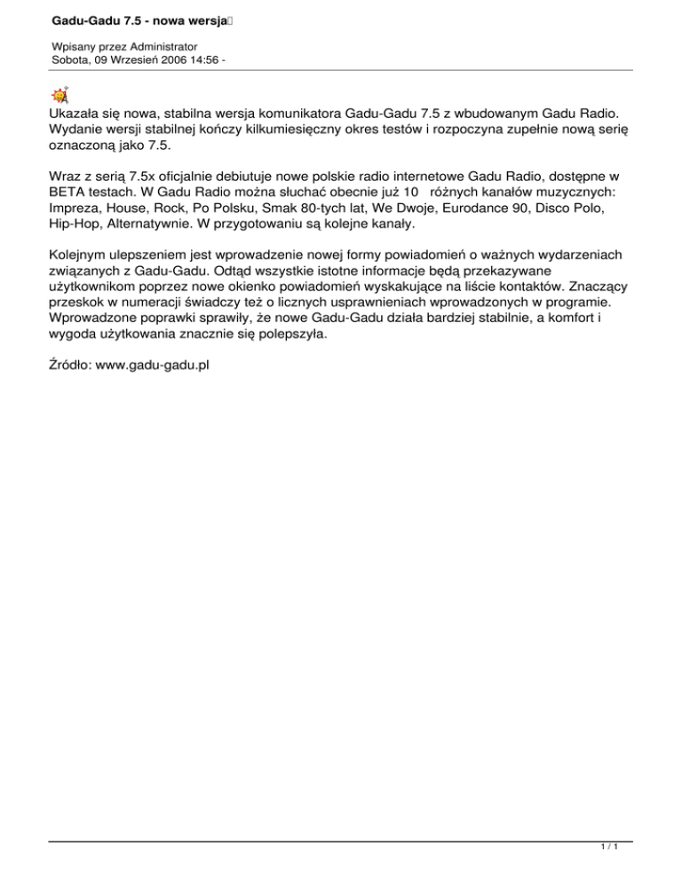 Gadu-Gadu 7.5 - nowa wersja Wpisany przez Administrator Sobota, 09 Wrzesień 2006 14:56 - Ukazała się nowa, stabilna wersja komunikatora Gadu-Gadu 7.5 z wbudowanym Gadu Radio. Wydanie wersji stabilnej kończy kilkumiesięczny okres testów i rozpoczyna zupełnie nową serię oznaczoną jako 7.5. Wraz z serią 7.5x oficjalnie debiutuje nowe polskie radio internetowe Gadu Radio, dostępne w BETA testach. W Gadu Radio można słuchać obecnie już 10 różnych kanałów muzycznych: Impreza, House, Rock, Po Polsku, Smak 80-tych lat, We Dwoje, Eurodance 90, Disco Polo, Hip-Hop, Alternatywnie. W przygotowaniu są kolejne kanały. Kolejnym ulepszeniem jest wprowadzenie nowej formy powiadomień o ważnych wydarzeniach związanych z Gadu-Gadu. Odtąd wszystkie istotne informacje będą przekazywane użytkownikom poprzez nowe okienko powiadomień wyskakujące na liście kontaktów. Znaczący przeskok w numeracji świadczy też o licznych usprawnieniach wprowadzonych w programie. Wprowadzone poprawki sprawiły, że nowe Gadu-Gadu działa bardziej stabilnie, a komfort i wygoda użytkowania znacznie się polepszyła. Źródło: www.gadu-gadu.pl 1/1