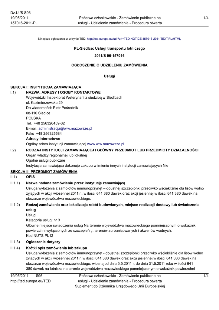 Dz.U./S S96 19/05/2011 157016-2011-PL Państwa członkowskie - Zamówienie publiczne na usługi - Udzielenie zamówienia - Procedura otwarta 1/4 Niniejsze ogłoszenie w witrynie TED: http://ted.europa.eu/udl?uri=TED:NOTICE:157016-2011:TEXT:PL:HTML PL-Siedlce: Usługi transportu lotniczego 2011/S 96-157016 OGŁOSZENIE O UDZIELENIU ZAMÓWIENIA Usługi SEKCJA I: INSTYTUCJA ZAMAWIAJĄCA I.1) NAZWA, ADRESY I OSOBY KONTAKTOWE Wojewódzki Inspektorat Weterynarii z siedzibą w Siedlcach ul. Kazimierzowska 29 Do wiadomości: Piotr Pośrednik 08-110 Siedlce POLSKA Tel. +48 256326459-32 E-mail: [email protected] Faks +48 256325584 Adresy internetowe Ogólny adres instytucji zamawiającej www.wiw.mazowsze.pl I.2) RODZAJ INSTYTUCJI ZAMAWIAJĄCEJ I GŁÓWNY PRZEDMIOT LUB PRZEDMIOTY DZIAŁALNOŚCI Organ władzy regionalnej lub lokalnej Ogólne usługi publiczne Instytucja zamawiająca dokonuje zakupu w imieniu innych instytucji zamawiających Nie SEKCJA II: PRZEDMIOT ZAMÓWIENIA II.1) OPIS II.1.1) Nazwa nadana zamówieniu przez instytucję zamawiającą Usługa wyłożenia z samolotów immunoprzynęt – doustnej szczepionki przeciwko wściekliźnie dla lisów wolno żyjących w akcji wiosennej 2011 r., w ilości 641 380 dawek oraz akcji jesiennej w ilości 641 380 dawek na obszarze województwa mazowieckiego. II.1.2) Rodzaj zamówienia oraz lokalizacja robót budowlanych, miejsce realizacji dostawy lub świadczenia usług Usługi Kategoria usług: nr 3 Główne miejsce świadczenia usług Na terenie województwa mazowieckiego pomniejszonym o wskaźnik powierzchni wyłączonych ze szczepień tj. terenów zurbanizowanych i akwenów wodnych. Kod NUTS PL12 II.1.3) Ogłoszenie dotyczy II.1.4) Krótki opis zamówienia lub zakupu Usługa wyłożenia z samolotów immunoprzynęt - doustnej szczepionki przeciwko wściekliźnie dla lisów wolno żyjących w akcji wiosennej 2011 r. w ilości 641 380 dawek oraz akcji jesiennej w ilości 641 380 dawek na obszarze województwa mazowieckiego: wiosną od dnia 5.5.2011 r. do dnia 31.5.2011 roku w ilości 641 380 dawek na lotniska na terenie województwa mazowieckiego pomniejszonym o wskaźnik powierzchni 19/05/2011 S96 http://ted.europa.eu/TED Państwa członkowskie - Zamówienie publiczne na usługi - Udzielenie zamówienia - Procedura otwarta Suplement do Dziennika Urzędowego Unii Europejskiej 1/4 Dz.U./S S96 19/05/2011 157016-2011-PL Państwa członkowskie - Zamówienie publiczne na usługi - Udzielenie zamówienia - Procedura otwarta 2/4 wyłączonych ze szczepień tj. terenów zurbanizowanych i akwenów wodnych oraz jesienią od dnia 5.9.2011 r. do dnia 30.9.2011 r. w ilości 641 380 dawek na lotniska województwa mazowieckiego pomniejszonym o wskaźnik powierzchni wyłączonych ze szczepień tj. terenów zurbanizowanych i akwenów wodnych. Zamawiający wymaga aby wykonawca był zdolny do prowadzenia usług lotniczych, innych niż zarobkowy przewóz lotniczy w zakresie lotów usługowych (AW-7). Zamawiający wymaga aby usługa wykonywana była zgodnie z zasadami sztuki lotniczej, przy zapewnieniu precyzyjnego wykładania szczepionki poprzez dostosowanie tras, prędkości i wysokości planowanych lotów do potrzeb należytego wykonania zadania. Szczepieniem zostanie objętych 32.069 km2 powierzchni województwa, co przy wyłożeniu 641 380 dawek szczepionek w jednej akcji ma zapewnić średnią częstotliwość wykładania 20 dawek na km2 powierzchni. Wykładanie szczepionki odbędzie się wiosną i jesienią każdorazowo na obszarze 32 069 km2 na terenie województwa mazowieckiego. Wykładanie szczepionki przeciwko wściekliźnie lisów nie powinno trwać dłużej niż 4 dni. Wykonawca musi zapewnić bazy lotnicze zapewniające w miarę potrzeb obsługę lotną samolotów. Wykonanie przedmiotu zamówienia odbędzie się z lotnisk/lądowisk bazowych lub operacyjnych na terenie województwa mazowieckiego w miejscach i terminach i w sposób ustalony z Zamawiającym. Wykładanie szczepionki będzie wykonywane w liniach równoległych w odstępach co 1 kilometr. Usługa wyłożenia szczepionki zostanie rozpoczęta w momencie uzyskania przez zamawiającego wyników badania miana potwierdzających właściwą jakość szczepionki. Zamawiający wymaga aby loty odbywały się po linach równoległych. Odległość między liniami przelotu nad obszarem województwa mazowieckiego powinna wynosić 1 km. Jako linia, od której obliczane są trasy należy przyjąć szerokość geograficzną 50°, co zapewni, iż linie przelotów w poszczególnych województwach będą się stykać ze sobą. Zamawiający wymaga aby wykonawca załatwił wszelkie formalności związane z wykonywaniem usługi w tym: uzyskanie zezwoleń niezbędnych do wykonania usługi, zapewnienie obsługi akcji w zakresie METEO o raz w zakresie operacyjnego ruchu lotniczego, wyznaczenia koordynatora akcji z ośrodkami koordynacji ruchu lotniczego. Zamawiający wymaga aby Wykonawca posiadał ubezpieczenie OC od prowadzonej działalności gospodarczej oraz pełne ubezpieczenie osób uczestniczących w wykonaniu usługi. Zamawiający wymaga aby Wykonawca wyposażył pilotów oraz obsługę zrzutu w odzież ochronną. Zamawiający wymaga aby wykonawca zapewnił pilotów wchodzących w skład załóg, którzy będą odpowiedzialni za nadzór nad wykonywaniem lotów zgodnie ze zgodami ruchowymi oraz programem wykładania szczepionki. Zamawiający wymaga aby wykonawca sporządził zbiorczą dokumentację lotniczą z wykonania każdej akcji (wiosna, jesień) obejmującej: szczegółowe sprawozdanie z realizacji nawigacyjnego planu lotów, szczegółowe sprawozdanie z realizacji planu wyłożenia szczepionki, wydruk z odbiornika GPS potwierdzający rzeczywiste trasy wykonanych lotów, wydruk z rejestratora zrzutu szczepionki potwierdzający ilość i miejsce zrzuconej szczepionki na poszczególnych trasach. II.1.5) Wspólny Słownik Zamówień (CPV) 60400000 II.1.6) Zamówienie jest objęte Porozumieniem w sprawie zamów