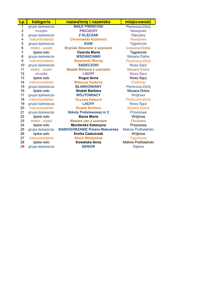 Lp. kategoria nazwa/imię i nazwisko miejscowość 1 2 3 4 5 6 7 8 9 10 11 12 13 14 15 16 17 18 19 20 21 22 23 24 25 26 27 28 29 grupa śpiewacza muzyka grupa śpiewacza instrumentalista grupa śpiewacza mistrz - uczeń śpiew solo grupa śpiewacza instrumentalista grupa śpiewacza mistrz - uczeń muzyka śpiew solo instrumentalista grupa śpiewacza śpiew solo grupa śpiewacza instrumentalista grupa śpiewacza instrumentalista grupa śpiewacza śpiew solo mistrz - uczeń śpiew solo grupa śpiewacza śpiew solo instrumentalista śpiew solo grupa śpiewacza MAŁE PIWNICOKI PIECUCHY Z KLĘCZAN Chronowski Kazimierz KGW Bryniak Sławomir z uczniami Osierda Maria MSZANICANKI Stawiarski Maciej SĄDECZOKI Stożek Barbara z uczniami LACHY Kogut Anna Mateusz Gadzina BŁANKOWIANY Stożek Barbara WÓJTOWIACY Grucela Edward LACHY Stożek Barbara Szkoły Podstawowej nr 2 Bania Maria Nawara Jan z uczniem Mordarska Katarzyna BABIOGÓRZANIE Polana Makowska Emilia Czeluśniak Stach Władysław Kowalska Anna SENIOR Piwniczna-Zdrój Nawojowa Klęczany Nawojowa Tęgoborze Łososina Dolna Tęgoborze Mszana Dolna Piwniczna-Zdrój Nowy Sącz Mszana Dolna Nowy Sącz Nowy Sącz Chełmiec Piwniczna-Zdrój Mszana Dolna Wójtowa Piwniczna-Zdrój Nowy Sącz Mszana Dolna Przyszowa Wójtowa Olszówka Przyszowa Maków Podhalański Wójtowa Tęgoborze Maków Podhalański Dębica