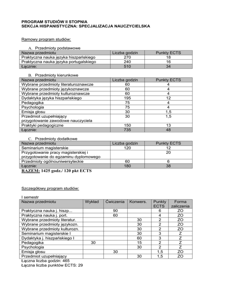 PROGRAM STUDIÓW II STOPNIA SEKCJA HISPANISTYCZNA: SPECJALIZACJA NAUCZYCIELSKA Ramowy program studiów: A. Przedmioty podstawowe Nazwa przedmiotu Praktyczna nauka języka hiszpańskiego Praktyczna nauka języka portugalskiego Łącznie: B. Przedmioty kierunkowe Nazwa przedmiotu Wybrane przedmioty literaturoznawcze Wybrane przedmioty językoznawcze Wybrane przedmioty kulturoznawcze Dydaktyka języka hiszpańskiego Pedagogika Psychologia Emisja głosu Przedmiot uzupełniający przygotowanie zawodowe nauczyciela Praktyki pedagogiczne Łącznie: C. Przedmioty dodatkowe Nazwa przedmiotu Seminarium magisterskie Przygotowanie pracy magisterskiej i przygotowanie do egzaminu dyplomowego Przedmioty ogólnouniwersyteckie Łącznie: Liczba godzin 270 240 510 Punkty ECTS 18 16 34 Liczba godzin 60 60 60 195 75 75 30 30 Punkty ECTS 4 4 4 12 4 4 1,5 1,5 150 735 13 48 Liczba godzin 120 60 180 Punkty ECTS 12 20 6 38 RAZEM: 1425 godz./ 120 pkt ECTS Szczegółowy program studiów: I semestr Nazwa przedmiotu Praktyczna nauka j. hiszp... Praktyczna nauka j. port. Wybrane przedmioty literatur. Wybrane przedmioty językozn. Wybrane przedmioty kulturozn. Seminarium magisterskie I Dydaktyka j. hiszpańskiego I Pedagogika Psychologia Emisja głosu Przedmiot uzupełniający Łączna liczba godzin: 465 Łączna liczba punktów ECTS: 29 Wykład Ćwiczenia Konwers. 90 60 30 30 30 30 60 15 30 30 30 30 Punkty ECTS 6 4 2 2 2 3 3 2 2 1,5 1,5 Forma zaliczenia ZO ZO ZO ZO ZO Z Z Z Z ZO ZO II semestr Nazwa przedmiotu Wykład Praktyczna nauka j. hiszp. Praktyczna nauka j. port. Wybrane przedmioty literatur. Wybrane przedmioty językozn. Wybrane przedmioty kulturozn. Seminarium magisterskie I Dydaktyka j. hiszpańskiego I Pedagogika Psychologia Praktyki pedagogiczne Łączna liczba godzin: 465 Łączna liczba punktów ECTS: 31 III semestr Nazwa przedmiotu Konwers. 90 60 30 30 30 30 60 30 45 60 Wykład Ćwiczenia Praktyczna nauka j. hiszp. Praktyczna nauka j. port. Seminarium magisterskie II Dydaktyka j. hiszpańskiego II Praktyki pedagogiczne Przedmioty ogólnouniwersyteckie Łączna liczba godzin: 345 Łączna liczba punktów ECTS: 27 IV semestr Nazwa przedmiotu Ćwiczenia Konwers. 90 60 30 45 60 60 Wykład Praktyczna nauka j. port. Seminarium magisterskie II Dydaktyka j. hiszpańskiego II Praktyki pedagogiczne Przygotowanie pracy magisterskiej i przygotowanie do egzaminu dyplomowego Łączna liczba godzin: 150 Łączna liczba punktów ECTS: 33 Ćwiczenia Konwers. 60 30 30 30 Punkty ECTS 6 4 2 2 2 3 3 2 2 5 Forma zaliczenia E ZO ZO ZO ZO Z E E E ZO Punkty ECTS 6 4 3 3 5 6 Forma zaliczenia E ZO Z ZO ZO ZO Punkty ECTS 4 3 3 3 20 Forma zaliczenia E ZO E ZO RAZEM: 1425 godz./ 120 pkt ECTS UWAGA: Ponadto, zgodnie z Rozporządzeniem Ministra Edukacji Narodowej, student musi uzyskać uprawnienia do nauczania drugiego przedmiotu. Uzyskanie tych uprawnień odbywa się w następujący sposób: • albo niezależnie od studiów w Instytucie Studiów Iberyjskich i Iberoamerykańskich student odbywa studia na innym kierunku dające uprawnienia nauczycielskie i przedstawia dokumentację tych studiów dyrektorowi ISIiI • albo w ramach studiów I lub II stopnia w Instytucie Studiów Iberyjskich i Iberoamerykańskich student uzyska uprawnienia do nauczania drugiego języka poprzez zaliczenie 240 godzin nauki drugiego języka obcego na poziomie C2, 30 godzin praktyk pedagogicznych w zakresie drugiego języka. Należy przy tym pamiętać, że nauka języka portugalskiego objęta planem studiów II stopnia odbywa się tylko do poziomu B2.