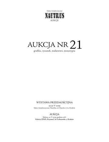 Salon Antykwaryczny AUKCJE AUKCJA NR 21 grafika, rysunek, malarstwo, monotypia WYSTAWA PRZEDAUKCYJNA 25-30 V 2009 Salon Antykwaryczny Nautilus, ul. Pijarska 5/2a, Kraków AUKCJA Sobota, 30 V 2009, godzina 1200 Galeria ZPAP „Pryzmat”, ul. Łobzowska 3, Kraków Salon Antykwaryczny Michał Maksymiuk, Maciej Żywolewski ul. Pijarska 5/2a 31-015 Kraków tel.: + 48 12 422 91 60 fax: + 48 12 432 94 40 kom.: 095899895 e-mail: [email protected] www.antique.com.pl; www.artlist.pl BANK PEKAO S.A. III O/ KRAKÓW Nr konta: 46124022941111000037089120 OPRACOWANIE KATALOGU: Michał Maksymiuk, Roman Marcinek, Maciej Żywolewski SKŁAD, ZDJĘCIA: Maciej Żywolewski Okładka: fragment poz. 74 - Visscher Claes Janszoon (1587–1652), Wygnanie z raju, XVII w. COPYRIGHT: © Nautilus Salon Antykwaryczny 2009 poz. 181 Zawartość katalogu: I. II. III. IV. V. VI. VII. Monotypia Malarstwo, rysunek Grafika dawna Grafika przed 1945 Grafika po 1945 Biogramy - indeks Regulamin poz. 1-13 poz. 14-44 poz. 45-74 poz. 75-176 poz. 177-248 s. 61 s. 69 Reprodukcje wszystkich prac można zobaczyć na stronie internetowej www.artlist.pl Monotypia poz. 1 poz. 2 Kantor tadeusz (1915–1990) 001. Kompozycja abstrakcyjna, 1950 Monotypia; wym.: 30 x 43 cm; sygn. p.d.: T. Kantor; l.d.: 1950. cena wyw.: 5200 stern Jonasz (1904–1988) 002. Kompozycja, ok. 1950 Monotypia; wym.: 33,8 x 26,8 cm; nie sygn.; na odwrocie potwierdzenie autentyczności przez Barbarę Jaroszyńską-Stern, żonę artysty. cena wyw.: 2600 003. Kompozycja, połowa lat 50. Monotypia; wym.: 33,5 x 26,5 cm; sygn. oł. l.d.: J. Stern; p.d.: Monotypia; poniżej napis oł.: „Życie [Literackie]” 8 ½ x 11 cm (ilustracja ukazała się w 1958, wraz z opowiadaniem K. Filipowicza); załączona ekspertyza. Stan: pionowy ślad złożenia. cena wyw.: 4200 004. Kompozycja, ok. 1950 Monotypia; wym.: 21 x 29,5 cm; nie sygn.; na odwrocie potwierdzenie autentyczności przez Barbarę Jaroszyńską-Stern, żonę artysty. cena wyw.: 2350 poz. 3 | Malarstwo | Akwarela, rysunek | Grafika | Monotypia | Biogramy | Indeks | poz. 4 |5 Aukcja nr 21 poz. 5 poz. 5 poz. 7 poz. 8 poz. 6 6| 005. Zakonnica Monotypia; wym.: 30 x 21 cm; sygn. p.d.: Dawski; l.d. tytuł. cena wyw.: 900 006. Akt kobiecy Monotypia; wym.: 30 x 20 cm; sygn. p.d.: Dawski. cena wyw.: 900 poz. 9 007. Akt kobiecy Monotypia; wym.: 28 x 20 cm; sygn. śr.d.: Dawski. cena wyw.: 900 | Malarstwo | Akwarela, rysunek | Grafika | Monotypia | Biogramy | Indeks | Dawski stanisław (1905–1990) kraupe-ŚwiDerska Janina (ur. 1921) 008. Szermierze, 1952 Monotypia; wym.: 33 x 40 cm; sygn. oł. p.d.: J. Kraupe 1952; l.d. tytuł. cena wyw.: 2000 Marczyński aDaM (1908–1985) 009. Bez tytułu, przełom lat 50. i 60. Monotypia barwna; wym.: 58 x 46,5 cm; sygn. p.d.: Marczyński. cena wyw.: 4000 kunz włoDziMierz (1926–2002) 010. Ptaki, 1958 Monotypia; wym.: 39 x 50 cm; sygn. p.d.: W. Kunz, l.d. datowanie. cena wyw.: 2150 poz. 10 |7 Aukcja nr 21 poz. 13 kraupe-ŚwiDerska Janina (ur. 1921) 011. Wisznu, 1958 Monotypia; wym.: 53 x 35 cm; sygn. p.d.: J. Kraupe 1958. cena wyw.: 2500 012. Z cyklu „Niobe”, 1957 Monotypia barwna; wym.: 34,8 x 41 cm; sygn. p.d.: J. Kraupe 1957; l.d. tytuł. Lit.: Janina Kraupe. Grafiki i monotypie, Kraków 1997, poz. 61. cena wyw.: 1420 kunz włoDziMierz (1926–2002) poz. 11 013. Ptak, 1958 Monotypia; wym.: 39 x 50 cm; sygn. p.d.: W. Kunz, l.d. datowanie. cena wyw.: 2150 poz. 12 8| Malarstwo, rysunek poz. 15 | Malarstwo | Akwarela, rysunek | Grafika | Monotypia | Biogramy | Indeks | poz. 14 Lenica aLfred (1899–1977) 014. Kompozycja, lata 50. Gwasz, papier; wym.: 21 x 26,5 cm; sygn. p.d.: Lenica. cena wyw.: 2500 taranczewsKi wacław (1903–1987) 015. Mała malarka, lata 30./40. XX w. Technika mieszana (kredka, gwasz, akwarela), papier; wym.: 37 x 23 cm; nie sygn.; na odwrocie szkic ołówkiem. cena wyw.: 4500 |9 Aukcja nr 21 poz. 16 Beksiński zDzisław (1929–2005) 016. Bez tytułu, 1992 Olej, płyta; wym.: 72 x 61 cm; sygn. na odwrocie: Beksiński 1992. cena wyw.: 30000 10 | | Malarstwo | Akwarela, rysunek | Grafika | Monotypia | Biogramy | Indeks | poz. 17 BroLL urszuLa (ur. 1930) 017. Kompozycja z cyklu „Alikwoty”, 1962 Olej, płótno; wym.: 100 x 85 cm; nie sygn. Potwierdzenie autentyczności wystawione przez Urszulę Broll cena wyw.: 12500 | 11 Aukcja nr 21 poz. 18 poz. 19 starowieysKi franciszeK (1930–2009) 018. Kompozycja Olej, papier naklejony na płótno; wym.: 162 x 98 cm; sygn. monogramem wiązanym w obrębie kompozycji. cena wyw.: 15000 kowalewski paweł (ur. 1958) 019. Intymność Olej, płyta; wym.: 107 x 78 cm; sygn. p.d.: Z. Kowalewski; na odwrocie: Intymność, Z. Kowalewski. cena wyw.: 5000 12 | MiKuLsKi KaziMierz (1918–1998) wóJtowicz stanisław (1920–1991) 021. Portret kobiety, lata 50. XX w. Olej na płótnie; wym.: 98 x 78,5 cm; sygn. l.d.: S. Wójtowicz. cena wyw.: 10000 poz. 20 | Malarstwo | Akwarela, rysunek | Grafika | Monotypia | Biogramy | Indeks | 020. Portret kobiecy z aktem, 1961 Collage (akwarela, tusz, fotografia, kamień) na papierze i tekturze; wym.: 23 x 18 cm; sygn. p.g.: KM61. Na odwrocie naklejka Galerii Lambert w Paryżu oraz zezwolenie Wydziału Kultury Powiatowej Rady Narodowej m. Krakowa (z 5 X 1961) na wywóz dzieła za granicę. cena wyw.: 38 000 poz. 21 | 13 Aukcja nr 21 poz. 22 wanieK eugeniusz (1906-2009) paMuła Jan (ur. 1944) 022. Płonąca paleta, 1970 Olej, płótno; wym.: 100 x 69 cm; sygn. l.d.: E. Waniek 70; na odwrocie: Eug. Waniek, Płonąca paleta 1970. cena wyw.: 9000 023. Bez tytułu, 2000 Olej, płótno; wym.: 54 x 54 mm; sygn. p.d.: Pamuła 2000; na odwrocie: Jan Pamuła 4/2000. cena wyw.: 3500 MaKowsKi zBigniew (ur. 1930) 024. Bez tytułu Tusz, papier; wym.: 21 x 28 cm; sygn. na odwrocie: Zbigniew Makowski. cena wyw.: 5000 14 | | Malarstwo | Akwarela, rysunek | Grafika | Monotypia | Biogramy | Indeks | poz. 23 poz. 24 | 15 Aukcja nr 21 poz. 25 taranczewsKi wacław (1903–1987) 025. Autoportret, 1943 Pastel, karton; wym.: 97 