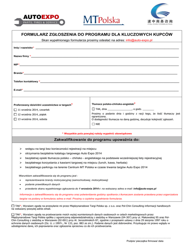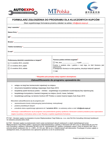 FORMULARZ ZGŁOSZENIA DO PROGRAMU DLA KLUCZOWYCH KUPCÓW Skan wypełnionego formularza prosimy odesłać na adres: [email protected] Imię i nazwisko* ___________________________________________________________________________________________________ Nazwa firmy *______________________________________________________________________________________________________ NIP*______________________________________________________________________________________________________________ Branża*__________________________________________________________________________________________________________ Telefon kontaktowy *________________________________________________________________________________________________ E-mail* ___________________________________________________________________________________________________________ Preferowany dzień/dni uczestnictwa w targach* Tłumacz polsko-chińsko-angielski* TAK, dnia _________________, o godz. ________ 11 września 2014, czwartek Prosimy o podanie dnia i godziny z racji tego, że ilość tłumaczy jest ograniczona. O dostępności tłumacza na daną godzinę, decyduje kolejność zgłoszeń. 12 września 2014, piątek 13 września 2014, sobota NIE * Wszystkie pola powyżej należy wypełnić obowiązkowo Zakwalifikowanie do programu upoważnia do: wstępu na targi bez konieczności rejestracji na miejscu otrzymania bezpłatnie katalogu targowego Auto Expo 2014 bezpłatnej opieki tłumacza polsko – chińsko - angielskiego na podstawie wcześniejszej listy rejestracyjnej bezpłatnego korzystania z kawiarni targowej na miejscu (lunch, kawa, herbata) bezpłatnego parkingu na terenie Centrum MT Polska w czasie trwania targów Auto Expo 2014 Warunkiem zakwalifikowania się do programu jest : reprezentowanie branży motoryzacyjnej (samochodowej, motocyklowej) podanie prawidłowych danych przesłanie skanu wypełnionego zgłoszenia do 1 września 2014 r. na wskazany adres e-mail: [email protected] Informacja o zakwalifikowaniu się do programu oraz potwierdzenie godziny spotkania z tłumaczem zostanie przesłana przez organizatora targów na podany w formularzu adres e-mail. Prosimy o czytelne wypełnienie formularza. TAK*, Wyrażam zgodę na przesyłanie mi przez Międzynarodowe Targi Polska sp. z o.o. oraz Pol-Chin Consulting informacji handlowych na wskazany powyżej adres email. TAK*, Wyrażam zgodę na przetwarzanie moich wyżej wymienionych danych osobowych w celach marketingowych przez Międzynarodowe Targi Polska spółka z ograniczoną odpowiedzialnością z siedzibą w Warszawie (04-307) przy ul. Makowskiej 95 oraz PolChin Consulting z siedzibą w Warszawie (02-001) przy Al. Jerozolimskich 87, zgodnie z przepisami ustawy z dnia 29 sierpnia 1997 roku o ochronie danych osobowych (Dz. U. z 1997r., Nr 133, poz. 883 ze zm.). Podanie danych jest dobrowolne. Przysługuje mi prawo wglądu w udostępnione dane, ich poprawiania oraz zgłoszenia sprzeciwu co do ich przetwarzania. ……………………………………….. Podpis/ pieczątka firmowa/ data