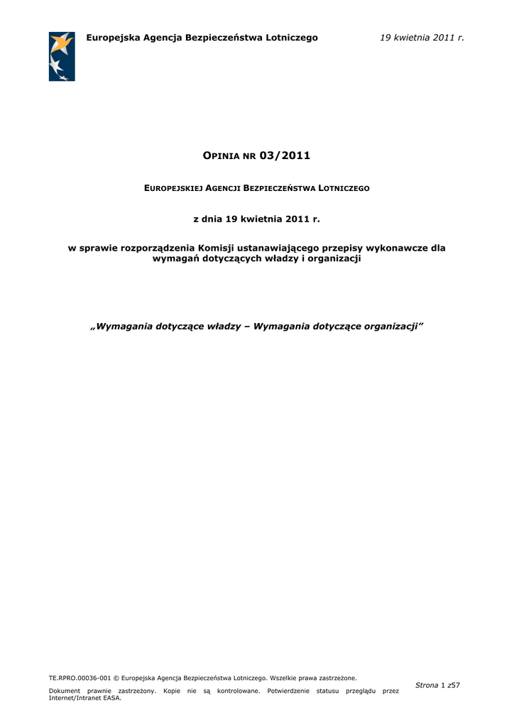 Europejska Agencja Bezpieczeństwa Lotniczego 19 kwietnia 2011 r. OPINIA NR 03/2011 EUROPEJSKIEJ AGENCJI BEZPIECZEŃSTWA LOTNICZEGO z dnia 19 kwietnia 2011 r. w sprawie rozporządzenia Komisji ustanawiającego przepisy wykonawcze dla wymagań dotyczących władzy i organizacji „Wymagania dotyczące władzy – Wymagania dotyczące organizacji” TE.RPRO.00036-001 © Europejska Agencja Bezpieczeństwa Lotniczego. Wszelkie prawa zastrzeżone. Dokument prawnie zastrzeżony. Internet/Intranet EASA. Kopie nie są kontrolowane. Potwierdzenie statusu przeglądu przez Strona 1 z57 Opinia nr 03/2011 19 kwietnia 2011 r. Spis treści I. Streszczenie........................................................................................................ 3 II. Informacje ogólne................................................................................................ 5 III. Konsultacje ......................................................................................................... 6 IV. Cel opinii Agencji ................................................................................................. 7 V. Zakres i struktura opinii Agencji ........................................................................... 10 VI. Memorandum wyjaśniające – część AR.................................................................. 13 Informacje ogólne .............................................................................................. 13 Konsultacje ....................................................................................................... 13 Zakres i stosowalność ......................................................................................... 15 Rozporządzenie ramowe – elementy mające znaczenie dla części AR ......................... 18 Część AR, podczęść GEN, sekcja I – Informacje ogólne ............................................ 19 Część AR, podczęść GEN, sekcja II – Zarządzanie ................................................... 21 Część AR, podczęść GEN, sekcja III – Nadzór, certyfikacja i egzekwowanie przepisów .. 23 Część AR, podczęść FCL ...................................................................................... 27 Część AR, podczęść CC........................................................................................ 29 Część AR, podczęść ATO...................................................................................... 30 Część AR, podczęść FSTD .................................................................................... 32 Część AR, podczęść AeMC i MED ........................................................................... 33 VII. Memorandum wyjaśniające – część OR ................................................................. 35 Informacje ogólne .............................................................................................. 35 Konsultacje ....................................................................................................... 35 Zakres i stosowalność ......................................................................................... 37 Rozporządzenie ramowe – elementy mające znaczenie dla części OR ......................... 37 Definicje odnoszące się do części OR ..................................................................... 38 Część OR, podczęść GEN, sekcja I – Informacje ogólne............................................ 39 Część OR, podczęść GEN, sekcja II – System zarządzania ........................................ 43 Część OR, podczęść ATO ..................................................................................... 46 Część OR, podczęść FSTD .................................................................................... 48 Część OR, podczęść AeMC ................................................................................... 49 ZAŁĄCZNIK I ..................................................................................................... 51 TE.RPRO.00036-001 © Europejska Agencja Bezpieczeństwa Lotniczego. Wszelkie prawa zastrzeżone. Dokument prawnie zastrzeżony. Internet/Intranet EASA. Kopie nie są kontrolowane. Potwierdzenie statusu przeglądu przez Strona 2 z57 Opinia nr 03/2011 I. 19 kwietnia 2011 r. Streszczenie W niniejszej opinii zaproponowano wymagania dotyczące kompetentnych władz i organizacji odnoszące się do personelu lotniczego lotnictwa cywilnego (załoga lotnicza i personel pokładowy). Wymagania te obejmują wymagania ogólne (podczęść GEN), które są wspólne dla personelu lotniczego i operacji lotniczych, oraz wymagania dotyczące konkretnych obszarów, takich jak licencjonowanie załogi lotniczej, wydawanie świadectw dopuszczenia do pracy personelu pokładowego, poświadczanie stanu zdrowia, zatwierdzone organizacje szkolenia, szkoleniowe urządzenia symulacji lotu 1 i centra medycyny lotniczej. Wymagania zaproponowane w niniejszej opinii uzupełniają wymagania techniczne określone w częściach FCL, MED i CC. Podczęści AR.ATO i AR.FCL opierają się na obowiązujących wymaganiach dotyczących władzy odnoszących się do organizacji szkoleniowych i licencjonowania załogi lotniczej, zawartych w JAR-FCL i w powiązanych wspólnych procedurach wykonawczych. Nowe przepisy zostały dodane odnośnie do monitorowania egzaminatorów. Podczęść OR.ATO opiera się na obowiązujących wymaganiach dla organizacji szkoleniowych, zawartych w załączniku 1 ICAO (załącznik 2) i JAR-FCL. Wszystkie organizacje szkoleniowe, w tym organizacje prowadzące szkolenia kwalifikujące do uzyskania wyłącznie licencji pilota lekkiego statku powietrznego, licencji pilota turystycznego, licencji pilota balonu lub licencji pilota szybowca, będą musiały posiadać certyfikat ATO. W podczęści AR.CC wdrożono przepisy określone w art. 8 ust. 4 i art. 8 ust. 5 lit. e) rozporządzenia podstawowego. Po