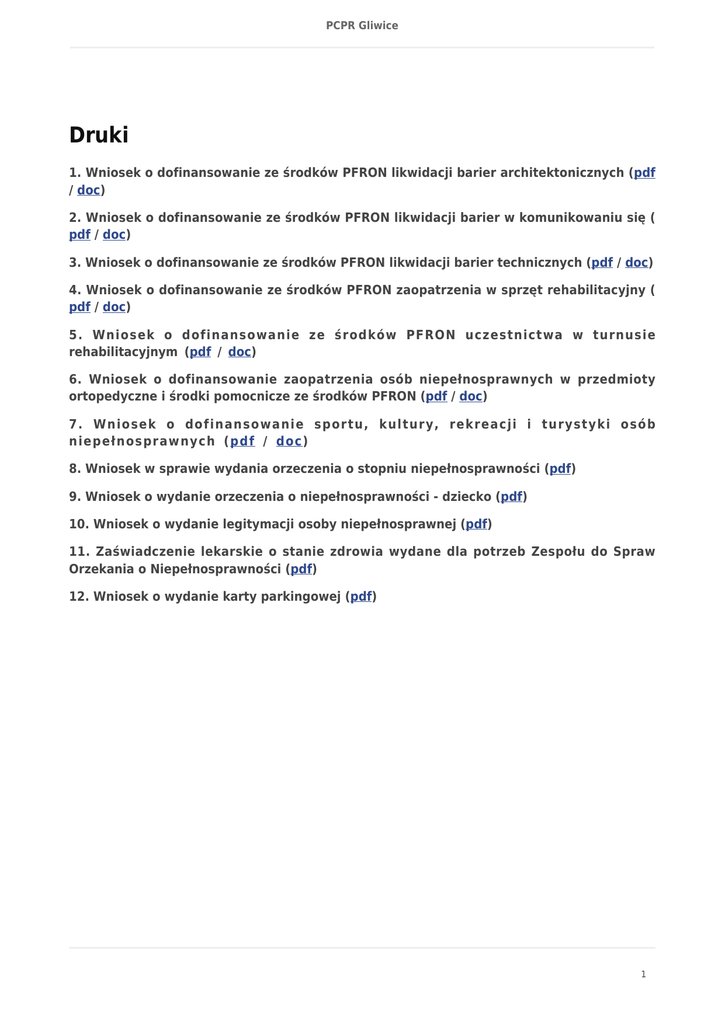 PCPR Gliwice Druki 1. Wniosek o dofinansowanie ze środków PFRON likwidacji barier architektonicznych (pdf / doc) 2. Wniosek o dofinansowanie ze środków PFRON likwidacji barier w komunikowaniu się ( pdf / doc) 3. Wniosek o dofinansowanie ze środków PFRON likwidacji barier technicznych (pdf / doc) 4. Wniosek o dofinansowanie ze środków PFRON zaopatrzenia w sprzęt rehabilitacyjny ( pdf / doc) 5. Wniosek o dofinansowanie ze środków PFRON uczestnictwa w turnusie rehabilitacyjnym (pdf / doc) 6. Wniosek o dofinansowanie zaopatrzenia osób niepełnosprawnych w przedmioty ortopedyczne i środki pomocnicze ze środków PFRON (pdf / doc) 7. Wniosek o dofinansowanie sportu, kultury, rekreacji i turystyki osób niepełnosprawnych (pdf / doc) 8. Wniosek w sprawie wydania orzeczenia o stopniu niepełnosprawności (pdf) 9. Wniosek o wydanie orzeczenia o niepełnosprawności - dziecko (pdf) 10. Wniosek o wydanie legitymacji osoby niepełnosprawnej (pdf) 11. Zaświadczenie lekarskie o stanie zdrowia wydane dla potrzeb Zespołu do Spraw Orzekania o Niepełnosprawności (pdf) 12. Wniosek o wydanie karty parkingowej (pdf) 1